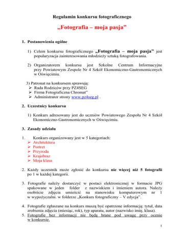 Regulamin konkursu fotograficznego „Fotografia – moja pasja” 1. Postanowienia ogólne 1) Celem konkursu fotograficznego „Fotografia – moja pasja” jest popularyzacja zainteresowania młodzieży sztuką fotografowania. 2) Organizatorem konkursu jest Szkolne Centrum Informacyjne przy Powiatowym Zespole Nr 4 Szkół Ekonomiczno-Gastronomicznych w Oświęcimiu. 3) Patronat na konkursem sprawują: Rada Rodziców przy PZ4SEG Firma Fotograficzna Chromat” Administrator strony www.pz4seg.pl . 2. Uczestnicy konkursu 1) Konkurs adresowany jest do uczniów Powiatowego Zespołu Nr 4 Szkół Ekonomiczno-Gastronomicznych w Oświęcimiu. 3. Zasady udziału 1. Konkurs organizowany jest w 5 kategoriach: Architektura Portret Przyroda Krajobraz Moja klasa 2. Każdy uczestnik może zgłosić do konkursu nie więcej niż 5 fotografii po 1 w każdej kategorii. 3. Fotografie należy dostarczyć w postaci elektronicznej w formacie JPG spakowane w jeden folder z nazwiskiem i imieniem autora. Należy osobiście zdjęcia umieścić na stanowisku komputerowym nr 1 w wypożyczalni. w folderze „Konkurs fotograficzny – V edycja”. 4. Fotografie zgłaszane na konkurs muszą być opatrzone informacją: tytuł, data zrobienia zdjęcia (miesiąc, rok), typ aparatu, autor (nazwisko imię, klasa). 5. Fotografie bez informacji nie będą brane pod uwagę przy ocenie w konkursie. 1 6. Organizator zastrzega sobie prawo do nieodpłatnego wykorzystania fotografii przesłanych na konkurs w publikacjach związanych z konkursem oraz w celach promocyjnych szkoły. 7. Uczestnik, zgłaszając fotografie do konkursu jednocześnie oświadcza, że: a) posiada pełnię praw autorskich do przesłanych fotografii i przenosi je na Organizatora konkursu w zakresie niezbędnym do ich publikacji i innych form rozpowszechniania; b) przenosi nieodpłatnie autorskie prawa majątkowe na rzecz Organizatora bez ograniczeń czasowych i terytorialnych, na polach eksploatacji wskazanych w art. 50 Ustawy o prawie autorskim i prawach pokrewnych z dnia 4 lutego 1994 r. (Dz. U. z dn. 23 lutego 1994 r)., w tym w szczególności w zakresie wykorzystywania techniką drukarską i cyfrową, wystawiania, udostępniania na stronach internetowych Organizatora oraz we wszelkich materiałach promocyjnych i reklamowych, bez względu na sposób ich zwielokrotniania i wprowadzania do obrotu; c) zdjęcia nie były wcześniej publikowane; d) wyraża zgodę na przetwarzanie i udostępnianie swoich danych osobowych w zakresie koniecznym do realizacji konkursu: imię, nazwisko, klasa, szkoła. 4. Czas trwania konkursu Fotografie należy dostarczyć w terminie 01.10.2012-30.11.2012. 5. Jury Przesłane prace oceniać będzie jury powołane przez Organizatora, które zadecyduje o przyznaniu nagród oraz wytypuje prace na wystawę. 6. Nagrody i wyróżnienia Przewiduje się przyznanie nagród rzeczowych za zajęcie I –III miejsca oraz wyróżnienia. Nagrody dodatkowe: Zdjęcia laureatów (I, II i III miejsca) zostaną wywołane przez Firmę Fotograficzną „Chromat” i umieszczone w witrynie punktu usługowego w Oświęcimiu ul. Mickiewicza 6, a następnie na wystawie szkolnej. 7. Rozstrzygnięcie konkursu 1) Rozstrzygnięcie konkursu nastąpi nie później niż 31.12. 2012 roku. 2 2) Laureaci zostaną powiadomieni o wynikach konkursu, terminie i miejscu wręczenia nagród. 3) Nagrodzone, wyróżnione oraz wybrane przez jury prace prezentowane będą na wystawie pokonkursowej oraz stronie internetowej szkoły. 8. Postanowienia końcowe 1) Szczegółowych informacji udziela opiekun konkursu prof. Marzena Sawicka. Organizator: Szkolne Centrum Informacyjne Powiatowy Zespół Nr 4 Szkół Ekonomiczno-Gastronomicznych ul. Obozowa 39 3