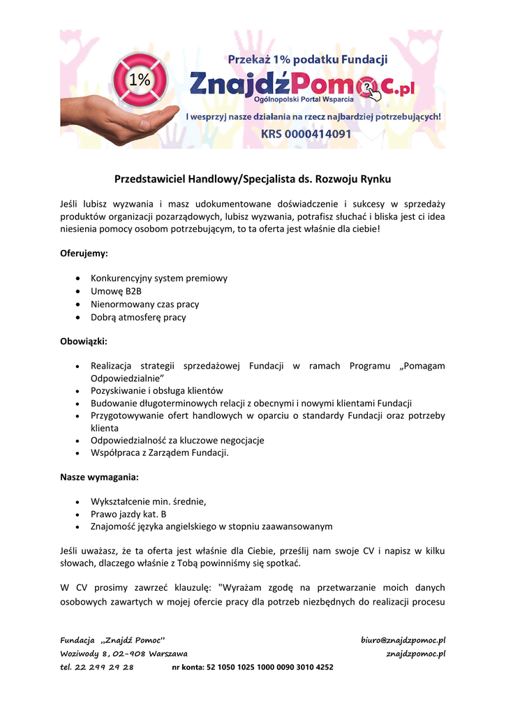Przedstawiciel Handlowy/Specjalista ds. Rozwoju Rynku Jeśli lubisz wyzwania i masz udokumentowane doświadczenie i sukcesy w sprzedaży produktów organizacji pozarządowych, lubisz wyzwania, potrafisz słuchać i bliska jest ci idea niesienia pomocy osobom potrzebującym, to ta oferta jest właśnie dla ciebie! Oferujemy: Konkurencyjny system premiowy Umowę B2B Nienormowany czas pracy Dobrą atmosferę pracy Obowiązki: Realizacja strategii sprzedażowej Fundacji w ramach Programu „Pomagam Odpowiedzialnie” Pozyskiwanie i obsługa klientów Budowanie długoterminowych relacji z obecnymi i nowymi klientami Fundacji Przygotowywanie ofert handlowych w oparciu o standardy Fundacji oraz potrzeby klienta Odpowiedzialność za kluczowe negocjacje Współpraca z Zarządem Fundacji. Nasze wymagania: Wykształcenie min. średnie, Prawo jazdy kat. B Znajomość języka angielskiego w stopniu zaawansowanym Jeśli uważasz, że ta oferta jest właśnie dla Ciebie, prześlij nam swoje CV i napisz w kilku słowach, dlaczego właśnie z Tobą powinniśmy się spotkać. W CV prosimy zawrzeć klauzulę: "Wyrażam zgodę na przetwarzanie moich danych osobowych zawartych w mojej ofercie pracy dla potrzeb niezbędnych do realizacji procesu Fundacja „Znajdź Pomoc” [email protected] Woziwody 8, 02-908 Warszawa tel. 22 299 29 28 nr konta: 52 1050 1025 1000 0090 3010 4252 znajdzpomoc.pl rekrutacji zgodnie z ustawą z dnia 29 sierpnia 1997 r. o ochronie danych osobowych (tj. Dz. U. z 2014 r. poz. 1182, 1662)." Fundacja „Znajdź Pomoc” [email protected] Woziwody 8, 02-908 Warszawa tel. 22 299 29 28 nr konta: 52 1050 1025 1000 0090 3010 4252 znajdzpomoc.pl