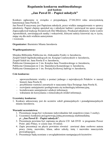 Regulamin konkursu multimedialnego pod hasłem: „Jan Paweł II – Papież młodych” Konkurs ogłaszamy w związku z przypadającą 27.04.2014 roku uroczystością kanonizacji Jana Pawła II. Jan Paweł II nazywany jest Papieżem młodych, przez wielkie zaangażowanie w sprawy młodzieży. Papież chętnie spotykał się z młodymi ludźmi i poświęcał im sporo uwagi. Zapoczątkował tradycję Światowych Dni Młodzieży. Przekazał młodzieży wiele Listów Apostolskich, zawierających naukę i wskazówki, którymi należy kierować się w życiu, stając się dla nich wielkim autorytetem i wzorcem. Organizator: Burmistrz Miasta Jarosławia Współorganizatorzy: Miejska Biblioteka Publiczna im. Aleksandra Fredry w Jarosławiu, Zespół Szkół Ogólnokształcących im. Książąt Czartoryskich w Jarosławiu, Zespół Szkół im. Jana Pawła II w Jarosławiu, Publiczne Gimnazjum nr 3 im. Księdza Jana Twardowskiego w Jarosławiu, Publiczne Gimnazjum nr 2 im. Stanisława Konarskiego w Jarosławiu, Publiczne Gimnazjum nr 1 im. Świętej Królowej Jadwigi w Jarosławiu. Cele konkursu: - upowszechnienie wiedzy o postaci jednego z największych Polaków w naszej historii Jana Pawła II, - przybliżenie wartości zawartych w nauczaniu Ojca Świętego Jana Pawła II, - rozwijanie umiejętności posługiwania się technologią informacyjną, - kształtowanie umiejętności selekcji informacji, - wdrażanie do korzystania z różnorodnych źródeł informacji. Uczestnicy konkursu: 1. Konkurs adresowany jest do uczniów szkół gimnazjalnych i ponadgimnazjalnych miasta Jarosławia. Warunki uczestnictwa: 1. Prezentacje mogą być wykonane indywidualnie lub zespołowo (max 3 osoby). 2. Uczestnicy konkursu przygotowują jedną prezentację multimedialną pt. „Jan Paweł II – Papież młodych”. 3. Prezentacja powinna być zapisana na płycie CD lub DVD w programie Power Point jako Pokaz, w czasie max 10 minut. 4. Zapis prezentacji na płycie powinien również zawierać dane osobowe autora pracy (imię, nazwisko, klasa, adres szkoły, imię i nazwisko nauczyciela prowadzącego). 5. Prezentacje będą oceniane z uwzględnieniem następujących kryteriów: - zgodność treści prezentacji z hasłem przewodnim konkursu, - poprawność merytoryczna zamieszczonych w prezentacji informacji, - przejrzysty i uporządkowany układ prezentacji, - adekwatność zastosowanych narzędzi i efektów do przedstawianych treści, - innowacyjność i kreatywność w podejściu do tematu, - ogólne wrażenie estetyczne. 6. Prezentacje biorące udział w konkursie powinny być pracami autorskimi, wcześniej nie publikowanymi i nie przedstawianymi na innych konkursach. 7. Prezentacja konkursowa powinna być przygotowana przez autora w sposób samodzielny. 8. Prezentacje należy składać w terminie do 31 marca 2014 r. w Miejskiej Bibliotece Publicznej im. A. Fredry przy ul. ks. J. Makary w Jarosławiu z dopiskiem „Konkurs multimedialny”. 9. Prezentacje konkursowe przechodzą na własność organizatora. 10. Do pracy konkursowej należy dołączyć odpowiednie oświadczenie w sprawie autorstwa pracy oraz przetwarzania danych osobowych, który stanowi załącznik nr 1 do niniejszego Regulaminu. Nagrody: 1. Organizator powoła komisję konkursową w celu oceny nadesłanych prac. 2. Prace oceniane będą w dwóch kategoriach wiekowych: - uczniowie szkół gimnazjalnych - uczniowie szkół ponadgimnazjalnych 3. Laureaci konkursu otrzymają dyplomy i nagrody rzeczowe. Podsumowanie konkursu Wyniki konkursu zostaną ogłoszone na stronie internetowej miasta Jarosławia. Opiekunowie uczniów - laureatów konkursu zostaną powiadomieni telefonicznie o wynikach konkursu oraz o miejscu i dacie wręczenia nagród. Załącznik nr 1 Zgoda przedstawiciela ustawowego dziecka, które nie ukończyło 18 roku życia, na udział w konkursie ................................................................. (miejscowość, data) Ja niżej podpisany/a, jako przedstawiciel ustawowy…………………………………………………..................................... (imię i nazwisko uczestnika konkursu) niniejszym wyrażam zgodę na udział dziecka w konkursie.................................................................. .............................................................................. na zasadach określonych w regulaminie konkursu. Oświadczam także, że zgłoszona do niniejszego konkursu praca / prace* jest / są* wynikiem własnej twórczości ................................................................................................................. (imię i nazwisko uczestnika konkursu) i nie narusza/ją/ praw autorskich oraz jakichkolwiek innych praw osób trzecich oraz, że nie została zgłoszona do innych konkursów o podobnej tematyce. Wyrażam niniejszym zgodę na umieszczenie danych osobowych:…………………………………... (imię i nazwisko uczestnika konkursu) w bazie danych organizatora konkursu.................................................................................................. i przetwarzanie ich, zgodnie z ustawą z dnia 29 sierpnia 1997 r. o ochronie danych osobowych (Dz. U. z 2002 r. Nr 101, poz. 926, z późn. zm.) w celu przeprowadzenia konkursu oraz dalszego wykorzystania prac. Wyrażam zgodę na przetwarzanie danych osobowych na zasadach określonych wyżej .................................................................... (podpis przedstawiciela ustawowego) * *właściwe podkreślić
