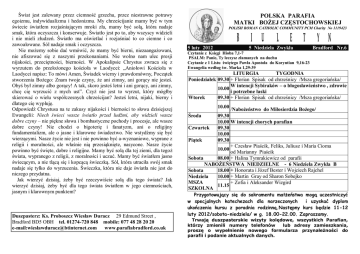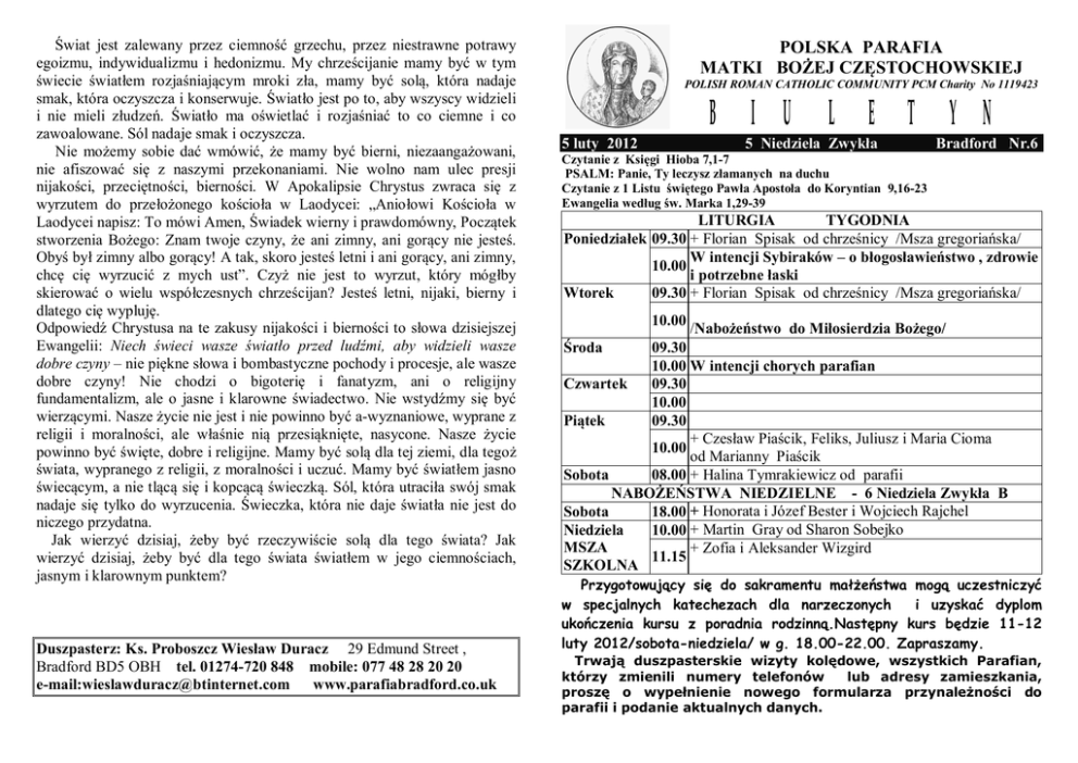 wiat jest zalewany przez ciemno grzechu, przez niestrawne potrawy egoizmu, indywidualizmu i hedonizmu. My chrze cijanie mamy by w tym wiecie wiat em rozja niaj cym mroki z a, mamy by sol , która nadaje smak, która oczyszcza i konserwuje. wiat o jest po to, aby wszyscy widzieli i nie mieli z udze . wiat o ma o wietla i rozja nia to co ciemne i co zawoalowane. Sól nadaje smak i oczyszcza. Nie mo emy sobie da wmówi , e mamy by bierni, niezaanga owani, nie afiszowa si z naszymi przekonaniami. Nie wolno nam ulec presji nijako ci, przeci tno ci, bierno ci. W Apokalipsie Chrystus zwraca si z wyrzutem do prze onego ko cio a w Laodycei: „Anio owi Ko cio a w Laodycei napisz: To mówi Amen, wiadek wierny i prawdomówny, Pocz tek stworzenia Bo ego: Znam twoje czyny, e ani zimny, ani gor cy nie jeste . Oby by zimny albo gor cy! A tak, skoro jeste letni i ani gor cy, ani zimny, chc ci wyrzuci z mych ust”. Czy nie jest to wyrzut, który móg by skierowa o wielu wspó czesnych chrze cijan? Jeste letni, nijaki, bierny i dlatego ci wypluj . Odpowied Chrystusa na te zakusy nijako ci i bierno ci to s owa dzisiejszej Ewangelii: Niech wieci wasze wiat o przed lud mi, aby widzieli wasze dobre czyny – nie pi kne s owa i bombastyczne pochody i procesje, ale wasze dobre czyny! Nie chodzi o bigoteri i fanatyzm, ani o religijny fundamentalizm, ale o jasne i klarowne wiadectwo. Nie wstyd my si by wierz cymi. Nasze ycie nie jest i nie powinno by a-wyznaniowe, wyprane z religii i moralno ci, ale w nie ni przesi kni te, nasycone. Nasze ycie powinno by wi te, dobre i religijne. Mamy by sol dla tej ziemi, dla tego wiata, wypranego z religii, z moralno ci i uczu . Mamy by wiat em jasno wiec cym, a nie tl si i kopc wieczk . Sól, która utraci a swój smak nadaje si tylko do wyrzucenia. wieczka, która nie daje wiat a nie jest do niczego przydatna. Jak wierzy dzisiaj, eby by rzeczywi cie sol dla tego wiata? Jak wierzy dzisiaj, eby by dla tego wiata wiat em w jego ciemno ciach, jasnym i klarownym punktem? Duszpasterz: Ks. Proboszcz Wies aw Duracz 29 Edmund Street , Bradford BD5 OBH tel. 01274-720 848 mobile: 077 48 28 20 20 e-mail:[email protected] www.parafiabradford.co.uk POLSKA PARAFIA MATKI BO EJ CZ STOCHOWSKIEJ POLISH ROMAN CATHOLIC COMMUNITY PCM Charity No 1119423 B I U L E T YN 5 luty 2012 5 Niedziela Zwyk a Bradford Nr.6 Czytanie z Ksi gi Hioba 7,1-7 PSALM: Panie, Ty leczysz z amanych na duchu Czytanie z 1 Listu wi tego Paw a Aposto a do Koryntian 9,16-23 Ewangelia wed ug w. Marka 1,29-39 LITURGIA TYGODNIA Poniedzia ek 09.30 + Florian Spisak od chrze nicy /Msza gregoria ska/ W intencji Sybiraków – o b ogos awie stwo , zdrowie 10.00 i potrzebne aski Wtorek 09.30 + Florian Spisak od chrze nicy /Msza gregoria ska/ 10.00 /Nabo stwo do Mi osierdzia Bo ego/ 09.30 10.00 W intencji chorych parafian Czwartek 09.30 10.00 Pi tek 09.30 + Czes aw Pia cik, Feliks, Juliusz i Maria Cioma 10.00 od Marianny Pia cik Sobota 08.00 + Halina Tymrakiewicz od parafii NABO STWA NIEDZIELNE - 6 Niedziela Zwyk a B Sobota 18.00 + Honorata i Józef Bester i Wojciech Rajchel Niedziela 10.00 + Martin Gray od Sharon Sobejko MSZA + Zofia i Aleksander Wizgird 11.15 SZKOLNA roda Przygotowuj cy si do sakramentu ma stwa mog uczestniczy w specjalnych katechezach dla narzeczonych i uzyska dyplom uko czenia kursu z poradnia rodzinn .Nast pny kurs b dzie 11-12 luty 2012/sobota-niedziela/ w g. 18.00-22.00. Zapraszamy. Trwaj duszpasterskie wizyty kol dowe, wszystkich Parafian, którzy zmienili numery telefonów lub adresy zamieszkania, prosz o wype nienie nowego formularza przynale no ci do parafii i podanie aktualnych danych. Lektorzy - Sobota 11.02.2012 g.18.00 - R. Dziama Niedziela 12.02.2012 g. 10.00 - J. Salamon g. 11.15 – Polska Szko a Dy ur przedstawiciela PRD Sali w. Brata Alberta, sobota i niedziela 11-12.02.2012- R. Dziama i M. Janas OFIARY Na potrzeby ko cio a – J.Jab ska £30;J.Ga za £20;H.Gajdecka £10; B.B ewicz £20;A.M.Bogus awski £20;W.Celeba ska £20;A.Szyma ski £10;S.Kollath £20;E.Jaskot £10;K.Koczot £20;R.J.G bka £20;T.Tyszka £20; E.Snopek £10;H.Marcisz £10;Cz.Staszczyk £30; M.Pia cik £30. J.J.Donarscy £20;H. uchelkowski £20;H.Kossak £10;A.K.Stefanko £10. Na kwiaty – M.Pia cik £20; H. uchelkowski £10. Tablica Katy ska – J.J.Donarscy £20;H.Koz owska £10; G.U.Andryszewscy £15;D.M.Baranowscy z rodzin £30. Taca dla parafii – 29.01.2012 - £ 419.91 Gift Aid 01.01.2012 - £ 74. Je eli kto z Parafian pragnie z ofiar czekiem/na dowolny cel parafialny/, prosimy go wypisa na –P.C.M. BRADFORD PARISH. Wszystkim ofiarodawcom sk adamy serdeczne podzi kowanie za z one ofiary na nasze cele parafialne. Bóg zap . *** OG OSZENIA DUSZPASTERSKIE *** 1. W Ewangelii mamy wiele opisów uzdrowie dokonanych przez Chrystusa. Dzisiejsza Ewangelia przypomnia a nam, e poza uzdrowieniem te ciowej Szymona, Chrystus uzdrowi jeszcze wielu chorych i op tanych. Z pewno ci , gdyby d ej pozosta w domu Szymona, ludzie przyprowadziliby znacznie wi cej chorych. Ale Chrystus w nocy odszed z tej miejscowo ci. A czy ja jestem cierpliwy w modlitwie, zw aszcza b agalnej? 2. W sobot , 11 lutego, we wspomnienie Matki Bo ej z Lourdes, b dziemy obchodzi wiatowy Dzie Chorego. W TYM TYGODNIU PATRONUJ NAM: *w poniedzia ek, 6 lutego – wi ty Pawe Miki i towarzysze, m czennicy japo scy. yli w XVI wieku. Niech modlitwa za ich wstawiennictwem przyczyni si do rozkwitu chrze cija stwa w Azji oraz do zaprzestania prze ladowa Ko cio a w Chinach; * W pi tek, 10 lutego – wi ta Scholastyka, siostra wi tego Benedykta. a w VI wieku. Ju w dzieci stwie po wi ci a si wy cznie Bogu i by a dla swojego brata wsparciem w jego wielkim dziele tworzenia regu y zakonnej. Poniedzia ek -g.12.00 POK - Nadanie Krzy y Sybiraka. roda - POK 10.00-14.00 DAY CENTRE Pi tek - POK 10.00-14.00 DAY CENTRE Sobota – POK g.13.30 Spotkanie z rodzicami dzieci przygotowuj cych si do I Komunii wi tej. * Polska Szko a zaprasza serdecznie na Zabaw Walentynkow 11.02.2012 o g.19.30 w POK-