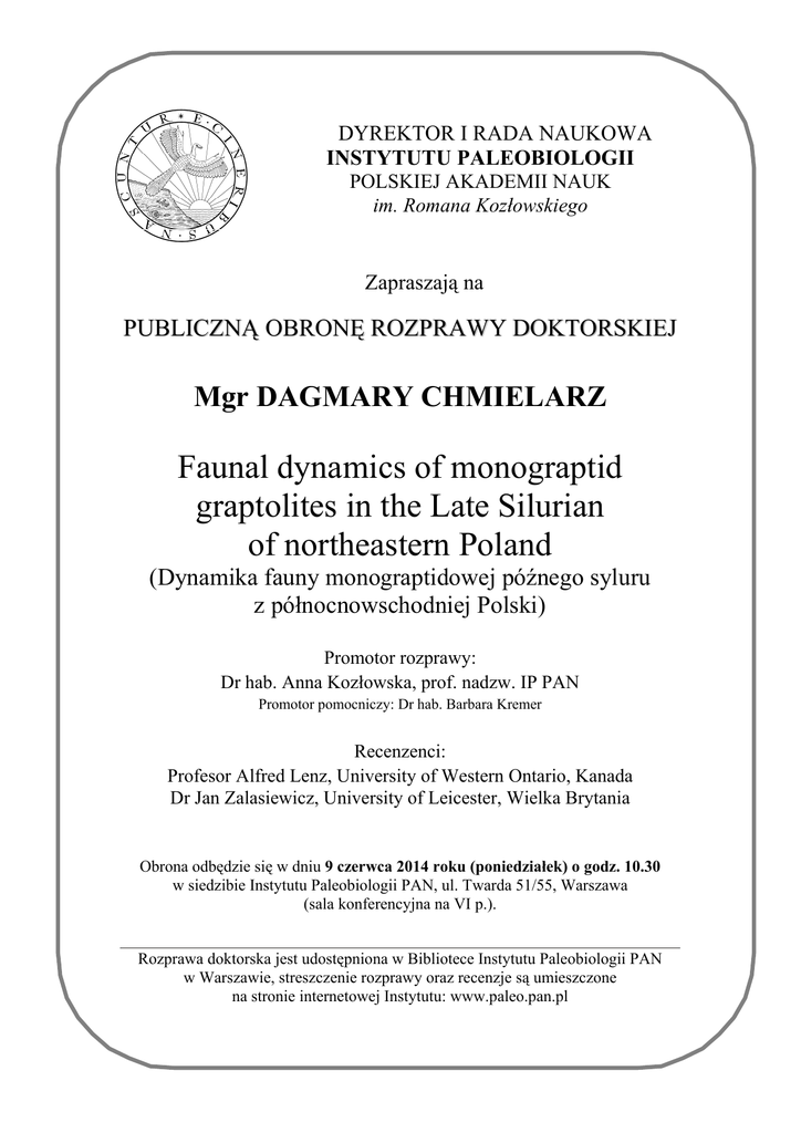 DYREKTOR I RADA NAUKOWA INSTYTUTU PALEOBIOLOGII POLSKIEJ AKADEMII NAUK im. Romana Kozłowskiego Zapraszają na PUBLICZNĄ OBRONĘ ROZPRAWY DOKTORSKIEJ Mgr DAGMARY CHMIELARZ Faunal dynamics of monograptid graptolites in the Late Silurian of northeastern Poland (Dynamika fauny monograptidowej późnego syluru z północnowschodniej Polski) Promotor rozprawy: Dr hab. Anna Kozłowska, prof. nadzw. IP PAN Promotor pomocniczy: Dr hab. Barbara Kremer Recenzenci: Profesor Alfred Lenz, University of Western Ontario, Kanada Dr Jan Zalasiewicz, University of Leicester, Wielka Brytania Obrona odbędzie się w dniu 9 czerwca 2014 roku (poniedziałek) o godz. 10.30 w siedzibie Instytutu Paleobiologii PAN, ul. Twarda 51/55, Warszawa (sala konferencyjna na VI p.). Rozprawa doktorska jest udostępniona w Bibliotece Instytutu Paleobiologii PAN w Warszawie, streszczenie rozprawy oraz recenzje są umieszczone na stronie internetowej Instytutu: www.paleo.pan.pl
