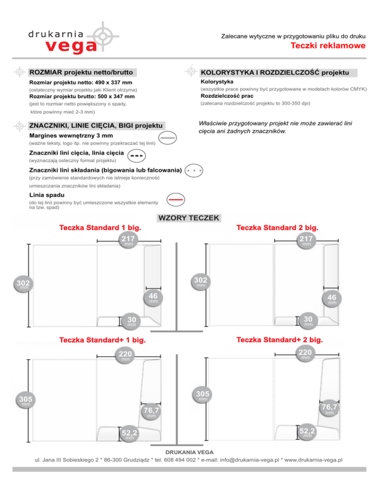Zalecane wytyczne w przygotowaniu pliku do druku Teczki reklamowe ROZMIAR projektu netto/brutto KOLORYSTYKA I ROZDZIELCZOŚĆ projektu Rozmiar projektu netto: 490 x 337 mm Kolorystyka (ostateczny wymiar projektu jaki Klient otrzyma) (wszystkie prace powinny być przygotowane w modelach kolorów CMYK) Rozmiar projektu brutto: 500 x 347 mm Rozdzielczość prac (jest to rozmiar netto powiększony o spady, (zalecana rozdzielczość projektu to 300-350 dpi) które powinny mieć 2-3 mm) ZNACZNIKI, LINIE CIĘCIA, BIGI projektu Margines wewnętrzny 3 mm Właściwie przygotowany projekt nie może zawierać lini cięcia ani żadnych znaczników. (ważne teksty, logo itp. nie powinny przekraczać tej linii) Znaczniki lini cięcia, linia cięcia (wyznaczają osteczny format projektu) Znaczniki lini składania (bigowania lub falcowania) (przy zamówienie standardowych nie istnieje konieczność umieszczania znaczników lini składania) Linia spadu (do tej linii powinny być umieszczone wszystkie elementy na tzw. spad) WZORY TECZEK Teczka Standard 1 big. Teczka Standard 2 big. 217 217 mm mm 302 302 mm mm 46 46 mm mm 30 30 mm mm Teczka Standard+ 2 big. Teczka Standard+ 1 big. 220 220 mm mm 305 305 mm mm 76,7 76,7 mm mm 52,2 mm 52,2 mm DRUKANIA VEGA ul. Jana III Sobieskiego 2 * 86-300 Grudziądz * tel. 608 494 002 * e-mail: [email protected] * www.drukarnia-vega.pl Zalecane wytyczne w przygotowaniu pliku do druku Teczki reklamowe WZORY TECZEK Teczka P4 - 1 big. Teczka P5 - 1 big. 219 155 mm mm 305 mm 77,7 mm 216 55 mm mm 106 77,5 mm mm Teczka Standard NEW - 2 big. Teczka Standard NEW - 1 big. 213 213 mm mm 300 300 mm mm 58,3 53,6 mm mm 37 mm 37 mm Teczka Standard+NEW - 2 big. Teczka Standard+NEW - 1 big. 220 220 mm mm 306 306 mm mm 58 53 mm 50 mm mm 50 mm DRUKANIA VEGA ul. Jana III Sobieskiego 2 * 86-300 Grudziądz * tel. 608 494 002 * e-mail: [email protected] * www.drukarnia-vega.pl