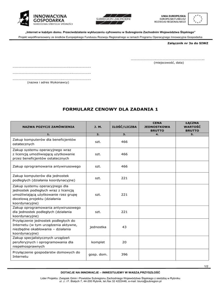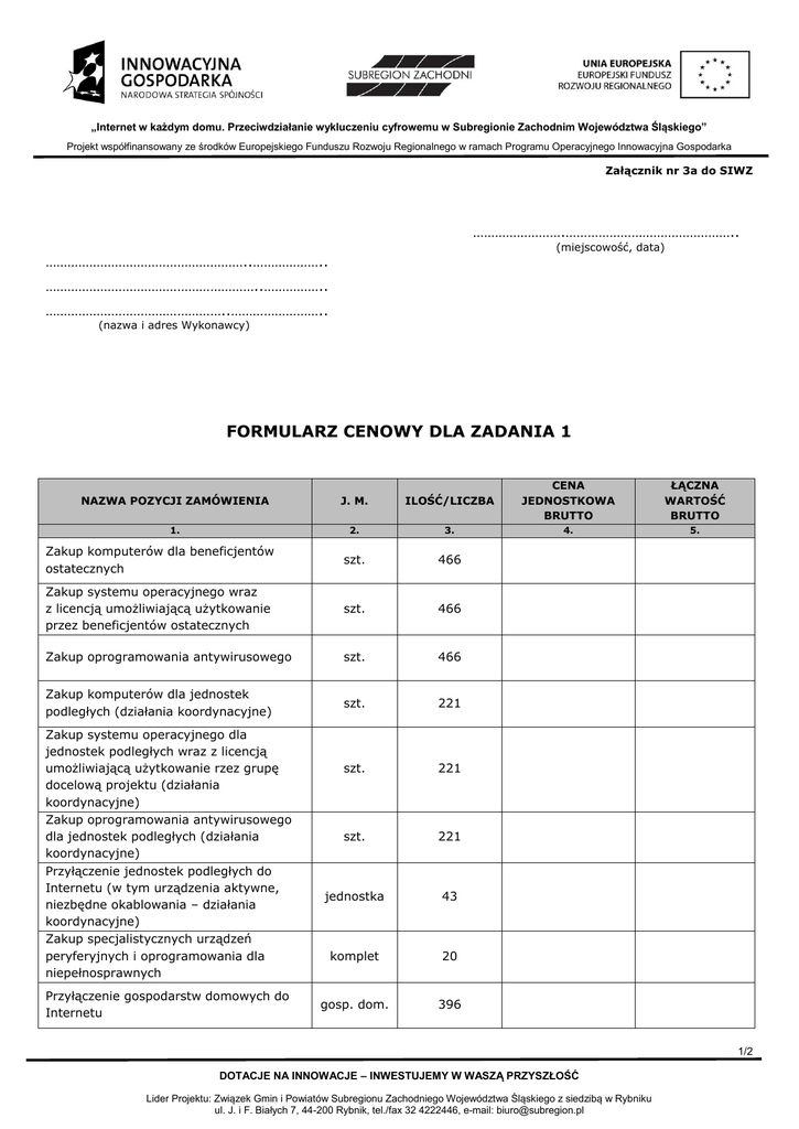 „Internet w każdym domu. Przeciwdziałanie wykluczeniu cyfrowemu w Subregionie Zachodnim Województwa Śląskiego” Projekt współfinansowany ze środków Europejskiego Funduszu Rozwoju Regionalnego w ramach Programu Operacyjnego Innowacyjna Gospodarka Załącznik nr 3a do SIWZ …………………….……………………………………….. (miejscowość, data) ………………………………………………..……………….. …………………………………………………..…………….. …………………………………………..…………………….. (nazwa i adres Wykonawcy) FORMULARZ CENOWY DLA ZADANIA 1 NAZWA POZYCJI ZAMÓWIENIA J. M. ILOŚĆ/LICZBA CENA JEDNOSTKOWA BRUTTO ŁĄCZNA WARTOŚĆ BRUTTO 1. 2. 3. 4. 5. Zakup komputerów dla beneficjentów ostatecznych szt. 466 Zakup systemu operacyjnego wraz z licencją umożliwiającą użytkowanie przez beneficjentów ostatecznych szt. 466 Zakup oprogramowania antywirusowego szt. 466 Zakup komputerów dla jednostek podległych (działania koordynacyjne) szt. 221 szt. 221 szt. 221 jednostka 43 komplet 20 gosp. dom. 396 Zakup systemu operacyjnego dla jednostek podległych wraz z licencją umożliwiającą użytkowanie rzez grupę docelową projektu (działania koordynacyjne) Zakup oprogramowania antywirusowego dla jednostek podległych (działania koordynacyjne) Przyłączenie jednostek podległych do Internetu (w tym urządzenia aktywne, niezbędne okablowania – działania koordynacyjne) Zakup specjalistycznych urządzeń peryferyjnych i oprogramowania dla niepełnosprawnych Przyłączenie gospodarstw domowych do Internetu 1/2 DOTACJE NA INNOWACJE – INWESTUJEMY W WASZĄ PRZYSZŁOŚĆ Lider Projektu: Związek Gmin i Powiatów Subregionu Zachodniego Województwa Śląskiego z siedzibą w Rybniku ul. J. i F. Białych 7, 44-200 Rybnik, tel./fax 32 4222446, e-mail: [email protected] „Internet w każdym domu. Przeciwdziałanie wykluczeniu cyfrowemu w Subregionie Zachodnim Województwa Śląskiego” Projekt współfinansowany ze środków Europejskiego Funduszu Rozwoju Regionalnego w ramach Programu Operacyjnego Innowacyjna Gospodarka Zakup usługi dostępu do Internetu (abonament na 12 m-cy dla 1 B.O.) Instalacja i konfiguracja zestawów komputerowych i oprogramowania w gospodarstwach domowych Zakup usługi dostępu do Internetu (abonament na 12 m-cy dla 1 jednostki) Opieka serwisowa posprzedażna sprzętu w gospodarstwach domowych Beneficjentów Ostatecznych Opieka serwisowa posprzedażna sprzętu w jednostkach podległych (działania koordynacyjne) gosp. dom. 396 szt. 396 jednostka 43 szt. 396 szt. 171 RAZEM ……………………………………………………………………………… (podpis osoby (osób) upoważnionej/ych) 2/2 DOTACJE NA INNOWACJE – INWESTUJEMY W WASZĄ PRZYSZŁOŚĆ Lider Projektu: Związek Gmin i Powiatów Subregionu Zachodniego Województwa Śląskiego z siedzibą w Rybniku ul. J. i F. Białych 7, 44-200 Rybnik, tel./fax 32 4222446, e-mail: [email protected]