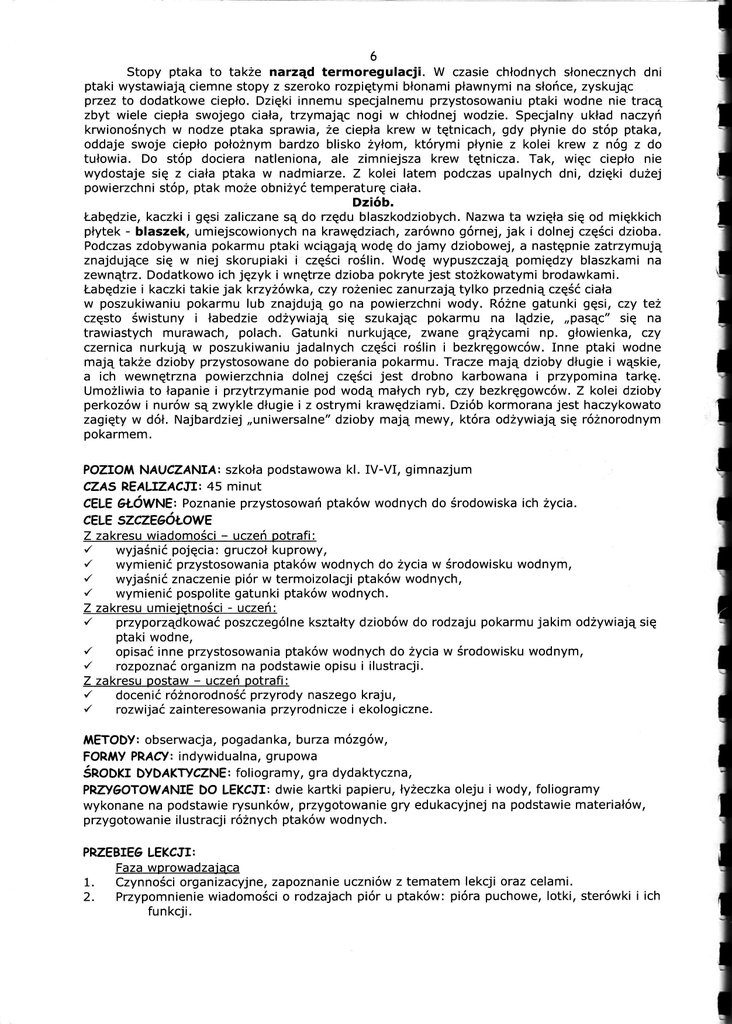 6 Stopy ptaka to także narząd termoregulacji. W czasie chłodnych słonecznych dni ptaki wystawiają ciemne stopy z szeroko rozpiętymi błonami pławnymi na słońce, zyskując przez to dodatkowe ciepło. Dzięki innemu specjalnemu przystosowaniu ptaki wodne nie tracą zbyt wiele ciepła swojego ciała, trzymając nogi w chłodnej wodzie. Specjalny układ naczyń krwionośnych w nodze ptaka sprawia, że ciepła krew w tętnicach, gdy płynie do stóp ptaka, oddaje swoje ciepło położnymbardzo blisko żyłom, którymi płynie z kolei krew z nóg z do tułowia. Do stóp dociera natleniona, ale zimniejsza krew tętnicza. Tak, więc ciepło nie wydostaje się z ciała ptaka w nadmiarze. Z kolei latem podczas upalnych dni, dzięki dużej powierzchni stóp, ptak może obniżyć temperaturę ciała. Dziób. Łabędzie, kaczki igęsi zaliczane sądo rzędu blaszkodziobych. Nazwa ta wzięła się od miękkich płytek - blaszek, umiejscowionych na krawędziach, zarówno górnej, jak i dolnej częścidzioba. Podczas zdobywania pokarmu ptaki wciągają wodę do jamy dziobowej, a następnie zatrzymują znajdujące się w niej skorupiaki i częściroślin. Wodę wypuszczają pomiędzy blaszkami na zewnątrz. Dodatkowo ich język i wnętrze dzioba pokryte jest stożkowatymi brodawkami. Łabędzie i kaczki takie jak krzyżówka, czy rożeniec zanurzajątylko przednią częśćciała w poszukiwaniu pokarmu lub znajdują go na powierzchni wody. RÓźne gatunki gęsi, czy też często świstunyi łabedzie odzywiają się szukając pokarmu na lądzie, ,pasąc" się na trawiastych murawach, polach, Gatunki nurkujące, zwane grązycami np. głowienka, czy czernica nurkują w poszukiwaniu jadalnych częściroślini bezkręgowców. Inne ptaki wodne mają takźe dzioby przystosowane do pobierania pokarmu. Tracze mają dzioby długie i wąskie, a ich wewnętrzna powierzchnia dolnej częścijest drobno karbowana i przypomina tarkę. Umozliwia to łapanie i przytrzymanie pod wodą małych ryb, czy bezkręgowców. Z kolei dzioby perkozów i nurów są zwykle długie i z ostrymi krawędziami. Dziób kormorana jest haczykowato zagięty w dół. Najbardziej ,,uniwersalne" dzioby mają mewy, która odżywiają się różnorodnym pokarmem. POZTOM NAUCZANIA: szkoła podstawowa kl. IV-VI, gimnazjum ę.^S REALIZACJI: 45 minut CELE CŁÓWNE: Poznanie przystosowań ptaków wodnych do środowiska ich życia. CELE SZCZECÓŁOWE Z zakresu wiadomości - uczeń Botrafi: ,/ wyjaśnićpojęcia: gruczoł kuprowy, ,/ wymienić przystosowania ptaków wodnych do zycia w środowisku wodnym, r' wyjaśnićznaczenie piór w termoizolacji ptaków wodnych, ,/ wymienić pospolite gatunki ptaków wodnych. Z zakresu umiejętności - uczeń: ./ przyporządkować poszczególne kształty dziobów do rodzaju pokarmu jakim odzywiają się ptaki wodne, ./ opisać inne przystosowania ptaków wodnych do zycia w środowisku wodnym, r' rozpoznać organizm na podstawie opisu i ilustracji. Z zakresu postaw - uczeń potrafi: ,/ docenić różnorodnośćprzyrody naszego kraju, ,/ rozwijać zainteresowania przyrodnicze i ekologiczne. METODY: obserwacja, pogadanka, burza mózgów, FORMY PRAćY: indywidualna, grupowa Śnoorr DyDAKrycZNE: foliogramy, gra dydaktyczna, PPZYGOTOWANIE DO LEKCJI: dwie kartki papieru, łyżeczkaoleju i wody, foliogramy wykonane na podstawie rysunków, przygotowanie gry edukacyjnej na podstawie materiałów, przygotowanie ilustracji róznych ptaków wodnych. PRZEBIEG LEKCJI: Faza worowadzająca 1. Czynności organizacyjne, zapoznanie uczniów z tematem lekcji oraz celami. 2. Przypomnienie wiadomości o rodzajach piór u ptaków: pióra puchowe, lotki, sterówki iich funkcji.