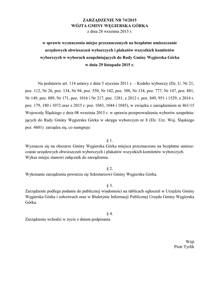 ZARZĄDZENIE NR 74/2015 WÓJTA GMINY WĘGIERSKA GÓRKA z dnia 28 września 2015 r. w sprawie wyznaczenia miejsc przeznaczonych na bezpłatne umieszczanie urzędowych obwieszczeń wyborczych i plakatów wszystkich komitetów wyborczych w wyborach uzupełniających do Rady Gminy Węgierska Górka w dniu 29 listopada 2015 r. Na podstawie art. 114 ustawy z dnia 5 stycznia 2011 r. – Kodeks wyborczy (Dz. U. Nr 21, poz. 112, Nr 26, poz. 134, Nr 94, poz. 550, Nr 102, poz. 588, Nr 134, poz. 777, Nr 147, poz. 881, Nr 149, poz. 889, Nr 171, poz. 1016 i Nr 217, poz. 1281, z 2012 r. poz. 849, 951 i 1529, z 2014 r. poz. 179, 180 i 1072 oraz z 2015 r. poz. 1043, 1044 i 1045), w związku z zarządzeniem nr 461/15 Wojewody Śląskiego z dnia 08 września 2015 r. w sprawie przeprowadzenia wyborów uzupełniających do Rady Gminy Węgierska Górka w okręgu wyborczym nr 8 (Dz. Urz. Woj. Śląskiego poz. 4601) zarządza się, co następuje: § 1. Wyznacza się na obszarze Gminy Węgierska Górka miejsca przeznaczone na bezpłatne umieszczanie urzędowych obwieszczeń wyborczych i plakatów wszystkich komitetów wyborczych. Wykaz miejsc stanowi załącznik do zarządzenia. § 2. Wykonanie zarządzenia powierza się Sekretarzowi Gminy Węgierska Górka. § 3. Zarządzenie podlega podaniu do publicznej wiadomości na tablicach ogłoszeń w Urzędzie Gminy Węgierska Górka i sołectwach oraz w Biuletynie Informacji Publicznej Urzędu Gminy Węgierska Górka. § 4. Zarządzenie wchodzi w życie z dniem podpisania. Wójt Piotr Tyrlik Załącznik do Zarządzenia nr 74/2015 Wójta Gminy Węgierska Górka z dnia 28 września 2015 r. Wykaz miejsc na obszarze Gminy Węgierska Górka przeznaczonych na bezpłatne umieszczanie urzędowych obwieszczeń wyborczych i plakatów wszystkich komitetów wyborczych w wyborach uzupełniających do Rady Gminy Węgierska Górka w dniu 29 listopada 2015 r. Lp. 1 2 3 4 Miejsca na obszarze Gminy Węgierska Górka przeznaczone na bezpłatne umieszczanie urzędowych obwieszczeń wyborczych Tablica ogłoszeń w budynku Urzędu Gminy w Węgierskiej Górce Tablica ogłoszeń przed budyniem Urzędu Gminy w Węgierskiej Górce Gminne tablice ogłoszeń rozmieszczone na terenie czterech sołectw: Cisiec, Cięcina, Węgierska Górka, Żabnica (w ilości cztery tablice na sołectwo) Lokale obwodowych komisji wyborczych (gminne obiekty oświatowe) Miejsca na obszarze Gminy Węgierska Górka przeznaczone na bezpłatne Lp. umieszczanie urzędowych obwieszczeń wyborczych i plakatów wszystkich komitetów wyborczych 1 Tablica ogłoszeń przed budyniem Urzędu Gminy w Węgierskiej Górce 2 Gminne tablice ogłoszeń rozmieszczone na terenie czterech sołectw: Cisiec, Cięcina, Węgierska Górka, Żabnica (w ilości cztery tablice na sołectwo) Lp. 1 2 Miejsca na obszarze Gminy Węgierska Górka przeznaczone na bezpłatne umieszczanie plakatów wszystkich komitetów wyborczych Tablica ogłoszeń przed budyniem Urzędu Gminy w Węgierskiej Górce Gminne tablice ogłoszeń rozmieszczone na terenie czterech sołectw: Cisiec, Cięcina, Węgierska Górka, Żabnica (w ilości cztery tablice na sołectwo) Wójt Piotr Tyrlik 2