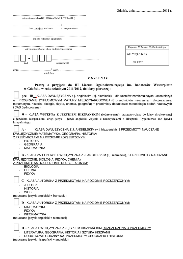 Gdańsk, dnia ............................... 2011 r. ............................................................................... imiona i nazwisko (DRUKOWANYMI LITERAMI !) ................................................... / .......................... data i miejsce urodzenia / obywatelstwo ............................................................................... imiona rodziców, opiekunów ............................................................................... Wypełnia III Liceum Ogólnokształcące adres zamieszkania: ulica, nr domu/mieszkania ⎕⎕ - ⎕⎕⎕................................................... miejscowość kod dom. WPŁYNĘŁO DNIA ............................ NR EWID. ........................ ................................./ kom. ........................... nr telefonu PODANIE Proszę o przyjęcie do III Liceum Ogólnokształcącego im. Bohaterów Westerplatte w Gdańsku w roku szkolnym 2011/2012, do klasy pierwszej: ⎕ pre - IB – KLASA DWUJĘZYCZNA z j. angielskim (+j. niemiecki) – dla uczniów zamierzających uczestniczyć w PROGRAMIE DYPLOMOWYM MATURY MIĘDZYNARODOWEJ (6 przedmiotów nauczanych dwujęzycznie: matematyka, historia, biologia, fizyka, chemia, geografia) + przedmioty dodatkowe: metodologia badań naukowych i CAS (jednoroczna) ⎕ 0 – KLASA WSTĘPNA Z JĘZYKIEM HISZPAŃSKIM (jednoroczna), przygotowująca do klasy dwujęzycznej z językiem hiszpańskim, drugi język – język angielski. Zajęcia z nauczycielami z Hiszpanii. Tygodniowo 18h języka hiszpańskiego. ⎕ A- KLASA DWUJĘZYCZNA Z J. ANGIELSKIM (+ j. hiszpański), 3 PRZEDMIOTY NAUCZANE DWUJĘZYCZNIE: MATEMATYKA, GEOGRAFIA, HISTORIA; Z PRZEDMIOTAMI NA POZIOMIE ROZSZERZONYM: - HISTORIA - GEOGRAFIA - MATEMATYKA ⎕ B - KLASA (W POŁOWIE DWUJĘZYCZNA Z J. ANGIELSKIM (+j. niemiecki), 3 PRZEDMIOTY NAUCZANE DWUJĘZYCZNIE: BIOLOGIA, FIZYKA, CHEMIA); Z PRZEDMIOTAMI NA POZIOMIE ROZSZERZONYM: - BIOLOGIA - CHEMIA - FIZYKA ⎕ C - KLASA AUTORSKA Z PRZEDMIOTAMI NA POZIOMIE ROZSZERZONYM: - J. POLSKI - HISTORIA - WOS (nauczane języki: angielski + francuski) ⎕ D - KLASA AUTORSKA Z PRZEDMIOTAMI NA POZIOMIE ROZSZERZONYM: - MATEMATYKA - FIZYKA - INFORMATYKA (nauczane języki: angielski + niemiecki) ⎕ H – KLASA DWUJĘZYCZNA Z JĘZYKIEM HISZPAŃSKIM ROZSZERZONA O PRZEDMIOTY: - LITERATURA, GEOGRAFIA, HISTORIA I SZTUKA HISZPANII - DODATKOWE GODZINY NA PRZEDMIOTY: GEOGRAFIA I HISTORIA (nauczane języki: hiszpański + angielski) INFORMACJE O KANDYDACIE NUMER PESEL UCZNIA ⎕⎕⎕⎕⎕⎕⎕⎕⎕⎕⎕ Adres zamieszkania ojca/opiekuna (jeżeli jest inny niż ucznia): ...................................................................... Zawód ojca (opiekuna) ...................................................................................................................................................... Miejsce pracy : ................................................................................................................................................................. Adres miejsca pracy: ......................................................................................................................................................... Telefon kom. ...................................................................................... Adres zamieszkania matki/opiekunki (jeżeli jest inny niż ucznia): .................................................................. Zawód matki (opiekunki) .................................................................................................................................................. Miejsce pracy : . ................................................................................................................................................................ Adres miejsca pracy: ........................................................................................................................................................ Telefon kom. ...................................................................................... NAZWA I NR GIMNAZJUM: ................................................................................................................ ............................................ ADRES GIMNAZJUM:....................................................................................................................................................................... NR TELEFONU:................................................................................................................. ................................................................. ZNAJOMOŚĆ JĘZYKÓW OBCYCH: .............................................................................................................................................................................................................. POSIADANE CERTYFIKATY JĘZYKOWE : ⎕FCE – ocena ................. ⎕ CAE– ocena ................. ⎕ BRAK WAŻNIEJSZE INFORMACJE DLA KANDYDATA: Dokumenty można składać w sekretariacie „Topolówki” w dniach od 19 do 23 maja 2011 r. do klasy dwujęzycznej i pre-IB, od 19 maja do 17 czerwca 2011 r. do pozostałych klas (pn.-pt. w godz. 8:00-15:00). Do niniejszego podania należy dołączyć: 3 fotografie legitymacyjne o wymiarach: 30x42 mm – podpisane! imię, nazwisko i data urodzenia kserokopię aktu urodzenia ! Zgodnie z Zarządzeniem nr 1/2011 Pomorskiego Kuratora Oświaty z dnia 25 stycznia 2011 r. w procesie rekrutacji uwzględnione będą TYLKO osiągnięcia ucznia WYMIENIONE W ŚWIADECTWIE UKOŃCZENIA GIMNAZJUM W związku z powyższym, nie przyjmujemy żadnych odrębnych zaświadczeń, dyplomów, informacji o udziale w konkursach, kółkach zainteresowań, aktywności ucznia i innych !!! KANDYDACI DO KLAS I GRUP DWUJĘZYCZNYCH: IA, B, H i I pre-IB ZOBOWIĄZANI SĄ ZŁOŻYĆ WW. DOKUMENTY O PRZYJĘCIE DO SZKOŁY DO DNIA 23 MAJA 2011 r. ! TERMINY SPRAWDZIANÓW UZDOLNIEŃ KIERUNKOWYCH Z J. A