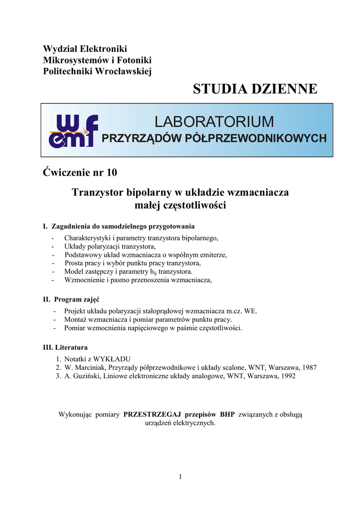 Wydział Elektroniki Mikrosystemów i Fotoniki Politechniki Wrocławskiej STUDIA DZIENNE LABORATORIUM PRZYRZĄDÓW PÓŁPRZEWODNIKOWYCH Ćwiczenie nr 10 Tranzystor bipolarny w układzie wzmacniacza małej częstotliwości I. Zagadnienia do samodzielnego przygotowania - Charakterystyki i parametry tranzystora bipolarnego, Układy polaryzacji tranzystora, Podstawowy układ wzmacniacza o wspólnym emiterze, Prosta pracy i wybór punktu pracy tranzystora, Model zastępczy i parametry hij tranzystora. Wzmocnienie i pasmo przenoszenia wzmacniacza, II. Program zajęć - Projekt układu polaryzacji stałoprądowej wzmacniacza m.cz. WE. Montaż wzmacniacza i pomiar parametrów punktu pracy. Pomiar wzmocnienia napięciowego w paśmie częstotliwości. III. Literatura 1. Notatki z WYKŁADU 2. W. Marciniak, Przyrządy półprzewodnikowe i układy scalone, WNT, Warszawa, 1987 3. A. Guziński, Liniowe elektroniczne układy analogowe, WNT, Warszawa, 1992 Wykonując pomiary PRZESTRZEGAJ przepisów BHP związanych z obsługą urządzeń elektrycznych. 1 1. Wiadomości wstępne 1.1 Wzmacniacz napięciowy m.cz., WE Układ wzmacniacza tranzystorowego m.cz. w układzie wspólnego emitera (WE) ze stałoprądowym sprzężeniem zwrotnym zapewniającym stabilizację punktu pracy przedstawiony jest na rysunku 1. Rys.1 Schemat układu wzmacniacza m.cz. w układzie WE. Jest to wzmacniacz z pojemnościowym sprzężeniem sygnału (kondensator C1 łączy źródło sygnału z wejściem wzmacniacza) oraz stabilizacją punktu pracy na rezystorze Re. Dzielnik R2 napięciowy R1/R2 zapewnia stałą polaryzację bazy napięciem U B U CC . R1 R2 Napięcie UB wynikające z dzielnika rezystorowego jest stałe, o ile prąd dzielnika ID jest dużo większy od prądu bazy IB , np. ID = 10 IB (wówczas można zaniedbać istniejący rozpływ prądów w węźle bazy). Ewentualne zmiany napięcia na rezystorze emiterowym Re (np. wzrost wartości prądu IE) powodują zmianę (wzrost) potencjału emitera (UE = IE Re) i w efekcie zmniejszenie napięcia UBE, (UBE= UB – IE Re) co skutkuje powstaniem ujemnego sprzężenia zwrotnego dla prądu stałego IC I E w obwodzie wyjściowym tranzystora. Przykładowo, jeżeli prąd emitera wzrasta (np. na skutek wzrostu temperatury) o wartość IE to efekt ujemnego sprzężenia można zobrazować następująco: dla ustalonego prądu IB const. IE I E Re U E U BE I E Kondensator Ce , o małym module impedancji w stosunku do wartości rezystora Re, powoduje praktycznie zwarcie rezystora Re dla sygnałów zmiennych. Tak więc układ dla wzmacniania sygnałów małych częstotliwości jest układem ze wspólnym emiterem, WE (bez rezystora emiterowego). Inaczej mówiąc, dzięki kondensatorowi Ce nie istnieje sprzężenie zwrotne dla sygnałów zmiennych na rezystorze Re. 2 Wzmacnianie sygnałów wygodnie jest omawiać posługując się charakterystykami wyjściowymi tranzystora, na których nanosimy prostą pracy (rys.2). Prosta pracy wynika z zadanej wartości rezystora Rc , oraz napięcia zasilania UCC. Rezystor Rc nazywany jest także obciążeniem (ang. load) RL Zauważ, że maksymalne napięcie w układzie wzmacniacza (przy wyjętym tranzystorze) wynosi UCC, a maksymalny prąd płynący w układzie (przy zwartym tranzystorze) wynosi: I MAX U CC . Prosta łącząca te punkty w układzie współrzędnych Rc Re IC=f(UCE) to tzw. statyczna prosta pracy, czyli obliczona dla prądu stałego. Dla omawianego wzmacniacza statyczna prosta pracy (dla prądu stałego należy uwzględnić rezystor Re) dana jest równaniem: IC 1 UCC UCE Rc Re Rc Re Natomiast dla sygnałów zmiennych równanie dynamicznej prostej pracy wygląda następująco (nie uwzględniamy teraz rezystora Re): 1 U I R I C UCE CC E e Rc Rc Proste pracy powinny leżeć w obszarze dopuszczalnych napięć i prądów tranzystora, tak jak to przedstawiono na rysunku 2. Prosta pracy dla prądu stałego oznaczona jest linią przerywaną, prosta pracy dla prądu zmiennego linią ciągłą. Tą ostatnią wykorzystujemy do analizy wzmocnienia układu. IC UCC-I*ERe I1= RC IMAX= IC max IC>IC max UCC RC+Re I*C Pmax IB =parametr Q UCE>UCE max obszar nasycenia obszar odcięcia U * CE (UCC-I*ERe) UCC UCE max UCE Rys. 2. Charakterystyki wyjściowe z naniesionymi prostymi pracy: statyczną i dynamiczną. Punkt pracy Q(IC*, UCE*) tranzystora musi znajdować się na prostej pracy w obszarze aktywnej pracy tranzystora. Jeżeli układ ma wzmacniać sygnał o dużej amplitudzie, to prąd kolektora IC* w punkcie pracy powinien wynosić około 1/2 prądu maksymalnego IMAX, wówczas napięcie UCE* w punkcie pracy będzie wynosiło około 1/2 napięcia zasilania UCC. 3 1.2 Przykład obliczania projektowanego układu wzmacniacza 1) Przyjmujemy napięcie zasilania UCC 2) Przyjmujemy, że spadek napięcia na rezystorze Re powinien wynosić 0,2 UCC. Ważność tego założenia wyjaśniono w p.8 3) Wybieramy punkt pracy tak aby UCE* ~ IC* Rc czyli spadek napięcia na tranzystorze jest porównywalny ze spadkiem napięcia na rezystorze kolektorowym. 4) Zakładając, że IC* ~ IE* dla h21e >50 (dla wygody zakładamy h21e =100) obliczamy wartość prądu w obwodzie wyjściowym tranzystora: I C* 0,2 U CC Re Natomiast jeśli mamy zaprojektować wzmacniacz dla zadanego prądu IC*, możemy obliczyć wartość Re Re 0,2 U CC I C* 5) Dobieramy wartość obciążenia Rc z równania prostej pracy: I C* 1 U CC I C* Re 2 RC (2.1) 1 UCC I*C Re RC 2 I *C obliczamy (2.2) Jeżeli wartość rezystora obciążenia Rc jest dana, to sprawdzamy czy spełniony jest warunek: U CE* I C * RC 6) Obliczamy prąd bazy IB* w punkcie pracy. Zakładamy wartość h21e zgodną z odczytaną w katalogu dla danego tranzystora. Możemy zmierzyć wartość parametru h21e ( a także h11e ) w założonym punkcie pracy, za pomocą dostępnego w laboratorium miernika parametrów h. Prąd bazy w punkcie pracy: I* I B* C h21e (2.3) 7) Obliczmy wartości rezystorów dzielnika napięcia, R1 R2 . Prąd dzielnika rezystorowe