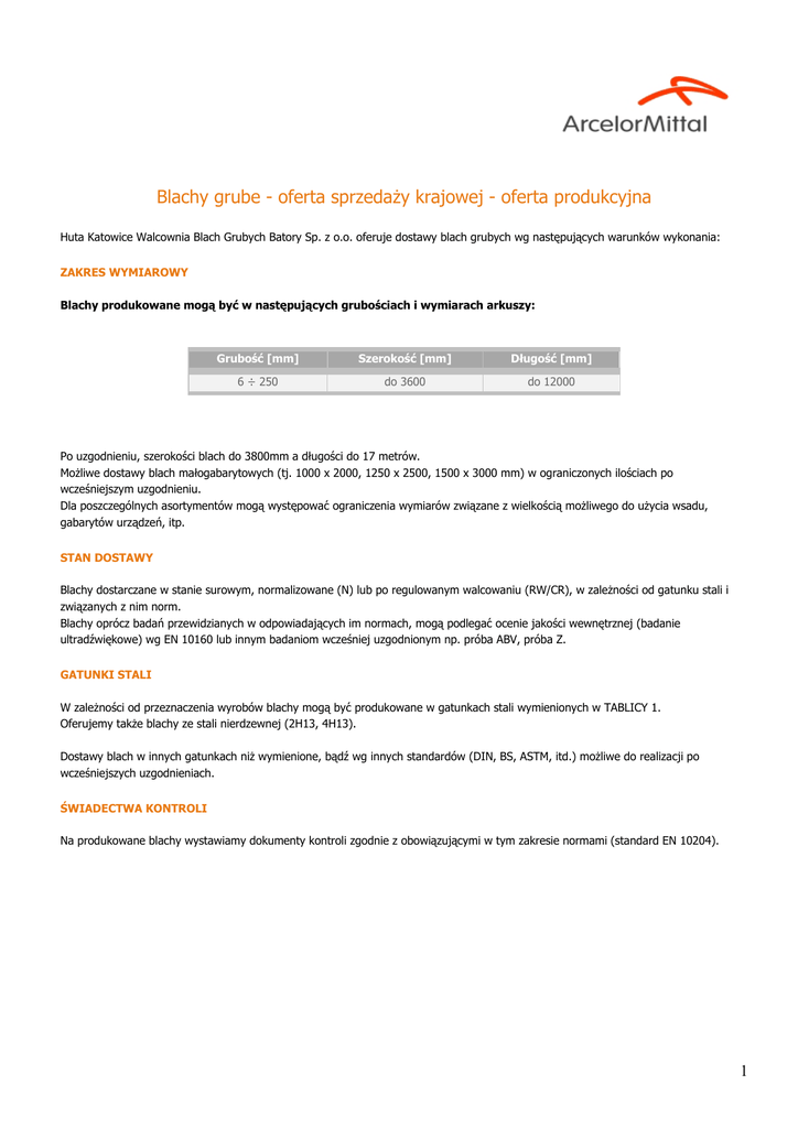 Blachy grube - oferta sprzedaży krajowej - oferta produkcyjna Huta Katowice Walcownia Blach Grubych Batory Sp. z o.o. oferuje dostawy blach grubych wg następujących warunków wykonania: ZAKRES WYMIAROWY Blachy produkowane mogą być w następujących grubościach i wymiarach arkuszy: Grubość [mm] Szerokość [mm] Długość [mm] 6 ÷ 250 do 3600 do 12000 Po uzgodnieniu, szerokości blach do 3800mm a długości do 17 metrów. Możliwe dostawy blach małogabarytowych (tj. 1000 x 2000, 1250 x 2500, 1500 x 3000 mm) w ograniczonych ilościach po wcześniejszym uzgodnieniu. Dla poszczególnych asortymentów mogą występować ograniczenia wymiarów związane z wielkością możliwego do użycia wsadu, gabarytów urządzeń, itp. STAN DOSTAWY Blachy dostarczane w stanie surowym, normalizowane (N) lub po regulowanym walcowaniu (RW/CR), w zależności od gatunku stali i związanych z nim norm. Blachy oprócz badań przewidzianych w odpowiadających im normach, mogą podlegać ocenie jakości wewnętrznej (badanie ultradźwiękowe) wg EN 10160 lub innym badaniom wcześniej uzgodnionym np. próba ABV, próba Z. GATUNKI STALI W zależności od przeznaczenia wyrobów blachy mogą być produkowane w gatunkach stali wymienionych w TABLICY 1. Oferujemy także blachy ze stali nierdzewnej (2H13, 4H13). Dostawy blach w innych gatunkach niż wymienione, bądź wg innych standardów (DIN, BS, ASTM, itd.) możliwe do realizacji po wcześniejszych uzgodnieniach. ŚWIADECTWA KONTROLI Na produkowane blachy wystawiamy dokumenty kontroli zgodnie z obowiązującymi w tym zakresie normami (standard EN 10204). 1 TABLICA 1 Blachy ze stali konstrukcyjnych niestopowych i niskostopowych. EN 10025 STALE KONSTRUKCYJNE STANDARD PN STALE KONSTRUKCYJNE S235JRG2 St3VB S235JO St3VC S235J2G3 St3VD EN 10028-3 EN 10028-2 STALE SPAWALNE EN 10113-2 Orientacyjny STALE DO PRACY DROBNOZIARNISTE STALE poziom Re W PODWYŻSZONYCH NA DROBNOZIARNISTE (MPa) TEMPERATURACH URZĄDZENIA CISNIENIOWE P235GH 235 P265GH 16Mo3 265 S275JR St4VB P275N S275JO St4VC P275NL1 S275J2G3 St4VD P275NH S275N 275 P295GH 295 13CrMo4-5 305 S355JR S355JO S355J2G3 18G2A + odmiany udarności S355K2G3 P355GH P355N S355N P355NL1 355 P355NH 18G2AV S420N P460N P460NL1 420 460 2