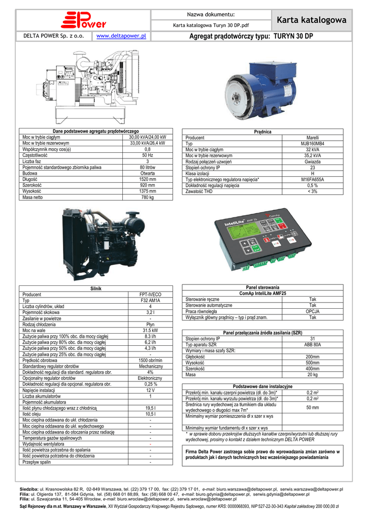 Nazwa dokumentu: Karta katalogowa Turyn 30 DP.pdf DELTA POWER Sp. z o.o. www.deltapower.pl Dane podstawowe agregatu prądotwórczego Moc w trybie ciągłym 30,00 kVA/24,00 kW Moc w trybie rezerwowym 33,00 kVA/26,4 kW 0,8 Współczynnik mocy cos() Częstotliwość 50 Hz Liczba faz 3 Pojemność standardowego zbiornika paliwa 80 litrów Budowa Otwarta Długość 1520 mm Szerokość 920 mm Wysokość 1375 mm Masa netto 780 kg Silnik Producent Typ Liczba cylindrów, układ Pojemność skokowa Zasilanie w powietrze Rodzaj chłodzenia Moc na wale Zużycie paliwa przy 100% obc. dla mocy ciągłej Zużycie paliwa przy 80% obc. dla mocy ciągłej Zużycie paliwa przy 50% obc. dla mocy ciągłej Zużycie paliwa przy 25% obc. dla mocy ciągłej Prędkość obrotowa Standardowy regulator obrotów Dokładność regulacji dla standard. regulatora obr. Opcjonalny regulator obrotów Dokładność regulacji dla opcjonal. regulatora obr. Napięcie instalacji Liczba akumulatorów Pojemność akumulatora Ilość płynu chłodzącego wraz z chłodnicą Ilość oleju Moc cieplna oddawana do ukł. chłodzenia Moc cieplna oddawana do ukł. wydechowego Moc cieplna oddawana do otoczenia przez radiację Temperatura gazów spalinowych Wydajność wentylatora Ilość powietrza potrzebna do spalania Ilość powietrza potrzebna do chłodzenia Przepływ spalin FPT-IVECO F32 AM1A 4 3,2 l Płyn 31.5 kW 8.3 l/h 6,2 l/h 4,3 l/h 1500 obr/min Mechaniczny 4% Elektroniczny 0,25 % 12 V 1 19,5 l 10,5 l - Karta katalogowa Agregat prądotwórczy typu: TURYN 30 DP Prądnica Producent Typ Moc w trybie ciągłym Moc w trybie rezerwowym Rodzaj połączeń uzwojeń Stopień ochrony IP Klasa izolacji Typ elektronicznego regulatora napięcia* Dokładność regulacji napięcia Zawatość THD Marelli MJB160MB4 32 kVA 35,2 kVA Gwiazda 23 H M16FA655A 0,5 % < 3% Panel sterowania ComAp InteliLite AMF25 Sterowanie ręczne Sterowanie automatyczne Praca równoległa Wyłącznik główny prądnicy – typ i prąd znam. Panel przełączania źródła zasilania (SZR) Stopien ochrony IP Typ aparatu SZR Wymiary i masa szafy SZR: Głębokość Wysokość Szerokość Masa Podstawowe dane instalacyjne Przekrój min. kanału czerpni powietrza (dł. do 3m)* Przekrój min. kanału wyrzutu powietrza (dł. do 3m)* Średnica rury wydechowej za tłumikiem dla układu wydechowego o długości max 7m* Minimalny wymiar pomieszczenia dł x szer x wys Tak Tak OPCJA Tak 31 ABB 80A 200mm 500mm 400mm 20 kg 0,2 m2 0,2 m2 50 mm Minimalny wymiar fundamentu dł x szer x wys * w sprawie doboru przekrojów dłuższych kanałów czerpni/wyrzutni lub dłuższej rury wydechowej, prosimy o kontakt z działem technicznym DELTA POWER Firma Delta Power zastrzega sobie prawo do wprowadzania zmian zarówno w produktach jak i danych technicznych bez wcześniejszego powiadamiania Siedziba: ul. Krasnowolska 82 R, 02-849 Warszawa, tel. (22) 379 17 00, fax: (22) 379 17 01, e-mail: [email protected], [email protected] Filia: ul. Olgierda 137, 81-584 Gdynia, tel. (58) 668 01 88;89, fax: (58) 668 00 47, e-mail: [email protected], [email protected] Filia: ul. Szwajcarska 11, 54-405 Wrocław, e-mail: [email protected], [email protected] Sąd Rejonowy dla m.st. Warszawy w Warszawie, XII Wydział Gospodarczy Krajowego Rejestru Sądowego, numer KRS: 0000068393, NIP 527-22-30-343 Kapitał zakładowy 200 000,00 zł