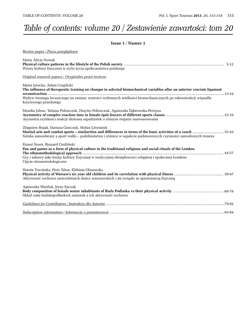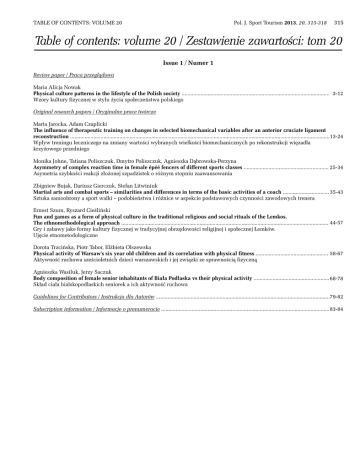 Pol. J. Sport Tourism 2013, 20, 315-318 TABLE OF CONTENTS: VOLUME 20 315 Table of contents: volume 20 / Zestawienie zawartoœci: tom 20 Issue 1 / Numer 1 Review paper / Praca przegl¹dowa Maria Alicja Nowak Physical culture patterns in the lifestyle of the Polish society ...................................................................................................... 3-12 Wzory kultury fizycznej w stylu ¿ycia spo³eczeñstwa polskiego Original research papers / Oryginalne prace twórcze Marta Jarocka, Adam Czaplicki The influence of therapeutic training on changes in selected biomechanical variables after an anterior cruciate ligament reconstruction ................................................................................................................................................................................... 13-24 Wp³yw treningu leczniczego na zmiany wartoœci wybranych wielkoœci biomechanicznych po rekonstrukcji wiêzad³a krzy¿owego przedniego Monika Johne, Tatiana Poliszczuk, Dmytro Poliszczuk, Agnieszka D¹browska-Perzyna Asymmetry of complex reaction time in female épéé fencers of different sports classes .......................................................... 25-34 Asymetria szybkoœci reakcji z³o¿onej szpadzistek o ró¿nym stopniu zaawansowania Zbigniew Bujak, Dariusz Gierczuk, Stefan Litwiniuk Martial arts and combat sports – similarities and differences in terms of the basic activities of a coach ................................ 35-43 Sztuka samoobrony a sport walki – podobieñstwa i ró¿nice w aspekcie podstawowych czynnoœci zawodowych trenera Ernest Szum, Ryszard Cieœliñski Fun and games as a form of physical culture in the traditional religious and social rituals of the Lemkos. The ethnomethodological approach ............................................................................................................................................... 44-57 Gry i zabawy jako formy kultury fizycznej w tradycyjnej obrzædowoúci religijnej i spoùecznej Ùemków. Ujæcie etnometodologiczne Dorota Trzciñska, Piotr Tabor, El¿bieta Olszewska Physical activity of Warsaw's six year old children and its correlation with physical fitness .................................................. 58-67 Aktywnoœæ ruchowa szeœcioletnich dzieci warszawskich i jej zwi¹zki ze sprawnoœci¹ fizyczn¹ Agnieszka Wasiluk, Jerzy Saczuk Body composition of female senior inhabitants of Biaùa Podlaska vs their physical activity .................................................... 68-78 Sk³ad cia³a bialskopodlaskich seniorek a ich aktywnoœæ ruchowa Guidelines for Contributors / Instrukcja dla Autorów ........................................................................................................................79-82 Subscription information / Informacje o prenumeracie .................................................................................................................... 83-84 316 Pol. J. Sport Tourism 2013, 20, 315-318 TABLE OF CONTENTS: VOLUME 20 Issue 2 / Numer 2 Review paper / Praca przegl¹dowa Zofia ¯ukowska Contribution of the Josef Pilsudski University of Physical Education to the promotion of Olympism ..................................... 87-94 Wk³ad Akademii Wychowania Fizycznego Józefa Pi³sudskiego w promocjê wartoœci olimpizmu Original research papers / Oryginalne prace twórcze Marcin Bochenek Festival tourism of folk group dancers from selected countries of the world ............................................................................ 95-104 Turystyka festiwalowa tancerzy zespo³ów folklorystycznych z wybranych krajów œwiata El¿bieta Cieœla The motor development and level of motor skills of 6-year-old children from the Lublin voivodeship .............................. 105-116 Rozwój motoryczny i poziom umiejêtnoœci ruchowych dzieci 6-letnich z województwa lubelskiego Márcio Domingues, Carlos E. Gonçalves The role of parents in talented youth sport. Does context matter? ........................................................................................... 117-122 Witold Kozirok, Ewa Babicz-Zieliñska, Bart³omiej Krzebietke An assessment of the consumption of dietary supplements by players of selected sports ...................................................... 123-134 Ocena spo¿ycia suplementów diety przez zawodników wybranych dyscyplin sportowych Ma³gorzata Lichota, Magdalena Plandowska, Patrycjusz Mil The arches of the feet of competitors in selected sporting disciplines ..................................................................................... 135-146 Wysklepienie stóp zawodników wybranych dyscyplin sportowych Ma³gorzata Skiert, Krystyna Buchta The vocational skills of graduates with a degree in tourism and recreation in the context of the National Qualifications Framework ................................................................................................................................. 147-158 Przygotowanie zawodowe absolwenta kierunku turystyka i rekreacja w œwietle wymogów Krajowych Ram Kwalifikacji Guidelines for Contributors / Instrukcja dla Autorów ...................................................................................................................159-162 Subscription information / Informacje o prenumeracie ................................................................................................................ 163-164 Pol. J. Sport Tourism 2013, 20, 315-318 TABLE OF CONTENTS: VOLUME 20 317 Issue 3 / Numer 3 Review paper / Praca przegl¹dowa W³odzimierz Starosta Importance of relationship between movement rhythm and respiration in physical education and in top-level sport .............................................................................................................................. 167-182 Znaczenie wspó³zale¿noœci rytmu ruchów i oddychania w wychowaniu fizycznym i sporcie wyczynowym Original research pa