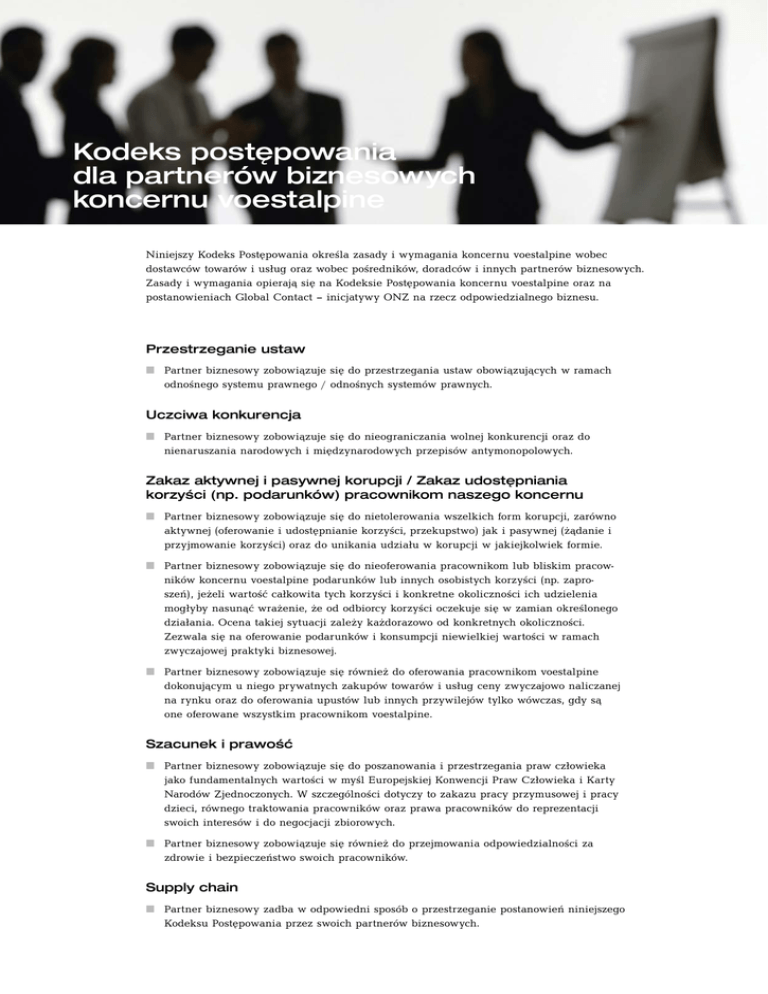 Kodeks postępowania dla partnerów biznesowych koncernu voestalpine Niniejszy Kodeks Postępowania określa zasady i wymagania koncernu voestalpine wobec d ostawców towarów i usług oraz wobec pośredników, doradców i innych partnerów biznesowych. Zasady i wymagania opierają się na Kodeksie Postępowania koncernu voestalpine oraz na p ostanowieniach Global Contact – inicjatywy ONZ na rzecz odpowiedzialnego biznesu. Przestrzeganie ustaw ■ Partner biznesowy zobowiązuje się do przestrzegania ustaw obowiązujących w ramach odnośnego systemu prawnego / odnośnych systemów prawnych. Uczciwa konkurencja ■ Partner biznesowy zobowiązuje się do nieograniczania wolnej konkurencji oraz do n ienaruszania narodowych i międzynarodowych przepisów antymonopolowych. Zakaz aktywnej i pasywnej korupcji / Zakaz udostępniania korzyści (np. podarunków) pracownikom naszego koncernu ■ Partner biznesowy zobowiązuje się do nietolerowania wszelkich form korupcji, zarówno aktywnej (oferowanie i udostępnianie korzyści, przekupstwo) jak i pasywnej (żądanie i przyjmowanie korzyści) oraz do unikania udziału w korupcji w jakiejkolwiek formie. ■ Partner biznesowy zobowiązuje się do nieoferowania pracownikom lub bliskim pracowników koncernu voestalpine podarunków lub innych osobistych korzyści (np. zaproszeń), jeżeli wartość całkowita tych korzyści i konkretne okoliczności ich udzielenia mogłyby nasunąć wrażenie, że od odbiorcy korzyści oczekuje się w zamian określonego d ziałania. Ocena takiej sytuacji zależy każdorazowo od konkretnych okoliczności. Zezwala się na oferowanie podarunków i konsumpcji niewielkiej wartości w ramach zwyczajowej praktyki biznesowej. ■ Partner biznesowy zobowiązuje się również do oferowania pracownikom voestalpine dokonującym u niego prywatnych zakupów towarów i usług ceny zwyczajowo naliczanej na rynku oraz do oferowania upustów lub innych przywilejów tylko wówczas, gdy są one oferowane wszystkim pracownikom voestalpine. Szacunek i prawość ■ Partner biznesowy zobowiązuje się do poszanowania i przestrzegania praw człowieka jako fundamentalnych wartości w myśl Europejskiej Konwencji Praw Człowieka i Karty Narodów Zjednoczonych. W szczególności dotyczy to zakazu pracy przymusowej i pracy dzieci, równego traktowania pracowników oraz prawa pracowników do reprezentacji swoich interesów i do negocjacji zbiorowych. ■ Partner biznesowy zobowiązuje się również do przejmowania odpowiedzialności za z drowie i bezpieczeństwo swoich pracowników. Supply chain ■ Partner biznesowy zadba w odpowiedni sposób o przestrzeganie postanowień niniejszego Kodeksu Postępowania przez swoich partnerów biznesowych.