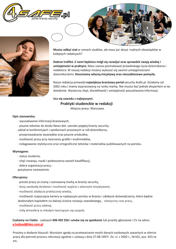 Musisz odbyć staż w ramach studiów, ale masz już dosyć nudnych obowiązków w kolejnych redakcjach? Dobrze trafiłeś. Z nami będziesz mógł się rozwijać oraz sprawdzić swoją wiedzę i umiejętności w praktyce. Masz szanse posmakować prawdziwego życia dziennikarza i redaktora. W naszej redakcji możesz wykazać się swoimi umiejętnościami dziennikarskimi. Doceniamy własną inicjatywę oraz nieszablonowe pomysły. Nasza redakcja prowadzi największy branżowy portal security 4safe.pl. Działamy od 2002 roku i mamy wypracowaną na rynku markę. Nie musisz być jednak ekspertem w tej dziedzinie. Wystarczy chęć, dociekliwość i umiejętność poszukiwania informacji. Ucz się zawodu z najlepszymi. Praktyki studenckie w redakcji Miejsce pracy: Warszawa Opis stanowiska: · wyszukiwanie informacji branżowych, · pisanie tekstów do działu News dot. szeroko pojętej branży security, · udział w konferencjach i spotkaniach prasowych w roli dziennikarza, · przeprowadzanie wywiadów oraz pisanie artykułów, · możliwość pracy przy tworzeniu grafiki i multimediów, · redagowanie stylistyczne oraz ortograficzne tekstów i materiałów publikowanych na portalu. Wymagane: · status studenta, · chęć rozwoju, nauki i podnoszenia swoich kwalifikacji, · dobra organizacja pracy, · pozytywne nastawienie. Oferujemy: · prestiż pracy ze znaną i szanowaną marką w branży security, · dużą swobodę działania i możliwość wyjścia z własnymi inicjatywami, · możliwość zdobycia praktycznej wiedzy, · możliwość rozpoczęcia kariery w najlepszym portalu w branży i zdobycie doświadczenia, które będzie doskonałym kapitałem na dalszej ścieżce rozwoju zawodowego, · elastyczny czas pracy, · możliwość pracy zdalnej, · miłą atmosferę w młodym tworzącym się zespole. Czekamy na Ciebie - zadzwoń 696 492 556 i umów się na spotkanie lub prześlij zgłoszenie i CV na adres: [email protected] Prosimy o dodanie klauzuli: Wyrażam zgodę na przetwarzanie moich danych osobowych zawartych w ofercie pracy dla potrzeb procesu rekrutacji zgodnie z ustawą z dnia 27.08.1997r. Dz. U. z 2002 r., Nr101, poz. 923 ze zm.
