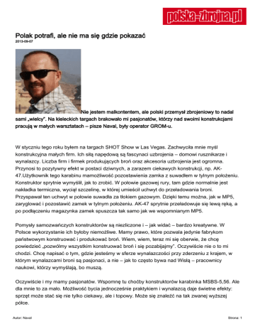 Polak potrafi, ale nie ma się gdzie pokazać 2013-09-07 Nie jestem malkontentem, ale polski przemysł zbrojeniowy to nadal sami „wielcy”. Na kieleckich targach brakowało mi pasjonatów, którzy nad swoimi konstrukcjami pracują w małych warsztatach – pisze Naval, były operator GROM-u. W styczniu tego roku byłem na targach SHOT Show w Las Vegas. Zachwyciła mnie myśl konstrukcyjna małych firm. Ich siłą napędową są fascynaci uzbrojenia – domowi rusznikarze i wynalazcy. Liczba firm i firmek produkujących broń oraz akcesoria uzbrojenia jest ogromna. Przynosi to pozytywny efekt w postaci dziwnych, a zarazem ciekawych konstrukcji, np. AK47.Użytkownik tego karabinu mamożliwość pozostawienia zamka z suwadłem w tylnym położeniu. Konstruktor sprytnie wymyślił, jak to zrobić. W połowie gazowej rury, tam gdzie normalnie jest nakładka termiczna, wyciął szczelinę, w której umieścił uchwyt do przeładowania broni. Przyspawał ten uchwyt w połowie suwadła za tłokiem gazowym. Dzięki temu można, jak w MP5, zaryglować i pozostawić zamek w tylnym położeniu. AK-47 sprytnie przeładowuje się lewą ręką, a po podłączeniu magazynka zamek spuszcza tak samo jak we wspomnianym MP5. Pomysły samozwańczych konstruktorów są niezliczone i – jak widać – bardzo kreatywne. W Polsce wykorzystanie ich byłoby niemożliwe. Mamy prawo, które pozwala jedynie fabrykom państwowym konstruować i produkować broń. Wiem, wiem, teraz mi się oberwie, że chcę powiedzieć „pozwólmy wszystkim konstruować broń i się pozabijajmy”. Oczywiście nie o to mi chodzi. Chcę napisać o tym, gdzie jesteśmy w sferze wynalazczości przy zderzeniu z krajem, w którym wynalazcami broni są pasjonaci, a nie – jak to często bywa nad Wisłą – pracownicy naukowi, którzy wymyślają, bo muszą. Oczywiście i my mamy pasjonatów. Wspomnę tu choćby konstruktorów karabinka MSBS-5,56. Ale dla mnie to za mało. Możliwość bycia jednocześnie praktykiem i wynalazcą daje świetne efekty: sprzęt może stać się nie tylko ciekawy, ale i topowy. Może się znaleźć na tak zwanej wyższej półce. Autor: Naval Strona: 1 Wrócę do pasjonatów zza oceanu i wymienię rodzinne firmy, takie jak Barrett czy też GA PRECISION. Ronnie Barrett, zanim zaczął projektować broń, był fotografem z fantazją, która pozwoliła mu stworzyć jeden z najlepszych samopowtarzalnych wielkokalibrowych karabinów wyborowych na świecie – karabin Barrett M82. To właśnie z tego karabinu pochodzi najdalsze potwierdzone trafienie. Dystans wynosił 2815 metrów. Wniosek nasuwa się sam. Masz pasję i pomysł? W USA możesz konkurować z największymi producentami broni na świecie. Ale wróćmy do Polski. Czego brakowało mi na Międzynarodowym Salonie Przemysłu Obronnego? Nie śmigłowców czy nowych – starych czołgów, lecz stoisk małych firm, które zaprezentowałyby coś, nad czym pracowały we własnych warsztatach. Ale jest światełko w tunelu. Nie chodzi, niestety, o produkcję broni, ale osprzętu i wszystkiego, co kojarzy się z wojskowością. Mówię tu o polskich prywatnych firmach, które pokazują ciekawe projekty kamizelek taktycznych, spadochronów, mundurów czy na przykład kabur robionych na zamówienie. Niestety, tych małych firm często nie stać na udział w targach. Ich organizatorom podsuwam więc pomysł: w przyszłym roku pomyślcie o tańszych miejscach, w których będą mogli prezentować swoje wyroby pasjonaci „polskiego chałupniczego przemysłu obronnego”. Niech MSPO nie będzie miejscem tylko dla wielkiego przemysłu, ale i dla pomysłów pasjonatów. Autor: Naval Strona: 2