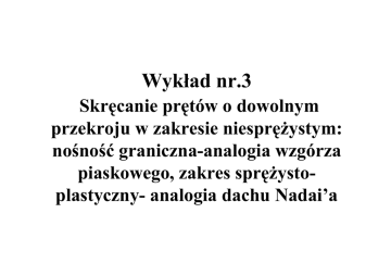 Wykład nr.3 Skręcanie prętów o dowolnym przekroju w zakresie niesprężystym: nośność graniczna-analogia wzgórza piaskowego, zakres sprężystoplastyczny- analogia dachu Nadai’a Analogia Nadaia - analogia wzgórza piasku funkcja naprężenia analogiczna do funkcji Prandtla τ xz ∂Φ ∂Φ = τ yz = − ∂x ∂y warunek równowagi wewnętrznej ∂τ xz ∂τ yz =0 + ∂y ∂x spełniony tożsamościowo ∂ 2Φ ∂ 2Φ − =0 ∂y∂x ∂x∂y naprężenie styczne 2 τ = τ +τ 2 2 xz 2 yz ∂Φ ∂Φ = + ∂x ∂y 2 warunek plastyczności τ =τ0 gdzie τ0 granica plastyczności przy skręcaniu 2 2 2 ∂Φ ∂Φ 2 + = grad Φ = τ 0 ∂ x ∂ y czyli gradΦ (x, y ) = τ 0 czyli wartość gradientu funkcji Φ(x,y) a zatem stały jest spadek powierzchni o równaniu z= Φ(x,y), powierzchnie takiego typu reprezentuje wzgórze piasku gradw(x, y ) = tgµ gdzie w-wartość funkcji (rzędna wzgórza piasku), µ-kąt tarcia wewnętrznego (kąt zsypu) analogia pomiędzy równaniami Φ w grad = 1 = grad tgµ τ0 przy spełnieniu warunków na brzegu Φ|C=0 oraz w|C=0 daje τ0 Φ (x, y ) = w( x , y ) tgµ moment skręcający odpowiadający całkowitemu uplastycznieniu Ms = 2 ∫∫ A τ0 Φ (x, y )dA = 2 tgµ ∫∫ A τ0 w(x, y )dA = 2 VN tgµ Przykład - skręcanie pręta okrągłego h = rtgµ 1 2 1 3 VN = r h = r tgµ 3 3 τ0 2 3 Ms = 2 VN = τ 0 r tgµ 3 Analogia Sadowsky’ego przekroje wielospójne gradw(x, y ) = tgµ w C = const = 0 w = const ≠ 0 C 1 2 moment skręcający τ0 (V1 + V2 ) Ms = 2 tgµ Analogia skręcania sprężysto-plastycznego Nadaia - analogia dachu kombinacja analogii błonowej i wzgórza piasku warunki ciągłości Φe = Φp oraz ∂Φ e ∂Φ p = ∂n ∂n wzdluz Γ ep moment skręcający ~ ep M s = 2 Φ e (x, y )dA + Ae ∫∫ ∫∫ Ap Φ (x, y )dA p