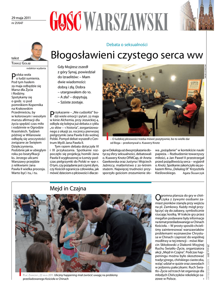 29 maja 2011 nr 21/647 Debata o seksualności Błogosławieni czystego serca ww Gdy Mojżesz zszedł z góry Synaj, powiedział do Izraelitów: – Mam dwie wiadomości: dobrą i złą. Dobra – utargowałem do 10. – A zła? – dopytują. – Szóste zostaje. redaktor wydania P olska woła o ludzi sumienia. Pod tym hasłem 29 maja odbędzie się Marsz dla Życia i Rodziny. Spotykamy się o godz. 12 pod pomnikiem Kopernika na Krakowskim Przedmieściu, by w kolorowym i wesołym marszu afirmacji dla życia spędzić czas miło i rodzinnie w Ogrodzie Krasińskich. Tydzień później w Wilanowie odbędą się uroczystości związane ze Świętem Dziękczynienia. Podobnie jak w ubiegłym roku po beatyfikacji ks. Jerzego ulicami Warszawy przejdzie z relikwiami Jana Pawła II wielka procesja. Warto być i tu, i tu. Jakub Szymczuk tekst Tomasz Gołąb P rzykazanie – „Nie cudzołóż” budzi wiele emocji i pytań. 22 maja w kinie Alchemia, przy Jezuickiej 4, odbyła się kolejna już debata z cyklu „10 słów – 1 historia”, zorganizowanego z okazji 20. rocznicy pierwszej pielgrzymki Jana Pawła II do wolnej Polski. Pomysł debat wyszedł z Centrum Myśli Jana Pawła II. Tym razem debata dotyczyła VI i IX przykazania. Spotkanie rozpoczęło się projekcją homilii Jana Pawła II wygłoszonej w Łomży podczas pielgrzymki do Polski w 1991 r. O tym, czy pożądanie jest czymś złym, czy Kościół ogranicza człowieka, jak mówić dzieciom o płciowości i dlacze- – O ludzkiej płciowości trzeba mówić pozytywnie, bo to wielki dar od Boga – przekonywał o. Ksawery Knotz go w Dekalogu aż dwa przykazania dotyczą sfery seksualności, debatowali o. Ksawery Knotz OFMCap, dr Aneta Gawkowska oraz Justyna i Wojciech Jaźniccy, małżeństwo z 20-letnim stażem. Najwięcej trudności przysporzyło gościom zrozumienie sło- Jakub Szymczuk Mejd in Czajna O gromna plansza do gry w chińczyka z żywymi osobami zamiast pionków stanęła przy wejściu na pl. Zamkowy. Każdy mógł przyłączyć się do zabawy, symbolicznie rzucając kostką. W trakcie gry przez megafon podawane były informacje na temat prześladowanego w Chinach Kościoła. – W prosty sposób chcieliśmy zainteresować warszawiaków problemami wyznawców Chrystusa w Chinach i zaprosić do wspólnej modlitwy w tej intencji – mówi Marcin Skłodowski z Diakonii Misyjnej Ruchu Światło–Życie, organizatora akcji „Mejd in Czajna”. Podczas happeningu można było skosztować tradycyjnego, chińskiego ciasteczka, wziąć udział w quizie oraz zawodach w jedzeniu pałeczkami. Ruch Światło–Życie od trzech lat organizuje dla młodych Chińczyków rekolekcje oazowe w Polsce. • 29 maja 2011 Gość Niedzielny Plac Zamkowy, 22 maja 2011. Uliczny happening miał zwrócić uwagę na problemy prześladowanego Kościoła w Chinach wa „pożądanie” w kontekście nauki papieża. – Rozbudzenie towarzyszy miłości, a Jan Paweł II przestrzegał przed pożądliwością serca – wyjaśnił o. Knotz. Spotkanie zakończyło się pokazem filmu „Dekalog IX” Krzysztofa Kieślowskiego. Agata Ślusarczyk gość warszawski gość warszawski 4 i 5 czerwca w Wilanowie Koncerty mistrzów Festiwal. Zespół Pobudka z Celestynowa zdobył pierwszą nagrodę w Przeglądzie Chrześcijańskie Granie w kategorii zespołów muzycznych do lat 16. Wyróżnienia w tej kategorii otrzymały także warszawskie zespoły: Stru- Powiedz „Dziękuję” Na początku czerwca do Warszawy przybędą relikwie krwi Jana Pawła II. W Białym Marszu ulicami stolicy zostaną przeniesione do Świątyni Opatrzności Bożej, gdzie po raz czwarty będziemy przeżywać Dzień Dziękczynienia. Tomasz Gołąb myczek ze Szkoły Podsta- pod Magdalena i Jakub Kiersiwowej nr 342 oraz Kefas patronatem kowscy oraz chór Accentus z Publicznego Gimnazjum „Gościa” z parafii św. Huberta w Zaleim. ks. Piotra Skargi. Wśród siu Górnym. W kategorii zespołów powyżej 16. roku życia solistów nagrodę otrzymała Aganagrodę otrzymała Akademia Nie- ta Hermanowicz, a wyróżnienia: biańskich Rytmów, a wyróżnienia: Monika Zawadzka i Agnieszka Ostrowska. Przegląd odbył się 20 maja w Dobrym Miejscu na Bielanach. Dzień później podczas Koncertu Debiuty 2011, jury przyznało nagrodę zespołowi Anielsi. Nagroda publiczności powędrowała z kolei w ręce zespołu Love Story za piosenkę „Talitha Kum”. Finał przeglądu będzie podczas Marszu dla Życia, który 29 maja o godz. 12 wyruszy od pomnika Kopernika Podczas Koncertu Debiutów publiczności najbardziej podobała się do Ogrodu Krasińskich na Piknik Rodzinny. tg piosenka „Talitha Kum” zespołu Love Story Został zabity, przelał krew, w trosce o jedność ludzi między sobą i jedność ludzi w Chrystusowym Kościele. Po kanonizacji w roku 1938, jego powrót do Polski przez Europę stał się wielką manifestacją wiary – powiedział metropolita warszawski. W homilii kard. Dziwisz mówił, że świętość Andrzeja Boboli nie starzeje się, jaśnieje pełnym blaskiem. Porównał św. Andrzeja Bobolę do bł. Jana Pawła II. – Obaj byli latoroślami głęboko wszczepionymi w krzew winny, Jezusa Chrystusa. To On stał się największą przygodą i miłością w ich życiu – powiedział kard. Dziwisz. łk Relikwiarz, który w Białym Marszu w Święto Dziękczynienia zostanie przeniesiony do świątyni Opatrzności Bożej, ma kształt okrągłego kryształu z przestrzenią w kształcie kropli Uroczystości przewodniczył kard. Stanisław Dziwisz Joscho Stephan, który wystąpił w Kobyłce 19 maja, jest zapraszany na największe festiwale gitarowe świata Kobyłka . Już po raz czwarty w kościele Świętej Trójcy w Kobył- pod ce można było posłuchać patronatem wirtuozów, uczestniczą- „Gościa” cych w Międzynarodowym Festiwalu „Perła Baroku”. Na zaproszenie Anny Szarek-Lisiewicz co roku na koncerty do barokowego wnętrza świątyni w Kobyłce przyjeżdżają największe g