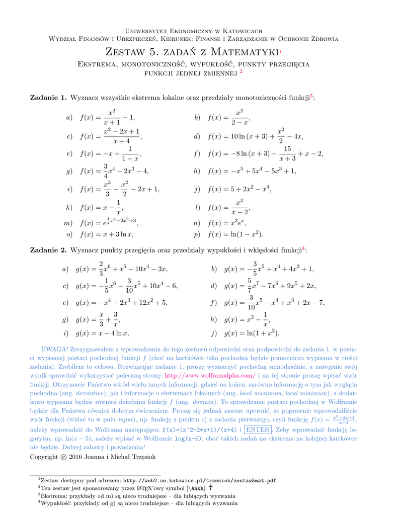Uniwersytet Ekonomiczny w Katowicach Wydział Finansów i Ubezpieczeń, Kierunek: Finanse i Zarządzanie w Ochronie Zdrowia Zestaw 5. zadań z Matematyki1 Ekstrema, monotoniczność, wypukłość, punkty przegięcia funkcji jednej zmiennej 2 Zadanie 1. Wyznacz wszystkie ekstrema lokalne oraz przedziały monotoniczności funkcji3 : x2 − 1, x+1 x2 − 2x + 1 f (x) = , x+4 1 , f (x) = −x + 1−x 3 f (x) = x4 − 2x3 − 4, 4 x3 x2 f (x) = − − 2x + 1, 3 2 1 f (x) = x − , x x2 , 2−x a) f (x) = b) f (x) = c) d) f (x) = 10 ln (x + 3) + e) g) i) k) 1 4 −2x2 +3 m) f (x) = e 4 x , o) f (x) = x + 3 ln x, f) x2 − 4x, 2 15 f (x) = −8 ln (x + 3) − + x − 2, x+3 h) f (x) = −x5 + 5x4 − 5x3 + 1, j) f (x) = 5 + 2x2 − x4 , l) f (x) = n) f (x) = x2 ex , p) f (x) = ln(1 − x2 ). x3 , x−2 Zadanie 2. Wyznacz punkty przegięcia oraz przedziały wypukłości i wklęsłości funkcji4 : a) c) e) g) i) 2 g(x) = x6 + x5 − 10x4 − 3x, 3 1 3 g(x) = − x6 − x5 + 10x4 − 6, 5 10 g(x) = −x4 − 2x3 + 12x2 + 5, x 3 + , 3 x g(x) = x − 4 ln x, g(x) = b) d) f) h) j) 3 g(x) = − x5 + x4 + 4x3 + 1, 5 5 7 g(x) = x − 7x6 + 9x5 + 2x, 7 3 g(x) = x5 − x4 + x3 + 2x − 7, 10 1 g(x) = x2 − , x g(x) = ln(1 + x2 ). UWAGA! Zrezygnowałem z wprowadzania do tego zestawu odpowiedzi oraz podpowiedzi do zadania 1. w postaci wypisanej postaci pochodnej funkcji f (choć na kartkówce taka pochodna będzie pomocniczo wypisana w treści zadania). Zrobiłem to celowo. Rozwiązując zadanie 1. proszę wyznaczyć pochodną samodzielnie, a następnie swój wynik sprawdzić wykorzystać polecaną stronę: http://www.wolframalpha.com/ i na tej stronie proszę wpisać wzór funkcji. Otrzymacie Państwo wśród wielu innych informacji, gdzieś na końcu, zarówno informację o tym jak wygląda pochodna (ang. derivative), jak i informacje o ekstremach lokalnych (ang. local maximum, local minimum), a dodatkowo wypisana będzie również dziedzina funkcji f (ang. domain). To sprawdzanie postaci pochodnej w Wolframie będzie dla Państwa również dobrym ćwiczeniem. Proszę się jednak zawsze upewnić, że poprawnie wprowadziliście 2 wzór funkcji (widać to w polu input), np. funkcję z punktu c) z zadania pierwszego, czyli funkcję f (x) = x −2x+1 , x+4 należy wprowadzić do Wolframa następująco: f(x)=(x^2-2*x+1)/(x+4) i ENTER . Żeby wprowadzić funkcję logarytm, np. ln(x − 5), należy wpisać w Wolframie log(x-5), choć takich zadań na ekstrema na kolejnej kartkówce nie będzie. Dobrej zabawy i powodzenia! c 2016 Joanna i Michał Trzęsiok Copyright 1 Zestaw dostępny pod adresem: http://web2.ue.katowice.pl/trzesiok/zestaw5mat.pdf Ten zestaw jest sponsorowany przez LATEX’owy symbol [\Ankh]: 3 Ekstrema: przykłady od m) są nieco trudniejsze – dla lubiących wyzwania 4 Wypukłość: przykłady od g) są nieco trudniejsze – dla lubiących wyzwania 2