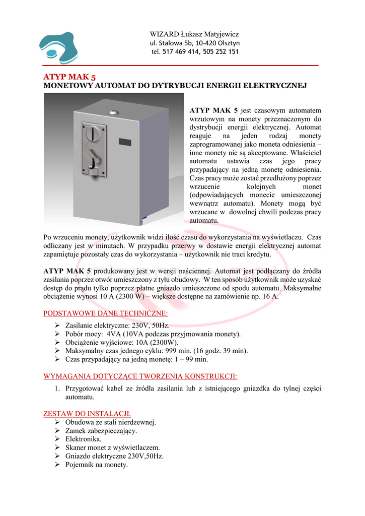 WIZARD Łukasz Matyjewicz ul. Stalowa 5b, 10-420 Olsztyn tel. 517 469 414, 505 252 151 ATYP MAK 5 MONETOWY AUTOMAT DO DYTRYBUCJI ENERGII ELEKTRYCZNEJ ATYP MAK 5 jest czasowym automatem wrzutowym na monety przeznaczonym do dystrybucji energii elektrycznej. Automat reaguje na jeden rodzaj monety zaprogramowanej jako moneta odniesienia – inne monety nie są akceptowane. Właściciel automatu ustawia czas jego pracy przypadający na jedną monetę odniesienia. Czas pracy może zostać przedłużony poprzez wrzucenie kolejnych monet (odpowiadających monecie umieszczonej wewnątrz automatu). Monety mogą być wrzucane w dowolnej chwili podczas pracy automatu. Po wrzuceniu monety, użytkownik widzi ilość czasu do wykorzystania na wyświetlaczu. Czas odliczany jest w minutach. W przypadku przerwy w dostawie energii elektrycznej automat zapamiętuje pozostały czas do wykorzystania – użytkownik nie traci kredytu. ATYP MAK 5 produkowany jest w wersji naściennej. Automat jest podłączany do źródła zasilania poprzez otwór umieszczony z tyłu obudowy. W ten sposób użytkownik może uzyskać dostęp do prądu tylko poprzez płatne gniazdo umieszczone od spodu automatu. Maksymalne obciążenie wynosi 10 A (2300 W) – większe dostępne na zamówienie np. 16 A. PODSTAWOWE DANE TECHNICZNE: Zasilanie elektryczne: 230V, 50Hz. Pobór mocy: 4VA (10VA podczas przyjmowania monety). Obciążenie wyjściowe: 10A (2300W). Maksymalny czas jednego cyklu: 999 min. (16 godz. 39 min). Czas przypadający na jedną monetę: 1 – 99 min. WYMAGANIA DOTYCZĄCE TWORZENIA KONSTRUKCJI: 1. Przygotować kabel ze źródła zasilania lub z istniejącego gniazdka do tylnej części automatu. ZESTAW DO INSTALACJI: Obudowa ze stali nierdzewnej. Zamek zabezpieczający. Elektronika. Skaner monet z wyświetlaczem. Gniazdo elektryczne 230V,50Hz. Pojemnik na monety. WIZARD Łukasz Matyjewicz ul. Stalowa 5b, 10-420 Olsztyn tel. 517 469 414, 505 252 151 RYSUNEK TECHNICZNY: