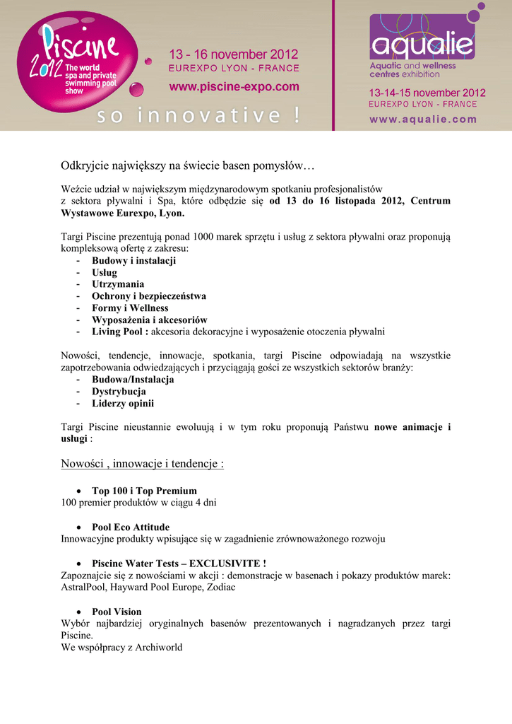 Odkryjcie największy na świecie basen pomysłów… Weźcie udział w największym międzynarodowym spotkaniu profesjonalistów z sektora pływalni i Spa, które odbędzie się od 13 do 16 listopada 2012, Centrum Wystawowe Eurexpo, Lyon. Targi Piscine prezentują ponad 1000 marek sprzętu i usług z sektora pływalni oraz proponują kompleksową ofertę z zakresu: - Budowy i instalacji - Usług - Utrzymania - Ochrony i bezpieczeństwa - Formy i Wellness - Wyposażenia i akcesoriów - Living Pool : akcesoria dekoracyjne i wyposażenie otoczenia pływalni Nowości, tendencje, innowacje, spotkania, targi Piscine odpowiadają na wszystkie zapotrzebowania odwiedzających i przyciągają gości ze wszystkich sektorów branży: - Budowa/Instalacja - Dystrybucja - Liderzy opinii Targi Piscine nieustannie ewoluują i w tym roku proponują Państwu nowe animacje i usługi : Nowości , innowacje i tendencje : Top 100 i Top Premium 100 premier produktów w ciągu 4 dni Pool Eco Attitude Innowacyjne produkty wpisujące się w zagadnienie zrównoważonego rozwoju Piscine Water Tests – EXCLUSIVITE ! Zapoznajcie się z nowościami w akcji : demonstracje w basenach i pokazy produktów marek: AstralPool, Hayward Pool Europe, Zodiac Pool Vision Wybór najbardziej oryginalnych basenów prezentowanych i nagradzanych przez targi Piscine. We współpracy z Archiworld Serwisy specjalne : Club des Majors Obecność światowych liderów sektora, w zasięgu ręki ! Les Matinales Najlepsi międzynarodowi eksperci zaprezentują swoje techniczne i marketingowe know-how, w języku francuskim lub angielskim w ramach konferencji organizowanych każdego ranka. Parcours Export Zapoznajcie się z dostawcami z waszej strefy geograficznej Atmosfera : Piscine Party Każdego wieczora organizowane będą uroczyste gale : okazja, aby poznać Lyon w miłej atmosferze. Podczas edycji 2012 Targi Piscine odbywają się wspólnie z Aqualie - Targami Basenów Publicznych, Parków Wodnych i Wellness Od 13 do 15 listopada 2012 Centrum Wystawowe Eurexpo, Lyon. www.aqualie.com Zacznij swoją wizytę od odwiedzenia www.piscine-expo.com Przedstawiciel targów w Polsce : Promosalons Polska Tel. 22 815 64 55 Email [email protected]