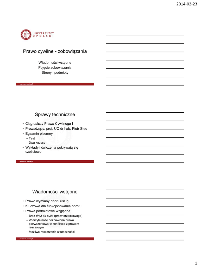 2014-02-23 Prawo cywilne - zobowiązania Wiadomości wstępne Pojęcie zobowiązania Strony i podmioty Sprawy techniczne • Ciąg dalszy Prawa Cywilnego I • Prowadzący: prof. UO dr hab. Piotr Stec • Egzamin pisemny – Test – Dwa kazusy • Wykłady i ćwiczenia pokrywają się częściowo Wiadomości wstępne • Prawo wymiany dóbr i usług • Kluczowe dla funkcjonowania obrotu • Prawa podmiotowe względne – Brak droit de suite (prawnorzeczowego) – Wierzytelność pozbawiona prawa pierwszeństwa w konflikcie z prawem rzeczowym – Możliwe roszerzenie skuteczności. 1 2014-02-23 Źródła • Krajowe – Konstytucja – Kodeks cywilny – Ustawy szczególne • Prawo unijne • Prawo międzynarodowe • Problem unifikacji prawa zobowiązań. Pojęcie zobowiązania • Wierzyciel może żądać od dłużnika pewnego zachowania (świadczenia) • Dłużnik powinien świadczenie spełnić • Elementy stosunku zobowiązaniowego – Podmioty: wierzyciel, dłużnik ( wyjątkowo osoba trzecia) – Przedmiot: świadczenie (dare, facere) – Treść: prawa i obowiązki stron. Podmioty i strony • Wierzytelność i dług • Osoba trzecia – wyjątek. • Strona zawsze wierzyciel lub dłużnik – Sytuacja szczególna: spółka • Po każdej ze stron może być jeden podmiot lub wiele podmiotów • Posługiwanie się osobami trzecimi przy wykonaniu zobowiązania 2 2014-02-23 Indywidualizacja podmiotów • W i D muszą być oznaczonymi osobami • Konkretyzacja zasadniczo na początku – Wyjątek np. przyrzeczenie publiczne – Konkretyzacja najpóźniej w momencie spełnienia świadczenia • Zobowiązania realne: stosunek prawnorzeczowy wyznacza wierzyciela lub dłużnika (np. stosunki sąsiedzkie) Świadczenie • Zachowanie dłużnika zgodne z treścią zobowiązania • Zadośćuczynienie godnemu ochrony interesowi wierzyciela • Interes co do zasady majątkowy • Przedmiot świadczenia: rzecz lub prawo. Nie zawsze istnieje Cel zobowiązania • Ekonomiczny – Wymiana dóbr i usług – Czasem powiązanie z prawem rzeczowym (powiernictwo) • Inny – Interes jednej ze stron (naprawienie szkody) – Ambicje osobiste (darowizna) 3 2014-02-23 Prawa i obowiązki • Prawa i obowiązki mają tylko strony • Zwiększona ochrona – Art. 59 kc (ius ad rem) i skarga pauliańska – Delikt uniemożliwienie wykonania zobowiązania przez dłużnika – Wpis do księgi wieczystej – Prawa o rozszerzonej skuteczności (najem, dzierżawa, dożywocie) Wierzytelność prawo podmiotowe • Roszczenia wierzyciela wobec dłużnika • Uprawnienia zasadnicze – Uzyskanie świadczenia – Uzyskanie odszkodowania lub surogatu • Uprawnienia uboczne – Odsetki – Inne (informacje, rachunek z zarządu, zabezpieczenie) Realizacja • Realne wykonanie zobowiązań – Wierzyciel ma wybór – Problem gospodarki niedoboru • Obowiązki dłużnika – Brak zbiorczego pojęcia – Obowiązek świadczenia – Nie można się zwolnić płacąc odszkodowanie 4 2014-02-23 Dług a odpowiedzialność • Dług = obowiązek • Odpowiedzialność = przymusowa realizacja świadczenia (pokrycie długu) • Warianty – Dług i odpowiedzialność – Dług bez odpowiedzialności – Odpowiedzialność bez długu (prawo niemieckie – Grundschuld) Odpowiedzialność osobista • Zasadniczo nieograniczona • całym majątkiem – Wierzyciel wybiera sposób zaspokojenia i przedmioty, z których się zaspokaja – Dług > majątek => częściowe zaspokojenie wierzycieli – Można dochodzić niezaspokojonej reszty z nowego majątku Ograniczenia odpowiedzialności • Odpowiedzialność z określonej masy majątkowej (konkretnymi składnikami majątku) – 1030 kc (do przyjęcia spadku) • Odpowiedzialność całym majątkiem z ograniczona do określonej wysokości – 1030 kc (po przyjęciu spadku) – Zbycie przedsiębiorstwa 5 2014-02-23 Odpowiedzialność rzeczowa • Niezależna od osobistej • Związana z zastawem i hipoteką • Prawo do zaspokojenia się – z konkretnego przedmiotu – Niezależnie od tego, kto jest właścicielem – Z pierwszeństwem przed wierzycielami osobistymi • Może istnieć razem z osobistą Odpowiedzialność rzeczowa II • Osobista – ma szerszy charakter – daje mniejszą pewność zaspokojenia – Wszyscy wierzyciele traktowani równo – Może być wzmocniona poręczeniem • Rzeczowa – mocniejsza – Ograniczona do konkretnego składnika Zobowiązania niezupełne • Decydują względy etyczne • Cechy – Niezaskarżalne – Dobrowolne spełnienie skuteczne • Przykłady – Gra i zakład – Zobowiązania przedawnione – Zgodne z zasadami współżycia społ. 6