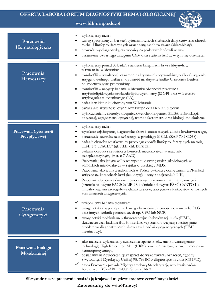 OFERTA LABORATORIUM DIAGNOSTYKI HEMATOLOGICZNEJ www.ldh.ump.edu.pl Pracownia Hematologiczna Pracownia Hemostazy Pracownia Cytometrii Przepływowej wykonujemy m.in.: szereg www specyficznych barwień cytochemicznych służących diagnozowaniu chorób mielo- i limfoproliferacyjnych oraz ocenę zasobów żelaza (sideroblasty), prowadzimy diagnostykę czerwienicy na podstawie hodowli in vitro, www oznaczenie wczesnego antygenu CMV oraz stężenia leków, w tym metotreksatu. wykonujemy ponad 50 badań z zakresu krzepnięcia krwi i fibrynolizy, w tym m.in. w kierunku: trombofilii – wrodzonej: oznaczenie aktywności antytrombiny, białka C, stężenie antygenu wolnego białka S, oporność na aktywne białko C, mutacja Leiden, polimorfizm genu protrombiny; trombofilii – nabytej: badania w kierunku obecności przeciwciał antyfosfolipidowych: antykardiolipinowych i anty β2 GPI oraz w kierunku antykoagulanta toczniowego (LA), badania w kierunku choroby von Willebranda, oznaczanie aktywności czynników krzepnięcia i ich inhibitorów. wykorzystujemy metody: krzepnięciowe, chromogenne, ELISA, mikroskopii optycznej, agregometrii optycznej, tromboelastometrii oraz biologii molekularnej. Pracownia Cytogenetyki Pracownia Biologii Molekularnej wykonujemy m.in.: wysokospecjalistyczną diagnostykę chorób rozrostowych układu krwiotwórczego, oznaczanie czynnika rakotwórczego w przebiegu B-CLL (ZAP-70 I CD38), badanie choroby resztkowej w przebiegu chorób limfoproliferacyjnych metodą „EMPTY SPACES” (gł. ALL, chł. Burkitta), badania odsetka i żywotności komórek macierzystych w materiale transplantacyjnym, (met. z 7-AAD) Pracownia jako jedyna w Polsce wykonuje ocenę zmian jakościowych w komórkach mieloidalnych w szpiku w przebiegu MDS, Pracownia jako jedna z nielicznych w Polsce wykonuje ocenę zmian GPI-linked antigens na komórkach krwi (leukocyty) – przy podejrzeniu NNH, Pracownia dysponuje dwoma nowoczesnymi cytometrami przepływowymi (czterokanałowym: FACSCALIBUR i ośmiokanałowym: FASC CANTO II), umożliwiającymi szczegółową charakterystykę antygenową leukocytów w różnych kombinacjach antygenowych. wykonujemy badania technikami: cytogenetyki klasycznej -prążkowego barwienia chromosomów metodą GTG oraz innych technik pomocniczych np. CBG lub NOR, cytogenetyki molekularnej- fluorescencyjnej hybrydyzacji in situ (FISH), skracającej czas badania (FISH interfazowy) oraz ułatwiającej rozstrzyganie problemów diagnostycznych klasycznych badań cytogenetycznych (FISH metafazowy). jako nieliczni wykonujemy oznaczenia oparte o sekwencjonowanie genów, technologię High Resolution Melt (HRM) oraz półilościową ocenę chimeryzmu hematopoetycznego, posiadamy najnowocześniejszy sprzęt do wykonywania oznaczeń, zgodny z wytycznymi Dyrektywy Unijnej 98/79/EC o diagnostyce in vitro (CE IVD), nasza Pracownia posiada Międzynarodową Standaryzację w zakresie badań ilościowych BCR-ABL (EUTOS) oraz JAK2 Wszystkie nasze pracownie posiadają krajowe i międzynarodowe certyfikaty jakości! Zapraszamy do współpracy!