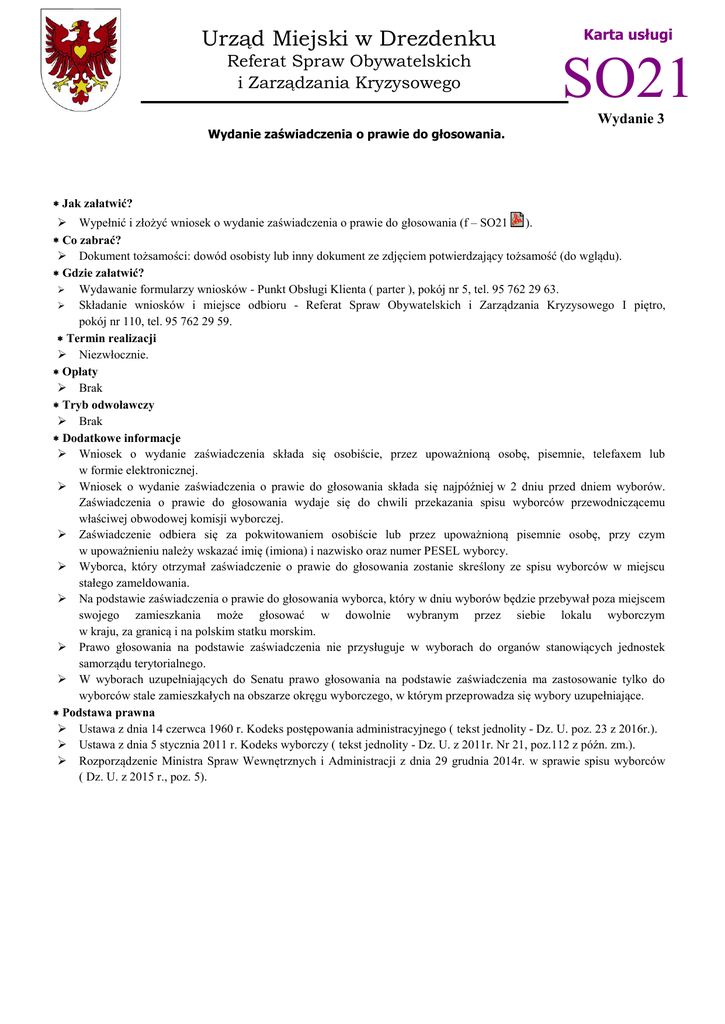 Urząd Miejski w Drezdenku Karta usługi Referat Spraw Obywatelskich i Zarządzania Kryzysowego SO21 W Wydanie 3 Wydanie zaświadczenia o prawie do głosowania. Jak załatwić? Wypełnić i złożyć wniosek o wydanie zaświadczenia o prawie do głosowania (f – SO21 ). Co zabrać? Dokument tożsamości: dowód osobisty lub inny dokument ze zdjęciem potwierdzający tożsamość (do wglądu). Gdzie załatwić? Wydawanie formularzy wniosków - Punkt Obsługi Klienta ( parter ), pokój nr 5, tel. 95 762 29 63. Składanie wniosków i miejsce odbioru - Referat Spraw Obywatelskich i Zarządzania Kryzysowego I piętro, pokój nr 110, tel. 95 762 29 59. Termin realizacji Niezwłocznie. Opłaty Brak Tryb odwoławczy Brak Dodatkowe informacje Wniosek o wydanie zaświadczenia składa się osobiście, przez upoważnioną osobę, pisemnie, telefaxem lub w formie elektronicznej. Wniosek o wydanie zaświadczenia o prawie do głosowania składa się najpóźniej w 2 dniu przed dniem wyborów. Zaświadczenia o prawie do głosowania wydaje się do chwili przekazania spisu wyborców przewodniczącemu właściwej obwodowej komisji wyborczej. Zaświadczenie odbiera się za pokwitowaniem osobiście lub przez upoważnioną pisemnie osobę, przy czym w upoważnieniu należy wskazać imię (imiona) i nazwisko oraz numer PESEL wyborcy. Wyborca, który otrzymał zaświadczenie o prawie do głosowania zostanie skreślony ze spisu wyborców w miejscu stałego zameldowania. Na podstawie zaświadczenia o prawie do głosowania wyborca, który w dniu wyborów będzie przebywał poza miejscem swojego zamieszkania może głosować w dowolnie wybranym przez siebie lokalu wyborczym w kraju, za granicą i na polskim statku morskim. Prawo głosowania na podstawie zaświadczenia nie przysługuje w wyborach do organów stanowiących jednostek samorządu terytorialnego. W wyborach uzupełniających do Senatu prawo głosowania na podstawie zaświadczenia ma zastosowanie tylko do wyborców stale zamieszkałych na obszarze okręgu wyborczego, w którym przeprowadza się wybory uzupełniające. Podstawa prawna Ustawa z dnia 14 czerwca 1960 r. Kodeks postępowania administracyjnego ( tekst jednolity - Dz. U. poz. 23 z 2016r.). Ustawa z dnia 5 stycznia 2011 r. Kodeks wyborczy ( tekst jednolity - Dz. U. z 2011r. Nr 21, poz.112 z późn. zm.). Rozporządzenie Ministra Spraw Wewnętrznych i Administracji z dnia 29 grudnia 2014r. w sprawie spisu wyborców ( Dz. U. z 2015 r., poz. 5).