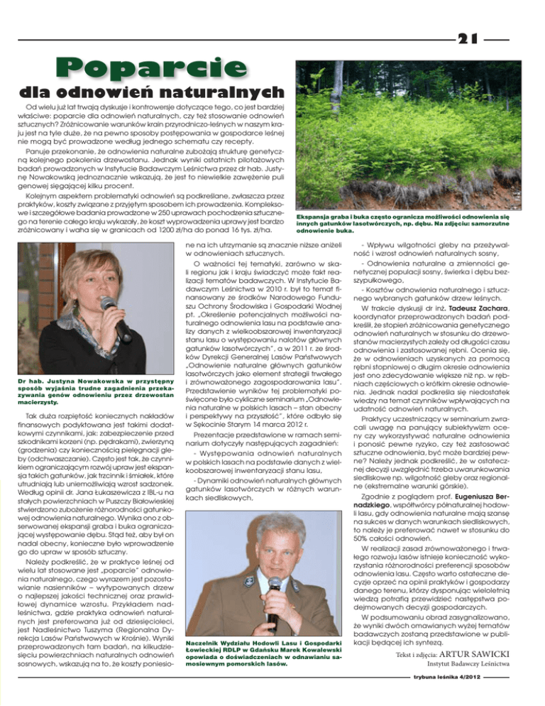 21 Poparcie dla odnowień naturalnych Od wielu już lat trwają dyskusje i kontrowersje dotyczące tego, co jest bardziej właściwe: poparcie dla odnowień naturalnych, czy też stosowanie odnowień sztucznych? Zróżnicowanie warunków krain przyrodniczo-leśnych w naszym kraju jest na tyle duże, że na pewno sposoby postępowania w gospodarce leśnej nie mogą być prowadzone według jednego schematu czy recepty. Panuje przekonanie, że odnowienia naturalne zubożają strukturę genetyczną kolejnego pokolenia drzewostanu. Jednak wyniki ostatnich pilotażowych badań prowadzonych w Instytucie Badawczym Leśnictwa przez dr hab. Justynę Nowakowską jednoznacznie wskazują, że jest to niewielkie zawężenie puli genowej sięgającej kilku procent. Kolejnym aspektem problematyki odnowień są podkreślane, zwłaszcza przez praktyków, koszty związane z przyjętym sposobem ich prowadzenia. Kompleksowe i szczegółowe badania prowadzone w 250 uprawach pochodzenia sztucznego na terenie całego kraju wykazały, że koszt wyprowadzenia uprawy jest bardzo zróżnicowany i waha się w granicach od 1200 zł/ha do ponad 16 tys. zł/ha. Ekspansja graba i buka często ogranicza możliwości odnowienia się innych gatunków lasotwórczych, np. dębu. Na zdjęciu: samorzutne odnowienie buka. ne na ich utrzymanie są znacznie niższe aniżeli w odnowieniach sztucznych. Dr hab. Justyna Nowakowska w przystępny sposób wyjaśnia trudne zagadnienia przekazywania genów odnowieniu przez drzewostan macierzysty. Tak duża rozpiętość koniecznych nakładów finansowych podyktowana jest takimi dodatkowymi czynnikami, jak: zabezpieczenie przed szkodnikami korzeni (np. pędrakami), zwierzyną (grodzenia) czy koniecznością pielęgnacji gleby (odchwaszczanie). Często jest tak, że czynnikiem ograniczającym rozwój upraw jest ekspansja takich gatunków, jak trzcinnik i śmiałek, które utrudniają lub uniemożliwiają wzrost sadzonek. Według opinii dr. Jana Łukaszewicza z IBL-u na stałych powierzchniach w Puszczy Białowieskiej stwierdzono zubożenie różnorodności gatunkowej odnowienia naturalnego. Wynika ono z obserwowanej ekspansji graba i buka ograniczającej występowanie dębu. Stąd też, aby był on nadal obecny, konieczne było wprowadzenie go do upraw w sposób sztuczny. Należy podkreślić, że w praktyce leśnej od wielu lat stosowane jest „poparcie” odnowienia naturalnego, czego wyrazem jest pozostawianie nasienników – wytypowanych drzew o najlepszej jakości technicznej oraz prawidłowej dynamice wzrostu. Przykładem nadleśnictwa, gdzie praktyka odnowień naturalnych jest preferowana już od dziesięcioleci, jest Nadleśnictwo Tuszyma (Regionalna Dyrekcja Lasów Państwowych w Krośnie). Wyniki przeprowadzonych tam badań, na kilkudziesięciu powierzchniach naturalnych odnowień sosnowych, wskazują na to, że koszty poniesio- O ważności tej tematyki, zarówno w skali regionu jak i kraju świadczyć może fakt realizacji tematów badawczych. W Instytucie Badawczym Leśnictwa w 2010 r. był to temat finansowany ze środków Narodowego Funduszu Ochrony Środowiska i Gospodarki Wodnej pt. „Określenie potencjalnych możliwości naturalnego odnowienia lasu na podstawie analizy danych z wielkoobszarowej inwentaryzacji stanu lasu o występowaniu nalotów głównych gatunków lasotwórczych”, a w 2011 r. ze środków Dyrekcji Generalnej Lasów Państwowych „Odnowienie naturalne głównych gatunków lasotwórczych jako element strategii trwałego i zrównoważonego zagospodarowania lasu”. Przedstawienie wyników tej problematyki poświęcone było cykliczne seminarium „Odnowienia naturalne w polskich lasach – stan obecny i perspektywy na przyszłość”, które odbyło się w Sękocinie Starym 14 marca 2012 r. Prezentacje przedstawione w ramach seminarium dotyczyły następujących zagadnień: - Występowania odnowień naturalnych w polskich lasach na podstawie danych z wielkoobszarowej inwentaryzacji stanu lasu, - Dynamiki odnowień naturalnych głównych gatunków lasotwórczych w różnych warunkach siedliskowych, - Wpływu wilgotności gleby na przeżywalność i wzrost odnowień naturalnych sosny, - Odnowienia naturalne a zmienności genetycznej populacji sosny, świerka i dębu bezszypułkowego, - Kosztów odnowienia naturalnego i sztucznego wybranych gatunków drzew leśnych. W trakcie dyskusji dr inż. Tadeusz Zachara, koordynator przeprowadzonych badań podkreślił, że stopień zróżnicowania genetycznego odnowień naturalnych w stosunku do drzewostanów macierzystych zależy od długości czasu odnowienia i zastosowanej rębni. Ocenia się, że w odnowieniach uzyskanych za pomocą rębni stopniowej o długim okresie odnowienia jest ono zdecydowanie większe niż np. w rębniach częściowych o krótkim okresie odnowienia. Jednak nadal podkreśla się niedostatek wiedzy na temat czynników wpływających na udatność odnowień naturalnych. Praktycy uczestniczący w seminarium zwracali uwagę na panujący subiektywizm oceny czy wykorzystywać naturalne odnowienia i ponosić pewne ryzyko, czy też zastosować sztuczne odnowienia, być może bardziej pewne? Należy jednak podkreślić, że w ostatecznej decyzji uwzględnić trzeba uwarunkowania siedliskowe np. wilgotność gleby oraz regionalne (ekstremalne warunki górskie). Zgodnie z poglądem prof. Eugeniusza Bernadzkiego, współtwórcy półnaturalnej hodowli lasu, gdy odnowienia naturalne mają szansę na sukces w danych warunkach siedliskowych, to należy je preferować nawet w stosunku do 50% całości odnowień. W realizacji zasad zrównoważonego i trwałego rozwoju lasów istnieje konieczność wykorzystania różnorodności preferencji sposobów odnowienia lasu. Często warto ostateczne decyzje oprzeć na opinii praktyków i gospodarzy danego terenu, którzy dysponując wieloletnią wiedzą potrafią przewidzieć następstwa podejmowanych decyzji gospodarczych. Naczelnik Wydziału Hodowli Lasu i Go