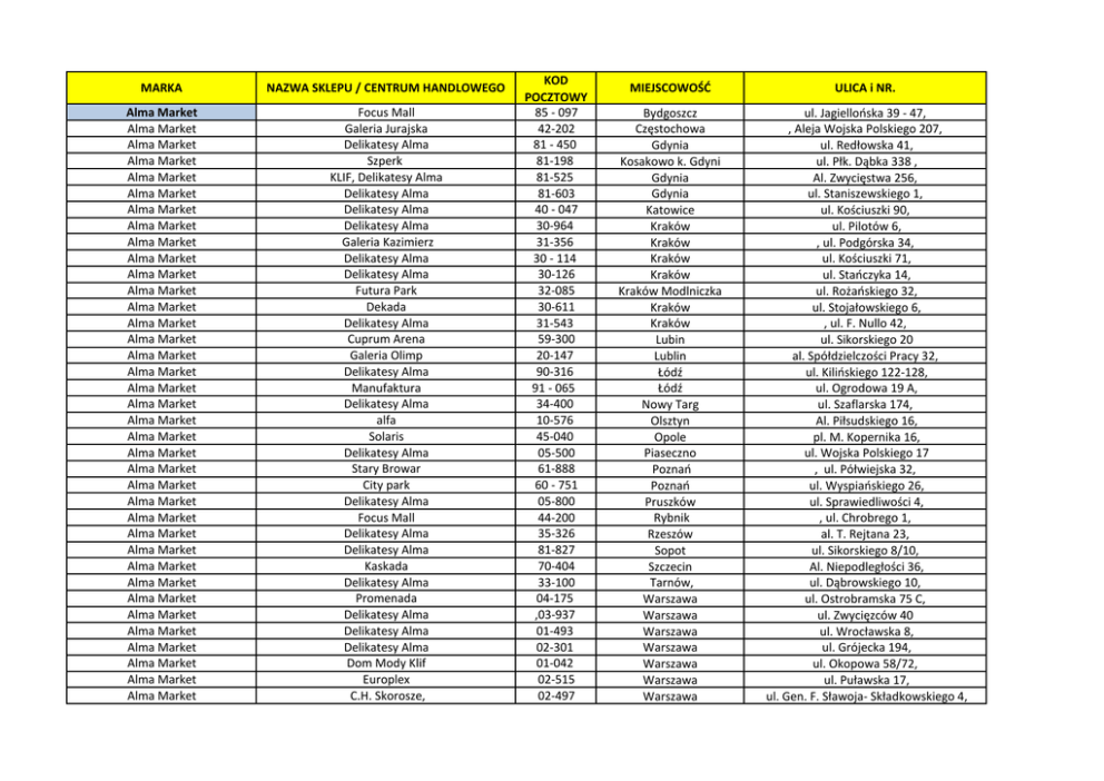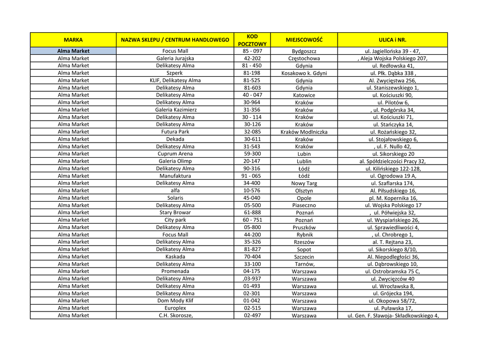 MARKA NAZWA SKLEPU / CENTRUM HANDLOWEGO Alma Market Alma Market Alma Market Alma Market Alma Market Alma Market Alma Market Alma Market Alma Market Alma Market Alma Market Alma Market Alma Market Alma Market Alma Market Alma Market Alma Market Alma Market Alma Market Alma Market Alma Market Alma Market Alma Market Alma Market Alma Market Alma Market Alma Market Alma Market Alma Market Alma Market Alma Market Alma Market Alma Market Alma Market Alma Market Alma Market Alma Market Focus Mall Galeria Jurajska Delikatesy Alma Szperk KLIF, Delikatesy Alma Delikatesy Alma Delikatesy Alma Delikatesy Alma Galeria Kazimierz Delikatesy Alma Delikatesy Alma Futura Park Dekada Delikatesy Alma Cuprum Arena Galeria Olimp Delikatesy Alma Manufaktura Delikatesy Alma alfa Solaris Delikatesy Alma Stary Browar City park Delikatesy Alma Focus Mall Delikatesy Alma Delikatesy Alma Kaskada Delikatesy Alma Promenada Delikatesy Alma Delikatesy Alma Delikatesy Alma Dom Mody Klif Europlex C.H. Skorosze, KOD POCZTOWY 85 - 097 42-202 81 - 450 81-198 81-525 81-603 40 - 047 30-964 31-356 30 - 114 30-126 32-085 30-611 31-543 59-300 20-147 90-316 91 - 065 34-400 10-576 45-040 05-500 61-888 60 - 751 05-800 44-200 35-326 81-827 70-404 33-100 04-175 ,03-937 01-493 02-301 01-042 02-515 02-497 MIEJSCOWOŚĆ ULICA i NR. Bydgoszcz Częstochowa Gdynia Kosakowo k. Gdyni Gdynia Gdynia Katowice Kraków Kraków Kraków Kraków Kraków Modlniczka Kraków Kraków Lubin Lublin Łódź Łódź Nowy Targ Olsztyn Opole Piaseczno Poznań Poznań Pruszków Rybnik Rzeszów Sopot Szczecin Tarnów, Warszawa Warszawa Warszawa Warszawa Warszawa Warszawa Warszawa ul. Jagiellońska 39 - 47, , Aleja Wojska Polskiego 207, ul. Redłowska 41, ul. Płk. Dąbka 338 , Al. Zwycięstwa 256, ul. Staniszewskiego 1, ul. Kościuszki 90, ul. Pilotów 6, , ul. Podgórska 34, ul. Kościuszki 71, ul. Stańczyka 14, ul. Rożańskiego 32, ul. Stojałowskiego 6, , ul. F. Nullo 42, ul. Sikorskiego 20 al. Spółdzielczości Pracy 32, ul. Kilińskiego 122-128, ul. Ogrodowa 19 A, ul. Szaflarska 174, Al. Piłsudskiego 16, pl. M. Kopernika 16, ul. Wojska Polskiego 17 , ul. Półwiejska 32, ul. Wyspiańskiego 26, ul. Sprawiedliwości 4, , ul. Chrobrego 1, al. T. Rejtana 23, ul. Sikorskiego 8/10, Al. Niepodległości 36, ul. Dąbrowskiego 10, ul. Ostrobramska 75 C, ul. Zwycięzców 40 ul. Wrocławska 8, ul. Grójecka 194, ul. Okopowa 58/72, ul. Puławska 17, ul. Gen. F. Sławoja- Składkowskiego 4, Alma Market Alma Market Alma Market Alma Market Alma Market Alma Market Stara Papiernia Delikatesy Alma Arkady Wrocławskie, Bielany Wrocławskie, Renoma, Focus Mall 05-520 ,02-972 53-332 55-040 50-024 65-427 Konstancin Jeziorna Warszawa Wrocław Wrocław Wrocław Zielona Góra al. Wojska Polskiego 3, lok. 46, al. Rzeczypospolitej 1 ul. Powstańców Śląskich 2-4, ul. Czekoladowa 9, , Renoma, ul. Świdnicka 40, ul. Wrocławska 17,
