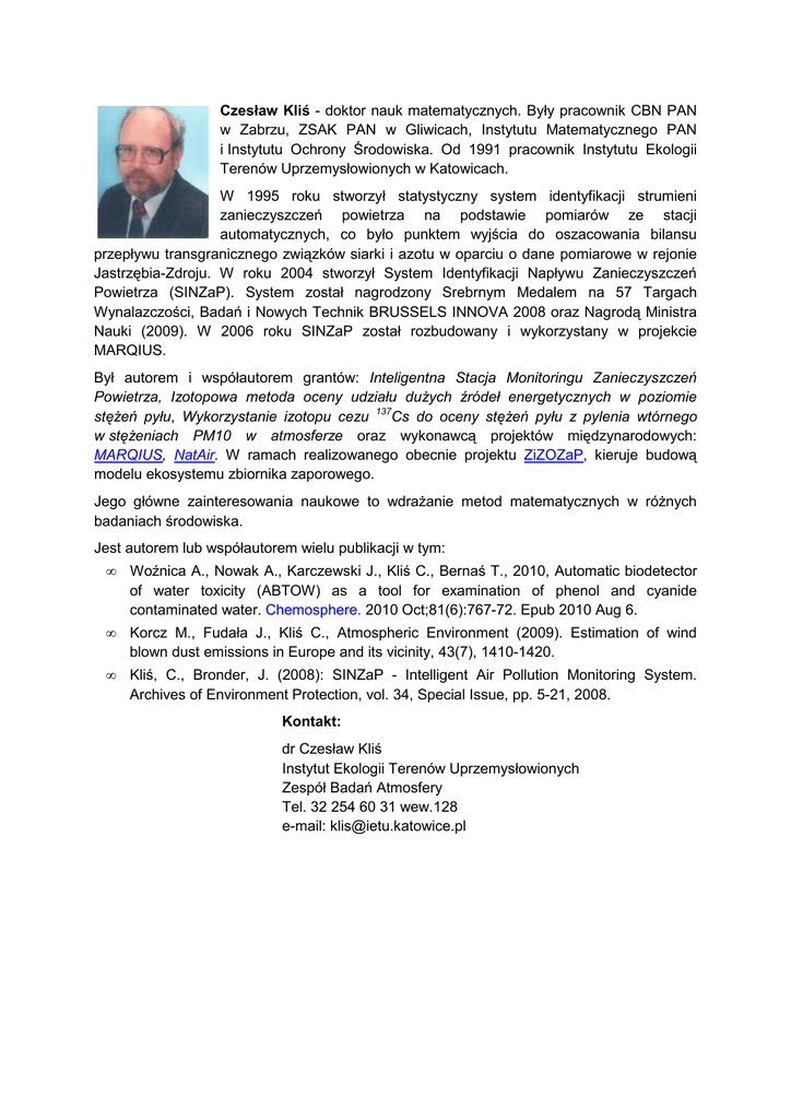 Czesław Kliś - doktor nauk matematycznych. Były pracownik CBN PAN w Zabrzu, ZSAK PAN w Gliwicach, Instytutu Matematycznego PAN i Instytutu Ochrony Środowiska. Od 1991 pracownik Instytutu Ekologii Terenów Uprzemysłowionych w Katowicach. W 1995 roku stworzył statystyczny system identyfikacji strumieni zanieczyszczeń powietrza na podstawie pomiarów ze stacji automatycznych, co było punktem wyjścia do oszacowania bilansu przepływu transgranicznego związków siarki i azotu w oparciu o dane pomiarowe w rejonie Jastrzębia-Zdroju. W roku 2004 stworzył System Identyfikacji Napływu Zanieczyszczeń Powietrza (SINZaP). System został nagrodzony Srebrnym Medalem na 57 Targach Wynalazczości, Badań i Nowych Technik BRUSSELS INNOVA 2008 oraz Nagrodą Ministra Nauki (2009). W 2006 roku SINZaP został rozbudowany i wykorzystany w projekcie MARQIUS. Był autorem i współautorem grantów: Inteligentna Stacja Monitoringu Zanieczyszczeń Powietrza, Izotopowa metoda oceny udziału dużych źródeł energetycznych w poziomie stężeń pyłu, Wykorzystanie izotopu cezu 137Cs do oceny stężeń pyłu z pylenia wtórnego w stężeniach PM10 w atmosferze oraz wykonawcą projektów międzynarodowych: MARQIUS, NatAir. W ramach realizowanego obecnie projektu ZiZOZaP, kieruje budową modelu ekosystemu zbiornika zaporowego. Jego główne zainteresowania naukowe to wdrażanie metod matematycznych w różnych badaniach środowiska. Jest autorem lub współautorem wielu publikacji w tym: • Woźnica A., Nowak A., Karczewski J., Kliś C., Bernaś T., 2010, Automatic biodetector of water toxicity (ABTOW) as a tool for examination of phenol and cyanide contaminated water. Chemosphere. 2010 Oct;81(6):767-72. Epub 2010 Aug 6. • Korcz M., Fudała J., Kliś C., Atmospheric Environment (2009). Estimation of wind blown dust emissions in Europe and its vicinity, 43(7), 1410-1420. • Kliś, C., Bronder, J. (2008): SINZaP - Intelligent Air Pollution Monitoring System. Archives of Environment Protection, vol. 34, Special Issue, pp. 5-21, 2008. Kontakt: dr Czesław Kliś Instytut Ekologii Terenów Uprzemysłowionych Zespół Badań Atmosfery Tel. 32 254 60 31 wew.128 e-mail: [email protected]