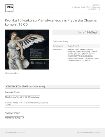 DUX S.J. Ul. Morskie Oko 2, 02-511 Warszawa +48 22 849 11 3 Kronika 15 konkursu Pianistycznego im. Fryderyka Chopina komplet 15 CD Cena: 114,00 pln Opis słownikowy Kompozytorzy Chopin, Fryderyk ∎ Wykonawcy Hyek Lim, Dong ∎, Kawamura, Fumio ∎, Kawamura, Hisako ∎, Keduk, Kirył ∎, Kikuchi, Yusuke ∎, Kim, Ben ∎, Kiyozuka, Shinya ∎, Kończal, Szczepan ∎, Kortus, Jacek ∎, Kozlowa, Olga ∎, Kudo, Rachel Naomi ∎, Latonen, Timo Herman ∎, Lee, Ka Ling Coleen ∎, Levkovich, Dmitri ∎, Lin, Wei-Chi ∎ Opis produktu CD DUX KCh 15-01Total time: [69:45] Fryderyk Chopin Etiuda c-moll op. 10 nr 12 “Rewolucyjna” 1. Etiuda c-moll op. 10 nr 12 – Fumio Kawamura (18, Japonia) [02:46] Fryderyk Chopin Wariacje B-dur op. 12 Plik wygenerowano: 04-03-2017 Oprogramowanie sklepu: AptusShop DUX S.J. Ul. Morskie Oko 2, 02-511 Warszawa +48 22 849 11 3 2. Wariacje B-dur op. 12 na temat „Je vends des Scapulaires” – Hisako Kawamura (19, Japonia) [07:48] Fryderyk Chopin Etiuda cis-moll op. 10 nr 4 3. Etiuda cis-moll op. 10 nr 4 – Kirył Keduk (20, Białoruś) [01:59] Fryderyk Chopin Etiuda F-dur op. 10 nr 8 4. Etiuda F-dur op. 10 nr 8 – Yusuke Kikuchi (21, Japonia) [02:15] Fryderyk Chopin Nokturn fis-moll op. 48 nr 2 5. Nokturn fis-moll op. 48 nr 2 – Ben Kim (22, USA) [07:35] Fryderyk Chopin Etiuda gis-moll op. 25 nr 6 6. Etiuda gis-moll op. 25 nr 6 – Shinya Kiyozuka (23, Japonia) [01:44] Fryderyk Chopin Nokturn E-dur op. 62 nr 2 7. Nokturn E-dur op. 62 nr 2 – Szczepan Kończal (24, Polska) [05:18] Plik wygenerowano: 04-03-2017 Oprogramowanie sklepu: AptusShop DUX S.J. Ul. Morskie Oko 2, 02-511 Warszawa +48 22 849 11 3 Fryderyk Chopin Scherzo h-moll op. 20 8. Scherzo h-moll op. 20 – Jacek Kortus (25, Polska) [09:42] Fryderyk Chopin Impromptu Ges-dur op. 51 9. Impromptu Ges-dur op. 51 – Olga Kozlova (26, Rosja) [04:57] Fryderyk Chopin Preludium Fis-dur op. 28 nr 13 10. Preludium Fis-dur op. 28 nr 13 – Rachel Naomi Kudo (27, USA) [03:08] Fryderyk Chopin Preludium es-moll op. 28 nr 14 11. Preludium es-moll op. 28 nr 14 – Rachel Naomi Kudo (27, USA) [00:29] Fryderyk Chopin Nokturn cis-moll op. 27 nr 1 12. Nokturn cis-moll op. 27 nr 1 – Timo Herman Latonen (28, Finlandia) [05:10] Plik wygenerowano: 04-03-2017 Oprogramowanie sklepu: AptusShop DUX S.J. Ul. Morskie Oko 2, 02-511 Warszawa +48 22 849 11 3 Fryderyk Chopin Etiuda e-moll op. 25 nr 5 13. Etiuda e-moll op. 25 nr 5 – Ka Ling Colleen Lee (29, Chiny-Hong Kong) [03:10] Fryderyk Chopin Tarantella As-dur op. 43 14. Tarantella As-dur op. 43 – Dmitri Levkovich (30, Kanada) [02:56] Fryderyk Chopin Walc F-dur op. 34 nr 3 15. Walc F-dur op. 34 nr 3 – Dong Hyek Lim (31, Korea Płd.) [02:03] Fryderyk Chopin Nokturn c-moll op. 48 nr 1 16. Nokturn c-moll op. 48 nr 1 – Wei-Chi Lin (33, Tajwan) [07:13] CD DUX KCh 15-02Total time: [73:01] Fryderyk Chopin Walc a-moll op. 34 nr 2 1. Walc a-moll op. 34 nr 2 – Jędrzej Lisiecki (34, Polska) [5:12] Plik wygenerowano: 04-03-2017 Oprogramowanie sklepu: AptusShop DUX S.J. Ul. Morskie Oko 2, 02-511 Warszawa +48 22 849 11 3 Fryderyk Chopin Etiuda c-moll op. 10 nr 12 “Rewolucyjna” 2. Etiuda c-moll op. 10 nr 12 – Igor Lovchinsky (35, USA) [2:36] Fryderyk Chopin Walc As-dur op. 64 nr 3 3. Walc As-dur op. 64 nr 3 – Takuro Maeda (36, Japonia) [3:05] Fryderyk Chopin Walc Des-dur op. 64 nr 1 „Minutowy“ 4. Walc Des-dur op. 64 nr 1 – Miloš Mihajlović (37, Serbia) [1:54] Fryderyk Chopin Preludium cis-moll op. 45 5. Preludium cis-moll op. 45 – Aleksandra Mikulska (38, Polska) [5:07] Fryderyk Chopin Nokturn H-dur op. 9 nr 3 6. Nokturn H-dur op. 9 nr 3 – Maiko Mine (39, Japonia) [6:26] Plik wygenerowano: 04-03-2017 Oprogramowanie sklepu: AptusShop DUX S.J. Ul. Morskie Oko 2, 02-511 Warszawa +48 22 849 11 3 Fryderyk Chopin Preludium F-dur op. 28 nr 23 7. Preludium F-dur op. 28 nr 23 – Aleksandra Mozgiel (40, Polska) [0:58] Fryderyk Chopin Preludium d-moll op. 28 nr 24 8. Preludium d-moll op. 28 nr 24 – Aleksandra Mozgiel (40, Polska) [2:37] Fryderyk Chopin Etiuda e-moll op. 25 nr 5 9. Etiuda e-moll op. 25 nr 5 – Marko Mustonen (41, Finlandia) [3:20] Fryderyk Chopin Walc As-dur op. 42 10. Walc As-dur op. 42 – Howard Na (42, USA) [3:41] Fryderyk Chopin Etiuda cis-moll op. 10 nr 4 11. Etiuda cis-moll op. 10 nr 4 – Kotaro Nagano (43, Japonia) [2:12] Fryderyk Chopin Plik wygenerowano: 04-03-2017 Oprogramowanie sklepu: AptusShop DUX S.J. Ul. Morskie Oko 2, 02-511 Warszawa +48 22 849 11 3 Nokturn G-dur op. 37 nr 2 12. Nokturn G-dur op. 37 nr 2 – Rieko Nezu (44, Japonia) [5:38] Fryderyk Chopin Etiuda As-dur op. 10 nr 10 13. Etiuda As-dur op. 10 nr 10 – Miku Omine (45, Japonia) [2:16] Fryderyk Chopin Etiuda a-moll op. 10 nr 2 14. Etiuda a-moll op. 10 nr 2 – Yuma Osaki (46, Japonia) [1:22] Fryderyk Chopin Walc As-dur op. 34 nr 1 15. Walc As-dur op. 34 nr 1 – Esther Park (47, USA) [4:50] Fryderyk Chopin Etiuda a-moll op. 10 nr 2 16. Etiuda a-moll op. 10 nr 2 – Maxence Pilchen (48, Belgia) [1:22] Fryderyk Chopin Nokturn fis-moll op. 48 nr 2 Plik wygenerowano: 04-03-2017 Oprogramowanie sklepu: AptusShop DUX S.J. Ul. Morskie Oko 2, 02-511 Warszawa +48 22 849 11 3 17. Nokturn fis-moll op. 48 nr 2 – Maciej Piszek (49, Polska) [7:49] Fryderyk Chopin Preludium g-moll op. 28 nr 22 18. Preludium g-moll op. 28 nr 22 – Marianna Prjevalskaya (50, Hiszpania) [0:43] Fryderyk Chopin Preludium F-dur op. 28 nr 23 19. Preludium F-dur op. 28 nr 23 – Marianna Prjevalskaya (50, Hiszpania) [1:05] Fryderyk Chopin Etiuda As-dur op. 10 nr 10 20. Etiuda As-dur op. 10 nr 10 – Monika Quinn (51, Polska) [2:30] Fryderyk Chopin Walc As-dur op. 34 nr 1 21. Walc As-dur op. 34 nr 1 – Mayumi Sakamoto (52, Japonia) [4:36] Fryderyk Chopin Walc As-dur op. 42 22. Walc As-dur op. 42 – Takaya Sano (53, Japonia) [3:47] Plik wygenerowano: 04-03-2017 Oprogramowanie sklepu: AptusShop DUX S.J. Ul. Morskie Oko 2, 02-511 Warszawa +48 22 849 11 3 CD DUX KCh 15-03Total time: [77:49] Fryderyk Chopin E
