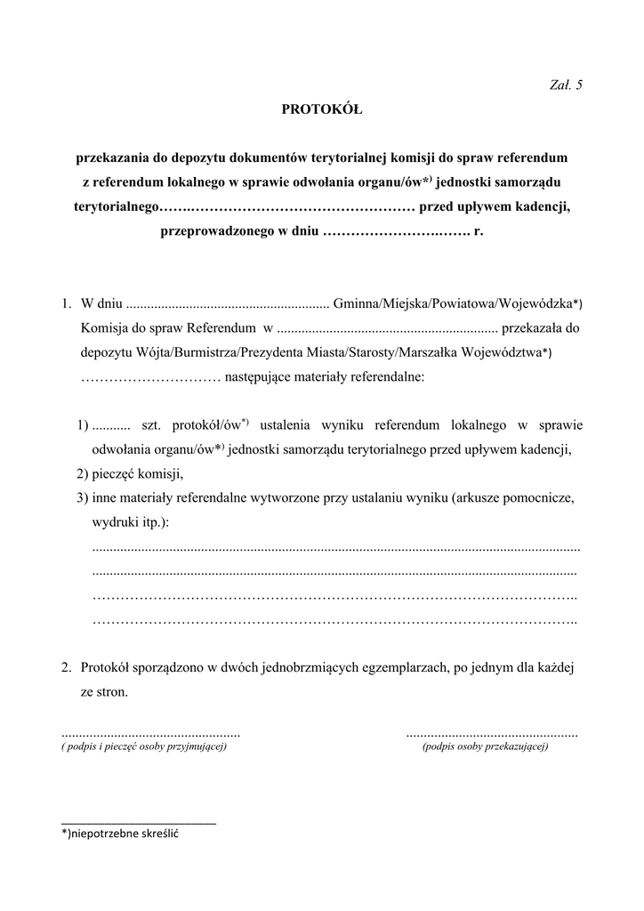 Zał. 5 PROTOKÓŁ przekazania do depozytu dokumentów terytorialnej komisji do spraw referendum z referendum lokalnego w sprawie odwołania organu/ów*) jednostki samorządu terytorialnego…….………………………………………… przed upływem kadencji, przeprowadzonego w dniu …………………….……. r. 1. W dniu .......................................................... Gminna/Miejska/Powiatowa/Wojewódzka*) Komisja do spraw Referendum w ............................................................... przekazała do depozytu Wójta/Burmistrza/Prezydenta Miasta/Starosty/Marszałka Województwa*) ………………………… następujące materiały referendalne: 1) ........... szt. protokół/ów*) ustalenia wyniku referendum lokalnego w sprawie odwołania organu/ów*) jednostki samorządu terytorialnego przed upływem kadencji, 2) pieczęć komisji, 3) inne materiały referendalne wytworzone przy ustalaniu wyniku (arkusze pomocnicze, wydruki itp.): ........................................................................................................................................... .......................................................................................................................................... ………………………………………………………………………………………….. ………………………………………………………………………………………….. 2. Protokół sporządzono w dwóch jednobrzmiących egzemplarzach, po jednym dla każdej ze stron. ................................................... ( podpis i pieczęć osoby przyjmującej) _________________________ *)niepotrzebne skreślić ................................................. (podpis osoby przekazującej)