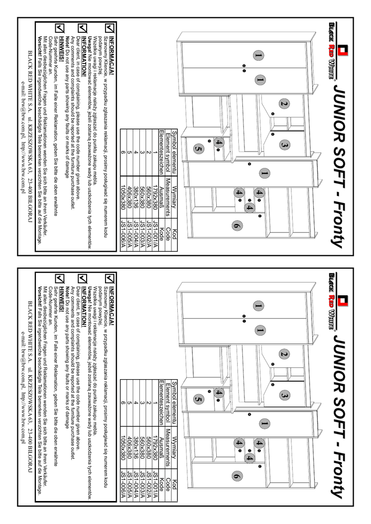 R 1 B LACK R ED W HITE 1 3 1 4 4 4 6 JUNIOR SOFT - Fronty 2 4 5 Kod Code Kode JS1-001/A JS1-002/A JS1-003/A JS1-004/A JS1-005/A JS1-006/A R 1 B LACK R ED W HITE 1 þ INFORMACJA! Symbol elementu Wymiary Element symbol Measurements Elementeszeichen Ausmaß 1 1792x380 2 560x380 3 560x380 4 380x136 5 406x380 6 1050x380 þ INFORMACJA! 3 1 4 4 4 Kod Code Kode JS1-001/A JS1-002/A JS1-003/A JS1-004/A JS1-005/A JS1-006/A 6 JUNIOR SOFT - Fronty 2 4 5 Symbol elementu Wymiary Element symbol Measurements Elementeszeichen Ausmaß 1 1792x380 2 560x380 3 560x380 4 380x136 5 406x380 6 1050x380 BLACK RED WHITE S.A. ul. KRZESZOWSKA 63, 23-400 BI£GORAJ e-mail: [email protected], http://www.brw.com.pl Sehr geehrte Kunden, im Falle einer Reklamation, geben Sie bitte die oben erwähnte Code-Nummer an. Mit allen diesbezüglichen Fragen und Reklamationen wenden Sie sich bitte an ihren Verkäufer. Vorsicht! Falls Sie irgendwelche beschädigte Teile bemerken verzichten Sie bitte auf die Montage. Dear client, in case of complaining, please use the code number given above. Any comments and complaints should be reported at the furniture purchase outlet. Note! Do not use any parts showing any faults or marks of damage Szanowny Kliencie, w przypadku zg³aszania reklamacji, prosimy pos³ugiwaæ siê numerem kodu podanym powy¿ej. Wszelkie uwagi i reklamacje nale¿y zg³aszaæ do punktu zakupu mebla. Uwaga! Nie montowaæ elementów, je¿eli zostan¹ zauwa¿one wady lub uszkodzenia tych elementów. þ INFORMATION! Szanowny Kliencie, w przypadku zg³aszania reklamacji, prosimy pos³ugiwaæ siê numerem kodu podanym powy¿ej. Wszelkie uwagi i reklamacje nale¿y zg³aszaæ do punktu zakupu mebla. Uwaga! Nie montowaæ elementów, je¿eli zostan¹ zauwa¿one wady lub uszkodzenia tych elementów. þ INFORMATION! þ HINWEIS! Dear client, in case of complaining, please use the code number given above. Any comments and complaints should be reported at the furniture purchase outlet. Note! Do not use any parts showing any faults or marks of damage þ HINWEIS! Sehr geehrte Kunden, im Falle einer Reklamation, geben Sie bitte die oben erwähnte Code-Nummer an. Mit allen diesbezüglichen Fragen und Reklamationen wenden Sie sich bitte an ihren Verkäufer. Vorsicht! Falls Sie irgendwelche beschädigte Teile bemerken verzichten Sie bitte auf die Montage. BLACK RED WHITE S.A. ul. KRZESZOWSKA 63, 23-400 BI£GORAJ e-mail: [email protected], http://www.brw.com.pl R 1 B LACK R ED W HITE 1 3 1 4 4 4 6 JUNIOR SOFT - Fronty 2 4 5 Kod Code Kode JS1-001/A JS1-002/A JS1-003/A JS1-004/A JS1-005/A JS1-006/A R 1 B LACK R ED W HITE 1 þ INFORMACJA! Symbol elementu Wymiary Element symbol Measurements Elementeszeichen Ausmaß 1 1792x380 2 560x380 3 560x380 4 380x136 5 406x380 6 1050x380 þ INFORMACJA! 3 1 4 4 4 Kod Code Kode JS1-001/A JS1-002/A JS1-003/A JS1-004/A JS1-005/A JS1-006/A 6 JUNIOR SOFT - Fronty 2 4 5 Symbol elementu Wymiary Element symbol Measurements Elementeszeichen Ausmaß 1 1792x380 2 560x380 3 560x380 4 380x136 5 406x380 6 1050x380 BLACK RED WHITE S.A. ul. KRZESZOWSKA 63, 23-400 BI£GORAJ e-mail: [email protected], http://www.brw.com.pl Sehr geehrte Kunden, im Falle einer Reklamation, geben Sie bitte die oben erwähnte Code-Nummer an. Mit allen diesbezüglichen Fragen und Reklamationen wenden Sie sich bitte an ihren Verkäufer. Vorsicht! Falls Sie irgendwelche beschädigte Teile bemerken verzichten Sie bitte auf die Montage. Dear client, in case of complaining, please use the code number given above. Any comments and complaints should be reported at the furniture purchase outlet. Note! Do not use any parts showing any faults or marks of damage Szanowny Kliencie, w przypadku zg³aszania reklamacji, prosimy pos³ugiwaæ siê numerem kodu podanym powy¿ej. Wszelkie uwagi i reklamacje nale¿y zg³aszaæ do punktu zakupu mebla. Uwaga! Nie montowaæ elementów, je¿eli zostan¹ zauwa¿one wady lub uszkodzenia tych elementów. þ INFORMATION! Szanowny Kliencie, w przypadku zg³aszania reklamacji, prosimy pos³ugiwaæ siê numerem kodu podanym powy¿ej. Wszelkie uwagi i reklamacje nale¿y zg³aszaæ do punktu zakupu mebla. Uwaga! Nie montowaæ elementów, je¿eli zostan¹ zauwa¿one wady lub uszkodzenia tych elementów. þ INFORMATION! þ HINWEIS! Dear client, in case of complaining, please use the code number given above. Any comments and complaints should be reported at the furniture purchase outlet. Note! Do not use any parts showing any faults or marks of damage þ HINWEIS! Sehr geehrte Kunden, im Falle einer Reklamation, geben Sie bitte die oben erwähnte Code-Nummer an. Mit allen diesbezüglichen Fragen und Reklamationen wenden Sie sich bitte an ihren Verkäufer. Vorsicht! Falls Sie irgendwelche beschädigte Teile bemerken verzichten Sie bitte auf die Montage. BLACK RED WHITE S.A. ul. KRZESZOWSKA 63, 23-400 BI£GORAJ e-mail: [email protected], http://www.brw.com.pl
