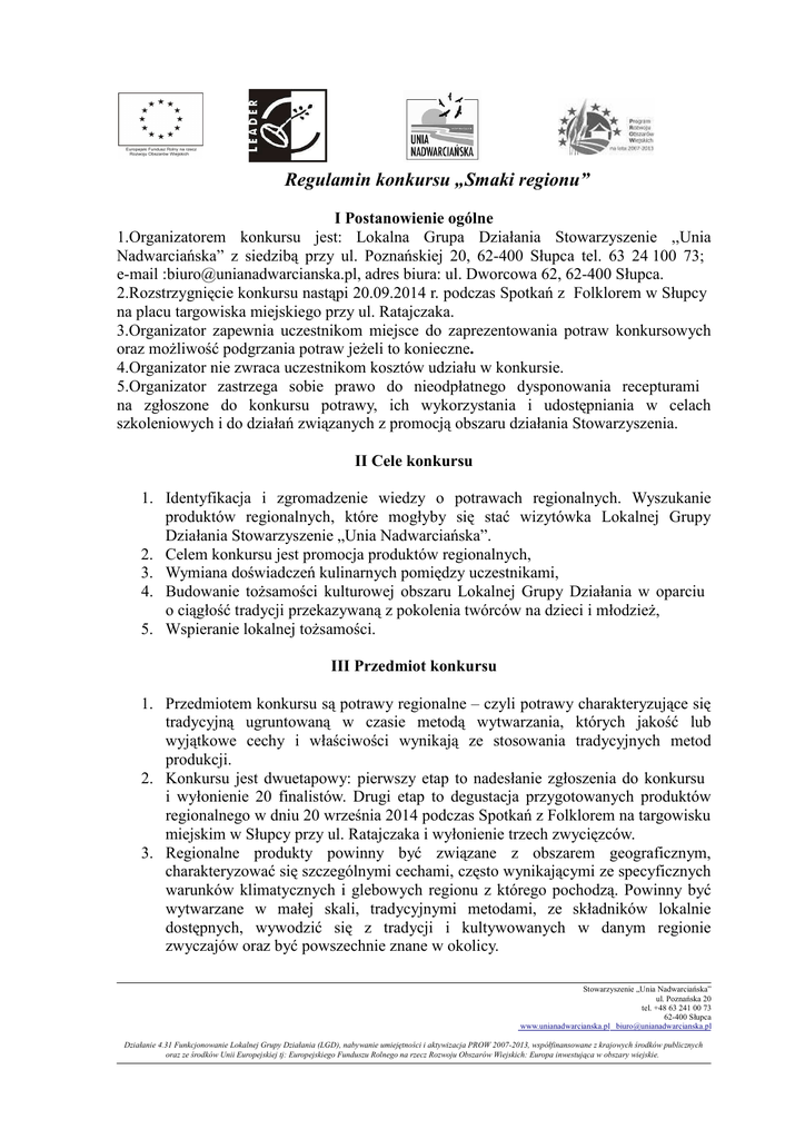 Regulamin konkursu „Smaki regionu” I Postanowienie ogólne 1.Organizatorem konkursu jest: Lokalna Grupa Działania Stowarzyszenie ,,Unia Nadwarciańska” z siedzibą przy ul. Poznańskiej 20, 62-400 Słupca tel. 63 24 100 73; e-mail :[email protected], adres biura: ul. Dworcowa 62, 62-400 Słupca. 2.Rozstrzygnięcie konkursu nastąpi 20.09.2014 r. podczas Spotkań z Folklorem w Słupcy na placu targowiska miejskiego przy ul. Ratajczaka. 3.Organizator zapewnia uczestnikom miejsce do zaprezentowania potraw konkursowych oraz możliwość podgrzania potraw jeżeli to konieczne. 4.Organizator nie zwraca uczestnikom kosztów udziału w konkursie. 5.Organizator zastrzega sobie prawo do nieodpłatnego dysponowania recepturami na zgłoszone do konkursu potrawy, ich wykorzystania i udostępniania w celach szkoleniowych i do działań związanych z promocją obszaru działania Stowarzyszenia. II Cele konkursu 1. Identyfikacja i zgromadzenie wiedzy o potrawach regionalnych. Wyszukanie produktów regionalnych, które mogłyby się stać wizytówka Lokalnej Grupy Działania Stowarzyszenie „Unia Nadwarciańska”. 2. Celem konkursu jest promocja produktów regionalnych, 3. Wymiana doświadczeń kulinarnych pomiędzy uczestnikami, 4. Budowanie tożsamości kulturowej obszaru Lokalnej Grupy Działania w oparciu o ciągłość tradycji przekazywaną z pokolenia twórców na dzieci i młodzież, 5. Wspieranie lokalnej tożsamości. III Przedmiot konkursu 1. Przedmiotem konkursu są potrawy regionalne – czyli potrawy charakteryzujące się tradycyjną ugruntowaną w czasie metodą wytwarzania, których jakość lub wyjątkowe cechy i właściwości wynikają ze stosowania tradycyjnych metod produkcji. 2. Konkursu jest dwuetapowy: pierwszy etap to nadesłanie zgłoszenia do konkursu i wyłonienie 20 finalistów. Drugi etap to degustacja przygotowanych produktów regionalnego w dniu 20 września 2014 podczas Spotkań z Folklorem na targowisku miejskim w Słupcy przy ul. Ratajczaka i wyłonienie trzech zwycięzców. 3. Regionalne produkty powinny być związane z obszarem geograficznym, charakteryzować się szczególnymi cechami, często wynikającymi ze specyficznych warunków klimatycznych i glebowych regionu z którego pochodzą. Powinny być wytwarzane w małej skali, tradycyjnymi metodami, ze składników lokalnie dostępnych, wywodzić się z tradycji i kultywowanych w danym regionie zwyczajów oraz być powszechnie znane w okolicy. Stowarzyszenie „Unia Nadwarciańska” ul. Poznańska 20 tel. +48 63 241 00 73 62-400 Słupca www.unianadwarcianska.pl [email protected] Działanie 4.31 Funkcjonowanie Lokalnej Grupy Działania (LGD), nabywanie umiejętności i aktywizacja PROW 2007-2013, współfinansowane z krajowych środków publicznych oraz ze środków Unii Europejskiej tj: Europejskiego Funduszu Rolnego na rzecz Rozwoju Obszarów Wiejskich: Europa inwestująca w obszary wiejskie. IV Warunki uczestnictwa w konkursie 1.Uczestnikami konkursu mogą być: - Osoby indywidualne, mieszkańcy obszaru Lokalnej Grupy Działania tj. gmin: Lądek, Zagórów, Słupca, Strzałkowo, Powidz, - Zbiorowo - organizacje formalne i nieformalne, Koła Gospodyń Wiejskich, a także grupy zainteresowane uczestnictwem. - Gospodarstwa agroturystyczne i ekologiczne z obszaru LGD. 2.Uczestnikami konkursu nie mogą być przedstawiciele organizatora, członkowie komisji oceniającej potrawy oraz ich bliscy. 3. Jeden uczestnik/organizacja/grupa-może zgłosić do konkursu tylko jedną potrawę. 4.Warunkiem udziału jest: a) kompletne wypełnienie i terminowe złożenie karty zgłoszenia, która musi zawierać: - nazwę potrawy, - zdjęcie potrawy, - wyszczególnione składniki z proporcjami podanymi na ilość porcji, - opis wykonania, - informację o źródłowym pochodzeniu receptury, tradycji potrawy, udokumentowanie pochodzenia regionalnego. b) przesłanie zgłoszenia poczta bądź elektronicznie, c) akceptacja zasad określonych w regulaminie, 5. Organizator zapewnia: - stoisko wystawiennicze przeznaczone do prezentacji i degustacji potraw przez jury, - możliwość podgrzania potraw podawanych na ciepło. 6. Uczestnik we własnym zakresie organizuje: c) według własnego uznania, we własnym zakresie i na własny koszt niezbędne do prezentacji i degustacji naczynia i sprzęt. d) zaprezentowanie konkursowej potrawy jury podczas drugiego etapu w dniu 20 września 2014 r. podczas Spotkań z Folklorem na targowisku miejskim w Słupcy. V Harmonogram konkursu 1.Zgłoszenia do konkursu „Smaki regionu” przyjmowane są od 2 czerwca do 18 lipca 2014 r. 2.Wypełnioną kartę zgłoszeniową można złożyć osobiście lub przesłać pocztą do biura na adres biura: Stowarzyszenie ,,Unia Nadwarciańska” ul. Dworcowa 62, 62-400 Słupca. UWAGA!!!O terminie przyjęcia zgłoszenia-decyduje data wpływu do Organizatora! 3.Do 15 sierpnia 2014 r. jury wybierze z pośród nadesłanych zgłoszeń 20 półfinalistów i zakwalifikuje ich do drugiego etapu konkursu. 4.Drugi etap konkursu i degustacja wybranych do prezentacji potraw odbędzie się 20 września 2014 roku podczas Spotkań z Folklorem na targowisku w Słupcy. W tym dniu odbędzie się również ostateczne rozstrzygniecie konkursu i przyznanie trzech miejsc. Stowarzyszenie „Unia Nadwarciańska” ul. Poznańska 20 tel. +48 63 241 00 73 62-400 Słupca www.unianadwarcianska.pl [email protected] Działanie 4.31 Funkcjonowanie Lokalnej Grupy Działania (LGD), nabywanie umiejętności i aktywizacja PROW 2007-2013, współfinansowane z krajowych środków publicznych oraz ze środków Unii Europejskiej tj: Europejskiego Funduszu Rolnego na rzecz Rozwoju Obszarów Wiejskich: Europa inwestująca w obszary wiejskie. VI Ocena wyrobów konkursowych i nagrody 1. Konkurs składa się z dwóch etapów: Wybór nadesłanych przepisów na potrawy. Po wytypowaniu przepisów, uczestnicy zostaną poinformowani o zakwalifikowaniu się do drugiego etapu do dnia 30 sierpnia 2014 r. Drugi etap