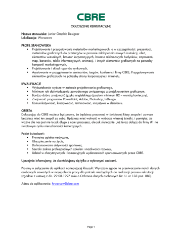 OGLOSZENIE REKRUTACYJNE Nazwa stanowiska: Junior Graphic Designer Lokalizacja: Warszawa PROFIL STANOWISKA Projektowanie i przygotowanie materiałów marketingowych, a w szczególności: prezentacji, materiałów graficznych do przetargów w procesie zdobywania nowych instrukcji, ofert, elementów wizualnych, broszur korporacyjnych, broszur reklamowych budynków, zaproszeń, map, banerów, tablic informacyjnych, animacji, i innych elementów graficznych na potrzeby kampanii marketingowych, Projektowanie i skład raportów rynkowych, Asystowanie w przygotowaniu seminariów, targów, konferencji firmy CBRE; Przygotowywanie elementów graficznych na potrzeby strony korporacyjnej i intranetu. KWALIFIKACJE Wykształcenie wyższe w zakresie projektowania graficznego, Minimum rok doświadczenia zawodowego związanego z projektowaniem graficznym, Bardzo dobra znajomość języka angielskiego (poziom minimum B2 – wymóg konieczny), Znajomość programów PowerPoint, Adobe, Photoshop, InDesign Komunikatywność, kreatywność, terminowość, inicjatywa w działaniu. OFERTA Dołączając do CBRE możesz być pewny, że będziesz pracować w światowej klasy zespole i zawsze będziesz mieć ten zespół za sobą. Będziesz mieć wolność w wyborze własnej ścieżki, i pamiętaj, że ważne dla nas jest nie to jak długo z nami pracujesz, ale jak skutecznie. Już teraz dołącz do firmy #1 na światowym rynku nieruchomości komercyjnych. Pakiet świadczeń: Prywatna opieka medyczna, Ubezpieczenie na życie, Dofinansowanie aktywności sportowej, Szeroki zakres profesjonalnych szkoleń i możliwości rozwoju, Udział w charytatywnych i komercyjnych wydarzeniach sponsorowanych przez CBRE. Uprzejmie informujemy, że skontaktujemy się tylko z wybranymi osobami. Prosimy o załączenie do aplikacji następującej klauzuli: Wyrażam zgodę na przetwarzanie moich danych osobowych zawartych w mojej ofercie pracy dla potrzeb niezbędnych do realizacji procesu rekrutacji (zgodnie z ustawą z dn. 29.08.1997 roku o Ochronie danych osobowych Dz. U. nr 133 poz. 883). Adres do aplikowania: [email protected] Page 1