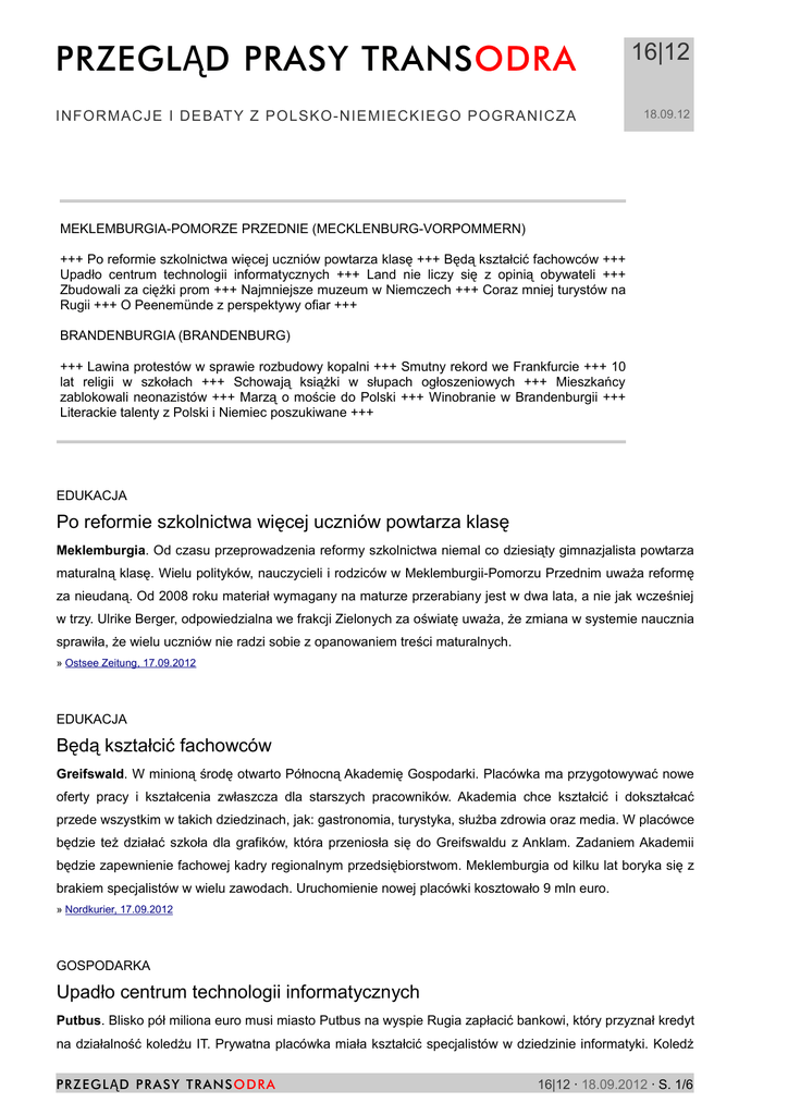 PRZEGL Ą D PRASY TRANS ODRA 16|12 INFORMACJE I DEBAT Y Z POLSKO-NIEMIECKIEGO POGRANICZA 18.09.12 MEKLEMBURGIA-POMORZE PRZEDNIE (MECKLENBURG-VORPOMMERN) +++ Po reformie szkolnictwa więcej uczniów powtarza klasę +++ Będą kształcić fachowców +++ Upadło centrum technologii informatycznych +++ Land nie liczy się z opinią obywateli +++ Zbudowali za ciężki prom +++ Najmniejsze muzeum w Niemczech +++ Coraz mniej turystów na Rugii +++ O Peenemünde z perspektywy ofiar +++ BRANDENBURGIA (BRANDENBURG) +++ Lawina protestów w sprawie rozbudowy kopalni +++ Smutny rekord we Frankfurcie +++ 10 lat religii w szkołach +++ Schowają książki w słupach ogłoszeniowych +++ Mieszkańcy zablokowali neonazistów +++ Marzą o moście do Polski +++ Winobranie w Brandenburgii +++ Literackie talenty z Polski i Niemiec poszukiwane +++ EDUKACJA Po reformie szkolnictwa więcej uczniów powtarza klasę Meklemburgia. Od czasu przeprowadzenia reformy szkolnictwa niemal co dziesiąty gimnazjalista powtarza maturalną klasę. Wielu polityków, nauczycieli i rodziców w Meklemburgii-Pomorzu Przednim uważa reformę za nieudaną. Od 2008 roku materiał wymagany na maturze przerabiany jest w dwa lata, a nie jak wcześniej w trzy. Ulrike Berger, odpowiedzialna we frakcji Zielonych za oświatę uważa, że zmiana w systemie naucznia sprawiła, że wielu uczniów nie radzi sobie z opanowaniem treści maturalnych. » Ostsee Zeitung, 17.09.2012 EDUKACJA Będą kształcić fachowców Greifswald. W minioną środę otwarto Północną Akademię Gospodarki. Placówka ma przygotowywać nowe oferty pracy i kształcenia zwłaszcza dla starszych pracowników. Akademia chce kształcić i dokształcać przede wszystkim w takich dziedzinach, jak: gastronomia, turystyka, służba zdrowia oraz media. W placówce będzie też działać szkoła dla grafików, która przeniosła się do Greifswaldu z Anklam. Zadaniem Akademii będzie zapewnienie fachowej kadry regionalnym przedsiębiorstwom. Meklemburgia od kilku lat boryka się z brakiem specjalistów w wielu zawodach. Uruchomienie nowej placówki kosztowało 9 mln euro. » Nordkurier, 17.09.2012 GOSPODARKA Upadło centrum technologii informatycznych Putbus. Blisko pół miliona euro musi miasto Putbus na wyspie Rugia zapłacić bankowi, który przyznał kredyt na działalność koledżu IT. Prywatna placówka miała kształcić specjalistów w dziedzinie informatyki. Koledż PRZ EGL Ą D PRAS Y T RANS O DRA 16|12 · 18.09.2012 · S. 1/6 PRZEGL Ą D PRASY TRANS ODRA 16|12 INFORMACJE I DEBAT Y Z POLSKO-NIEMIECKIEGO POGRANICZA 18.09.12 ogłosił jednak pod koniec sierpnia upadłość, a miasto będące poręczycielem kredytu zostało zobowiązane do jego spłaty. Burmistrz Putbus, Harald Burwitz, zapowiedział, że miasto będzie musiało zaciągnąć kredyt, by spłacić zobowiązania placówki. » Ostsee Zeitung, 12.09.2012 SPOŁECZEŃSTWO Land nie liczy się z opinią obywateli Meklemburgia. Podczas gdy w całych Niemczech wzrasta liczba spraw, w których organizowane są referenda obywatelskie, w Meklemburgii-Pomorzu Przednim jest ich coraz mniej. W 2008 roku obywatele mogli wypowiedzieć się osiem razy, w roku ubiegłym przeprowadzono zaledwie cztery referenda. Dla porównania w Bawarii odbywa się rocznie przeciętnie 141 referendów obywatelskich. Powodem tak małej liczby spraw, w której obywatele mogą się wypowiedzieć, są trudności biurokatyczne. Wiele tematów, np. planowanie przestrzenne, zostało wykluczonych z możliwości przeprowadzania referendów. Dodatkowo autorzy petycji mają tylko sześć tygodni na zebranie wymaganej liczby podpisów (2,5 do 10 procent uprawnionych do głosowania) – w Berlinie lub Hamburgu jest to sześć miesięcy, by zebrać poparcie dwóch do trzech procent. » Ostsee Zeitung, 12.09.2012 GOSPODARKA Zbudowali za ciężki prom Stralsund. Jeden z dwóch budowanych promów przez upadłą przed dwoma tygodniami stocznię P+S okazał się o 580 ton za ciężki. To właśnie problemy z terminowym oddaniem zamówionych przez duńskie przedsiębiorstwo żeglugowe Scandlines były jedną z przyczyn upadku stoczni w Stralsundzie i Wolgaście. Kłopoty stoczni postawiły też w trudnej sytuacji finansowej land. Jeden z kooperantów rząda 1,7 mln euro odszkodowania za poniesione straty. Dodatkowo rządowi Meklemburgii zarzuca się celowe opóźnienie ogłoszenia upadłości stoczni tak, aby zyskać na czasie i drożej sprzedać budowane w nich jednostki. W ubiegłym tygodniu spółkę P+S opuścił menadżer Rüdiger Fuchs po zaledwie miesiącu sprawowania funkcji. Krytyce poddawana jest też suma, jaką rząd Meklemburgii od 2009 roku wydał na doradców stoczni. Według informacji Ostsee Zeitung chodzi o blisko 30 mln euro. » Ostsee Zeitung, 13.09.2012 KULTURA Najmniejsze muzeum w Niemczech Dreilützow. 90 cm na 90 cm – tyle mierzy najmniejsze muzeum w Niemczech mieszczące się w starej budce telefonicznej. Na raz zwiedzać mogą je dwie, maksymalnie trzy osoby. Niemal każdego dnia przed budką ustawiają się długie kolejki. „Muzeum” znajduje się w ogrodzie zamkowym Dreilützow, niedaleko PRZ EGL Ą D PRAS Y T RANS ODRA 16|12 · 18.09.2012 · S. 2/6 PRZEGL Ą D PRASY TRANS ODRA 16|12 INFORMACJE I DEBAT Y Z POLSKO-NIEMIECKIEGO POGRANICZA 18.09.12 Wittenburga. Prezentowane są w nim prace artystki Christy Schenk. Dla najmłodszych atrakcją jest sama budka: „Wiele dzieci nie zna już dziś budki telefonicznej” – mówi jedna z nauczycielek, która przyprowadziła grupę czwartoklasistów. Wystawy mają zmieniać się co sześć miesięcy. Prezentowane będą tutaj przede wszystkim prace regionalnych artystów. » Nordkurier, 12.09.2012 TURYSTYKA Coraz mniej turystów na Rugii Bergen. Kurorty i miejscowości wypoczynkowe na Wyspie Rugia odnotowały w pierwszym półroczu br. spadek liczby turystów. Związek branży turystycznej Meklemburgii-Pomorza Przedniego bije na alarm: „Jeśli interesy źle idą na Rugii, to całemu