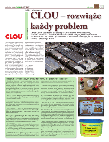 kwiecień 2008 KURIERDRZEWNY FILIP JACKIEWICZ Lakiery do drewna Oferta produktów CLOU obejmuje dziś ponad 200 produktów, jest ich razem aż do 10 000 różnych kolorów i odcieni. W ofercie Clou znajdziemy kompletny program uszlachetniania powierzchni drewna. Obejmuje on następujące produkty: szpachlówki,bejce, różnego rodzaju lakiery, oleje, woski, środków do naprawy i retuszowania wad oraz do odnawiania starych mebli . Laboratorium CLOU stale pracuje nad rozwijaniem nowych, przyszłościowych produktów, by stale ulepszać produkty wg aktualnej wiedzy technicznej. Stąd wywodzą się lakiery wykorzystujące zalety nanotechnologii. W roku 2005 przedstawiono nowy produkt – Lakier AntiBak przeznaczony do zastosowań do schodów i mebli w szpitalach i klinikach, zabezpieczający długotrwale przed szkodliwym chemia 31 CLOU – rozwiąże każdy problem Alfred Clouth Lackfabrik z siedzibą w Offenbach to firma rodzinna, założona w 1917 r., obecnie prowadzona przez kolejne, trzecie pokolenie. Produkty CLOU są obecnie powszechne w zakładach zajmujących się obróbką drewna i produkcją mebli. działaniem bakterii i grzybów. W tym roku firma Clou wprowadziła na rynek nową grupę produktów charakteryzującą się zmniejszoną emisją lotnych związków organicznych (LZO/VOC). Produkty te są w pełni zgodne z europejską dyrektywą „Dyrektywa Decopaint”. Od początku roku 2005 działa w Poznaniu przedstawicielstwo - Clou Polska sp. z o.o. - utworzone po to, by firma mogła być bliżej klientów na polskim rynku i zapewnić im jeszcze lepsze warunki współpracy. CLOU Polska ul. Syrenia 7 61-017 Poznań tel. 061-8780087 fax 061-8780529 www.clou.com.pl [email protected] Przegląd najważniejszych produktów CLOU dla przemysłu i stolarzy: - Szpachlówka do drewna - wodorozcieńczalna na bazie żywicy akrylowej. Ma konsystencję pasty o dużej zawartości części stałych. Przeznaczona jest do wypełniania i naprawiania różnego rodzaju ubytków w drewnie: dziury, rysy, pęknięcia. Szpachlówkę można barwić. Uzyskuje się przy tym niewielkie różnice kolorystyczne. Po wyszlifowaniu szpachlówka jest gładka i nie pozostawia na drewnie plam. Podczas schnięcia i utwardzania się, nie występuje efekt zapadania się uzupełnionej powierzchni. Clou szpachlówka występuje w szerokiej gamie kolorystycznej. gólnie nadaje się do powierzchni intensywnie użytkowanych w takich pomieszczeniach jak restauracje, kuchnie, łazienki. - Bejca kF - gotowa, odporna na światło, zawierająca barwniki na bazie wody, dobrze penetrująca. Nadaje się do wszystkich miękkich i twardych gatunków drewna. -WL Schichtlack CB, wodorozcieńczalny, bezbarwny lakier jednokomponentowy, nadaje się zarówno jako grunt jak też lakier nawierzchniowy. Idealny do lakierowania blatów stołowych, krzeseł jak też skrzydeł drzwi szaf, schodów wewnątrz pomieszczeń. - Bejca rustykalna – gotowa do użycia, szybkoschnąca oparta na rozpuszczalnikach organicznych oraz drobnych pigmentach i barwnikach. Nadaje się do bejcowania drewna o dużych porach takich jak: dąb, jesion, mahoń, orzech. - CLOURETHAN – odporny na zarysowania, dobrze wypełniający lakier jednokomponentowy na bazie uretanowo-alkidowej. Nadaje się do lakierowania schodów i parkietu, jak też drzwi, krzeseł, stołów i płyt korkowych. -CLOUCRYL – dwukomponentowy lakier na bazie żywicy poliuretanowo-akrylowej. Przeznaczony do mocno obciążanych, odpornych na zarysowania i chemicznie odpornych powierzchni mebli wszelkiego rodzaju i ich częściach wykonanych z drewna i materiałów drewnopochodnych. Idealny do restauracji, szkół, przedszkoli czy łazienek - CLOUCRYL Nano-Finish - wypełniający dwukomponentowy lakier na bazie żywicy poliuretanowo-akrylowej długotrwale zabezpieczający przed bakteriami, grzybami i zarazkami chorobotwórczymi. Szczególnie nadaje się do wymagających powierzchni wewnątrz pomieszczeń takich mebli jak stoły czy krzesła. - CLOUCRYL Decklack – do lakierowania w kolorze powierzchni drewnianych czy drewnopochodnych. Istnieje również możliwość aplikacji na lakierowanej powierzchni specjalnych efektów. Szcze- - Lakier DD SST – szybkoschnący, dobrze wypełniający, dwukomponentowy lakier na bazie żywicy poliuretanowej. Przeznaczony do lakierowania szczególnie mocno narażonych na niszczenie, obciążenia mechaniczne wewnętrznych elementów wyposażenia wnętrz wykonanych z drewna, w takich obiektach jak szkoły, szpitale, restauracje, laboratoria, biura, kuchnie lub pomieszczenia sanitarne. - WL Nano CB ANTIBAK, jednoskładnikowy lakier nawierzchniowy. Zwalcza aktywnie bakterie, grzyby i inne czynniki chorobotwórcze. Jednocześnie zapobiega rozprzestrzenianiu się czynników chorobotwórczych ograniczając ich namnażanie. -WL Parkettsiegel 2K – wodorozcieńczalny lakier poliuretanowy o dużej zawartości suchej masy. Ma dużą zdolność izolacji na gatunkach bogatych w substancje naturalne (jak np.teak lub wenge). Doskonale spełnia wymagania dotyczące odporności mechanicznej, dlatego wskazane jest stosowanie go do lakierowania powierzchni w miejscach szczególnie instensywnie użytkowanych jak: szkoły, przedszkola, budynki uzyteczności publicznej, restauracje,hotele itp. - Hartöl – twardy olej do drewna. Przeznaczony do wszystkich powierzchni drewnianych wewnątrz pomieszczeń takich jak: meble, schody, podłogi. Nadaje się również do wykańcznia powierzchni mebli dziecięcych oraz zabawek. Po wyschnięciu jest twardy, nie klei się i podkreśla rysunek drewna. -Hartwachs-öl – twardy olej wzbogacony woskiem, dzięki czemu nadaje powierzchni drewna jedwabistość i estetyczny wygląd. Cechuje go dobra odporność mechaniczna oraz odporność na zabrudzenia. Powierzchnia drewna pokryta Hartwachsöl jest nie tylko miła w dotyku, ale też odporna.