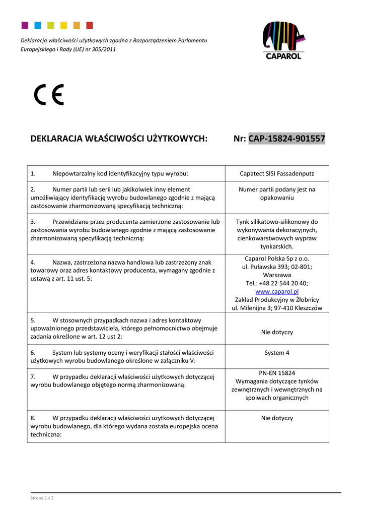 Deklaracja właściwości użytkowych zgodna z Rozporządzeniem Parlamentu Europejskiego i Rady (UE) nr 305/2011 DEKLARACJA WŁAŚCIWOŚCI UŻYTKOWYCH: 1. Niepowtarzalny kod identyfikacyjny typu wyrobu: 2. Numer partii lub serii lub jakikolwiek inny element umożliwiający identyfikację wyrobu budowlanego zgodnie z mającą zastosowanie zharmonizowaną specyfikacją techniczną: 3. Przewidziane przez producenta zamierzone zastosowanie lub zastosowania wyrobu budowlanego zgodnie z mającą zastosowanie zharmonizowaną specyfikacją techniczną: 4. Nazwa, zastrzeżona nazwa handlowa lub zastrzeżony znak towarowy oraz adres kontaktowy producenta, wymagany zgodnie z ustawą z art. 11 ust. 5: 5. W stosownych przypadkach nazwa i adres kontaktowy upoważnionego przedstawiciela, którego pełnomocnictwo obejmuje zadania określone w art. 12 ust 2: 6. System lub systemy oceny i weryfikacji stałości właściwości użytkowych wyrobu budowlanego określone w załączniku V: 7. W przypadku deklaracji właściwości użytkowych dotyczącej wyrobu budowlanego objętego normą zharmonizowaną: 8. W przypadku deklaracji właściwości użytkowych dotyczącej wyrobu budowlanego, dla którego wydana została europejska ocena techniczna: Strona 1 z 2 Nr: CAP-15824-901557 Capatect SISI Fassadenputz Numer partii podany jest na opakowaniu Tynk silikatowo-silikonowy do wykonywania dekoracyjnych, cienkowarstwowych wypraw tynkarskich. Caparol Polska Sp z o.o. ul. Puławska 393; 02-801; Warszawa Tel.: +48 22 544 20 40; www.caparol.pl Zakład Produkcyjny w Żłobnicy ul. Milenijna 3; 97-410 Kleszczów Nie dotyczy System 4 PN-EN 15824 Wymagania dotyczące tynków zewnętrznych i wewnętrznych na spoiwach organicznych Nie dotyczy Deklaracja właściwości użytkowych zgodna z Rozporządzeniem Parlamentu Europejskiego i Rady (UE) nr 305/2011 9. Deklarowane właściwości użytkowe: Zasadnicze charakterystyki Właściwości użytkowe Reakcja na ogień A2-s1,d0 Przyczepność: ≥ 0,5 MPa Trwałość: NPD Zharmonizowana specyfikacja techniczna Pkt 4.5 PN-EN 15824:2010 Absorpcja wody Współczynnik przepuszczalności pary wodnej EN 15824 W2 V3 0,76 W/(m . K) Współczynnik przewodzenia ciepła λ10, dry: wartość tabelaryczna; P=50 (EN1745:2002 tab. A12) Uwalnianie / zawartość substancji niebezpiecznych Patrz karta charakterystyki 10. Właściwości użytkowe wyrobu określonego w punktach 1 i 2 są zgodne z właściwościami użytkowymi deklarowanymi w pkt 9. Niniejsza deklaracja właściwości użytkowych wydana zostaje na wyłączną odpowiedzialność producenta określonego w pkt 4. W imieniu producenta podpisał: Kierownik Działu Technicznego Bożena Serwatka-Berbeć ………………………………………. (nazwisko i stanowisko) Warszawa, dnia 25 czerwca 2015 r. ………………………………………. (miejsce i data wydania) Strona 2 z 2 (podpis)