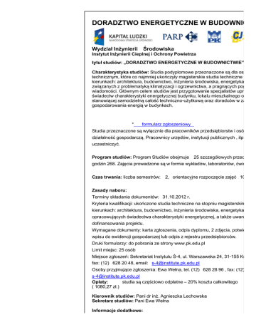 DORADZTWO ENERGETYCZNE W BUDOWNICTW Wydział Inżynierii Środowiska Instytut Inżynierii Cieplnej i Ochrony Powietrza tytuł studiów: „DORADZTWO ENERGETYCZNE W BUDOWNICTWIE” Charakterystyka studiów: Studia podyplomowe przeznaczone są dla osób z w technicznym, które co najmniej ukończyły magisterskie studia techniczne lub inż kierunkach: architektura, budownictwo, inżynieria środowiska, energetyka lub po związanych z problematyką klimatyzacji i ogrzewnictwa, a pragnących pogłębić wiadomości. Głównym celem studiów jest przygotowanie specjalistów uprawnio świadectw charakterystyki energetycznej budynku, lokalu mieszkalnego oraz cz stanowiącej samodzielną całość techniczno-użytkową oraz doradców w zakresie gospodarowania energią w budynkach. * formularz zgłoszeniowy Studia przeznaczone są wyłącznie dla pracowników przedsiębiorstw i osób prow działalność gospodarczą. Pracownicy urzędów, instytucji publicznych , itp. nie m uczestniczyć. Program studiów: Program Studiów obejmuje 25 szczegółowych przedmiotó godzin 268. Zajęcia prowadzone są w formie wykładów, laboratoriów, ćwiczeń o Czas trwania: liczba semestrów: 2, orientacyjne rozpoczęcie zajęć 10.11.20 Zasady naboru: Terminy składania dokumentów: 31.10.2012 r. Kryteria kwalifikacji: ukończone studia techniczne na stopniu magisterskim lub in kierunkach: architektura, budownictwo, inżynieria środowiska, energetyka oraz k opracowujących świadectwa charakterystyki energetycznej, a także uwarunkow dofinansowania projektu. Wymagane dokumenty: karta zgłoszenia, odpis dyplomu, 2 zdjęcia, potwierdzen wpisu do ewidencji gospodarczej lub odpis z rejestru przedsiębiorców. Druki formularzy: do pobrania ze strony www.pk.edu.pl Limit miejsc: 25 osób Miejsce zgłoszeń: Sekretariat Instytutu Ś-4, ul. Warszawska 24, 31-155 Kraków, fax: (12) 628 20 48, email: [email protected] Osoby przyjmujące zgłoszenia: Ewa Wełna, tel. (12) 628 28 96 , fax: (12) 628 [email protected] Opłaty: studia są częściowo odpłatne – 20% kosztu całkowitego ( 1080,27 zł.) Kierownik studiów: Pani dr inż. Agnieszka Lechowska Sekretarz studiów: Pani Ewa Wełna Informacje dodatkowe: Zajęcia odbywają się tylko w soboty. Informacje dodatkowe: Zajęcia odbywają się tylko w soboty. Słuchaczy obowiązuje zaliczenie zajęć przewidzianych programem Studiów Pod (całościowy test końcowy) oraz napisanie i obronienie pracy końcowej. Obecność na zajęciach jest obowiązkowa. © Wydział Inżynierii Środowiska http://www.wis.pk.edu.pl/