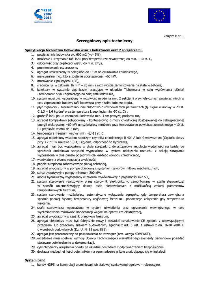 Załącznik nr … Szczegółowy opis techniczny Specyfikacja techniczna lodowiska wraz z kolektorem oraz 2 sprężarkami: 1. powierzchnia lodowiska ok. 600 m2 (+/- 2%) 2. mrożenie i utrzymanie tafli lodu przy temperaturze zewnętrznej do min. +10 st. C, 3. odporność przy prędkości wiatru do min. 2m/s, 4. promieniowanie rozproszone, 5. agregat umieszczony w odległości do 15 m od orurowania chłodniczego, 6. maksymalna moc, która zostanie udostępniona: ~60 kW, 7. orurowanie z polietylenu (PE), 8. średnica rur w zakresie 16 mm – 20 mm z możliwością zamontowania na stałe w betonie, 9. kolektory w systemie ziębniczym pracujące w układzie Tichelmana w celu wyrównania ciśnień i temperatur płynu ziębniczego na całej tafli lodowiska, 10. system musi być wyposażony w możliwość mrożenia min. 2 sekcjami o symetrycznych powierzchniach w celu zapewnienia budowy tafli lodowiska przy niskim poborze prądu, 11. płyn ziębniczy - freezium lub inne chłodziwo o równoważnych parametrach (tj. ciężar właściwy w 20 st. C 1,3 – 1,4 kg/dm3 oraz temperatura krzepnięcia min -50 st. C) , 12. grubość lodu po uruchomieniu lodowiska min. 3 cm powyżej poziomu rur, 13. agregat kompaktowy (obudowany - kontenerowy) o mocy chłodniczej dostosowanej do zabezpieczonej energii elektrycznej ~60 kW umożliwiający mrożenie przy temperaturze powietrza zewnętrznego +10 st. C i prędkości wiatru do 2 m/s, 14. temperatura freezium wej/wyj min. -8/-11 st. C, 15. agregat napełniony wsadem roboczym czynnika chłodniczego R 404 A lub równoważnym (Gęstość cieczy przy +25°C w zakresie 1,0-1,1 kg/dm³, odporność na hydrolizę), 16. agregat musi być wyposażony w dwie sprężarki z dwustopniową regulacją wydajności na każdej ze sprężarek dodatkowo sprężarki wyposażone w system odciążenia rozruchu z sekcją skraplania wyposażoną w dwa panele po jednym dla każdego obwodu chłodniczego, 17. wentylatory z płynną regulacją wydajności 18. panele skraplacza zabezpieczone siatką ochronną, 19. agregat wyposażony w pompę obiegową z systemem zaworów i filtrów mechanicznych, 20. spręż dyspozycyjny pompy minimum 200 kPA, 21. moduł hydrauliczny wyposażony w zbiornik wyrównawczy o pojemności min 50l, 22. system sterowania realizowany przez sterownik elektroniczny, zamontowany w szafie sterowniczej w sposób uniemożliwiający dostęp osób niepowołanych z możliwością zmiany parametrów temperaturowych freezium, 23. system sterowania możliwiający automatyczne wyłączenie agregatu, gdy temperatura zewnętrzna spadnie poniżej żądanej temperatury wyjściowej freezium i ponownego załączenia gdy temperatura wzrośnie, 24. szafa sterownicza wyposażona w system oświetlenia oraz ogrzewania wewnętrznego w celu wyeliminowania możliwości kondensacji wilgoci na aparaturze elektrycznej, 25. agregat wyposażony w czujnik przepływu freezium, 26. agregat chłodniczy musi być fabrycznie nowy i posiadać oznakowanie CE zgodnie z obowiązującymi przepisami lub oznaczony znakiem budowlanym, zgodnie z art. 5 ust. 1 ustawy z dn. 16-04-2004 r. o wyrobach budowlanych (Dz. U. Nr 92 poz. 881), 27. agregat jest przeznaczony do posadowienia na zewnątrz (tzw. wersja KOMPAKT), 28. urządzenie musi spełniać wymogi Dozoru Technicznego i wszystkie jego elementy ciśnieniowe posiadać stosowne potwierdzenie w dokumentacji, 29. cykl chłodniczy urządzenia oparty na układzie pośrednim z odprowadzeniem bezpośrednim, 30. dostawa niezbędnej ilości pojemników na zgromadzenie glikolu znajdującego się w instalacji. System band 1. bandy HDPE na konstrukcji aluminiowej lub stalowej cynkowanej ogniowo - rekreacyjne, 2. 3. 4. 5. 6. 7. 8. 9. 10. 11. 12. 13. 14. grubości płyt w bandach: wypełnienie band - polietylen HDPE o gr. min 8 mm (płyta pełna), listwa okopowa - polietylen PE HD 500, gr. min 10 mm, wys. 200 mm, listwa poręczowa polietylen PE HD 500, wysokość band 120 cm – 130 cm promień łuku min. 3 m, dwie bramki wejściowe o wym. min. 0,90 m i jedna brama dla rolby dostarczonej w ramach zamówienia o wymiarach umożliwiających jej swobodny wjazd, dwie bramki przeznaczone do treningu wraz z siatkami wykonane ze stali, malowane proszkowo na kolor czerwony, szerokość szczelin pomiędzy panelami band nie może być większa jak 3 mm, system montażu do płyty lodowiska konstrukcją metalową (nierdzewną) od zewnętrznej strony, wytrzymałość konstrukcji na uderzenie łyżwiarza, pomiędzy bandami, a płytą lodowiska powinna być przestrzeń umożliwiająca swobodny spływ wody, drzwiczki w bandach winny posiadać konstrukcje umożliwiającą ich otwieranie tylko na zewnątrz tafli lodowej, szczeliny pomiędzy bandami a drzwiczkami nie większe niż 5 - 8 mm. Maszyna do konserwacji lodu – rolba 1. zbiornik wody ciepłej min 600 litrów 2. zasobnik śniegu min 2,5 m3 3. zbiornik wody myjnej min 200 litrów 4. grubość ścinania lodu w zakresie od 0,01mm do 3 mm 5. waga maksymalna brutto 3300 kg Wymagania dotyczące gwarancji dla wszystkich dostarczanych urządzeń: 1. 2. 3. Minimalny okres gwarancji dla wszystkich urządzeń 36 miesięcy. Reakcja serwisowa w ciągu 24 godzin od chwili zgłoszenia. Autoryzowany serwis na terenie Polski.