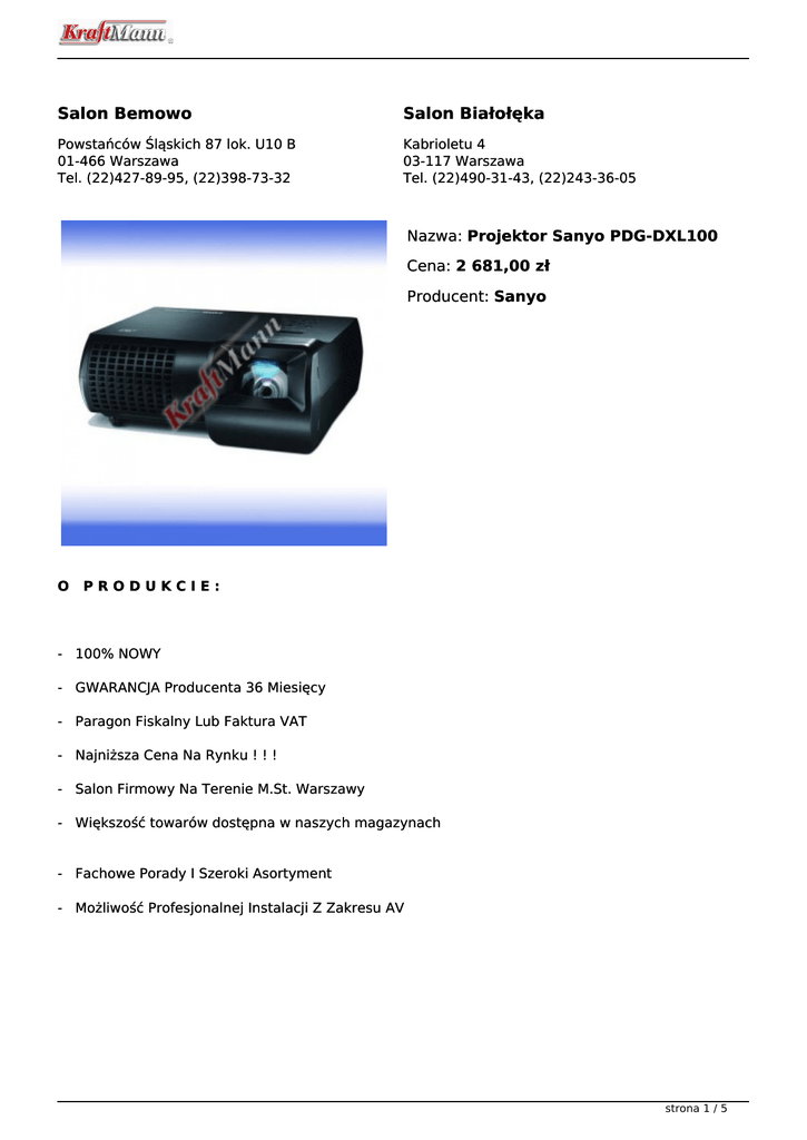 Salon Bemowo Salon Białołęka Powstańców Śląskich 87 lok. U10 B 01-466 Warszawa Tel. (22)427-89-95, (22)398-73-32 Kabrioletu 4 03-117 Warszawa Tel. (22)490-31-43, (22)243-36-05 Nazwa: Projektor Sanyo PDG-DXL100 Cena: 2 681,00 zł Producent: Sanyo O PRODUKCIE: - 100% NOWY - GWARANCJA Producenta 36 Miesięcy - Paragon Fiskalny Lub Faktura VAT - Najniższa Cena Na Rynku ! ! ! - Salon Firmowy Na Terenie M.St. Warszawy - Większość towarów dostępna w naszych magazynach - Fachowe Porady I Szeroki Asortyment - Możliwość Profesjonalnej Instalacji Z Zakresu AV strona 1 / 5 Niesamowity Projektor Multimedialny Sanyo PDG-DXL100 LCD / XGA / 2700ANSI / 750:1 / HDMI / LAN / Short-Throw 36 miesięczna gwarancja producenta 36 miesięczna gwarancja na lampę (door-to-door) Firma Sanyo zaprezentowała nowy projektor z szerokokątnym obiektywem - PDG-DXL100. Projektor przeznaczony jest do małych sal konferencyjnych i do zastosowań w edukacji. Obraz o przekątnej 80 cali (ok. 203cm) otrzymujemy umieszczając projektor PDG-DXL100 w odległości zaledwie 99 cm od ekranu. Dzięki jasności 2.700 ANSI lumenów i rozdzielczości XGA (1.024 x 768) projektor sprawdzi się także w dobrze oświetlonych pomieszczeniach i klasach szkolnych, współpracując z interaktywnymi tablicami. Projektor posiada wbudowany 8 W głośnik, dzięki czemu może być wykorzystywany do prezentacji multimedialnych. Funkcja automatycznej konfiguracji (automatic setup) dostosowuje parametry projekcji do aktualnego źródła sygnału wideo, natomiast zakres korekcji pionowego zniekształcenia trapezowego (vertical keystone) umożliwia instalację projektora np. wysoko pod sufitem w szkolnej klasie. Nowy model DLP został wyposażony w szereg gniazd sygnałowych i połączeniowych, w tym cyfrowe gniazdo HDMI i sieciowe RJ45 umożliwiające monitorowanie pracy i ustawianie funkcji projektora poprzez sieć LAN. Najważniejsze cechy Sanyo PDG-DXL100: Idealny do tablic interaktywnych i jasnych pomieszczeń Obiektyw z krótką ogniskową (obraz 80" z 0.99 m) Wysoka jasność 2.700 ANSI lm Złącza sterujące RS232 i RJ-45 (LAN) Żywotność lampy do 4.000 godzin (tryb ECO) Zestaw złącz (2xVGA, HDMI, Composite, S-Video, Audio) i głośnik 8W Specyfikacja techniczna: Technologia wyświetlania 1 x 0.55” DMD Chip (4:3) Rozdzielczość XGA 1024 x 768 Jasność (STD/ECO) 2700 ANSI Lumenów / 1917 ANSI Lumenów Kontrast 750 : 1 Głośność (STD/ECO) 34 dB / 29 dB Format Obrazu 4:3 Waga 3.7 kg Kompatybilność komputerowa UXGA, SXGA, WXGA, XGA, SVGA, VGA Kompatybilność wideo Pal, Pal-M, Pal-N, SECAM, NTSC, NTSC4.43 Jednorodność 80 % Obiektyw f = 6.97 mm, F = 2.6 Współczynnik odległości 0.6 : 1 Odległość od ekranu 0.5 - 3.72 m Korekcja Trapezu Pionowa +/- 15 stopni Rodzaje Projekcji Przednia, Tylna, Przednia sufitowa, Tylna sufitowa Lampa 225W UHP (LMP-138) Żywotność lampy (STD/ECO) 3000 h / 4000 h Wymiary 306.5 x 105 x 292.3 mm (szer. x wys. x gł.) Zasilanie 100 – 240V, 50 – 60Hz. Pobór mocy (STD/ECO) 320W / strona 2 / 5 240W, 0.9W w trybie czuwania Wejścia 1 x HDMI (HDCP) 2 x D-Sub15 (RGB) 1 x RCA (Composite) 1 x Mini DIN4 (S-Video) 1 x 3.5mm stereo jack (audio) 1 x RJ45 (LAN) 1 x Mini DIN8 (RS232) Wyjścia 1 x 3.5mm Stereo Jack (audio) 1 x D-Sub15 (monitor) Funkcje Auto-strojenie Audio Głośnik 8W, mono Pilot zdalnego sterowania Pilot na podczerwień Gwarancja 3 lata na projektor, 3 lata na lampę (max. 2000 h)* Języki Menu Polski, Angielski, Niemiecki, Francuski, Włoski, Hiszpański, Portugalski, Holenderski, Szwedzki, Fiński, Węgierski, Rumuński, Rosyjski, Chiński, Koreański i Japoński Dostarczane akcesoria Pilot bezprzewodowy wraz z bateriami, kabel zasilający, kabel D-Sub15, zaślepka obiektywu ze sznurkiem, instrukcja obsługi na CD-ROM, Akcesoria opcjonalne kabel SCART/DSub15 (POA-CA-SCART) kabel Components/D0Cub15 (POA-CA-COMPVGA) * Wymaga bezpłatnej rejestracji na stronie www.sanyo-polska.pl/gwarancja w okresie 90 dni od dnia zakupu. Gwarancja standardowa to 3 lata na projektor / 90 dni na lampę (max. 300 godzin Gorąco zapraszamy po odbiór osobisty ! ! ! Wysyłamy również firmą kurierską ! ! ! UWAGA!!! Dodatkowo RABAT na dowolny ekran 10%! > > KLIKNIJ < < i/lub RABAT na dowolny uchwyt do projektora 10%! strona 3 / 5 > > KLIKNIJ < < Zapraszamy do odwiedzenia naszej siedziby na ul. Kabrioletu 4 (przy ul. Modli?skiej) oraz sklepu firmowego przy ul. Powst. ?l?skich 87 lok. 10A i 10B (przy skrzy?owaniu ulic Powsta?ców ?l?skich i Górczewskiej) strona 4 / 5 gdzie istnieje mo?liwo?? odbioru osobistego zakupionego towaru. W razie pytań: - zadzwoń tel. (022) 427-89-95 (pon-pt 9.00-17.00) kom. 0-501-726-922 * 0-512-207-819 (pon-nd 8.00-20.00) - napisz: [email protected] [email protected] [email protected] strona 5 / 5 Powered by TCPDF (www.tcpdf.org)