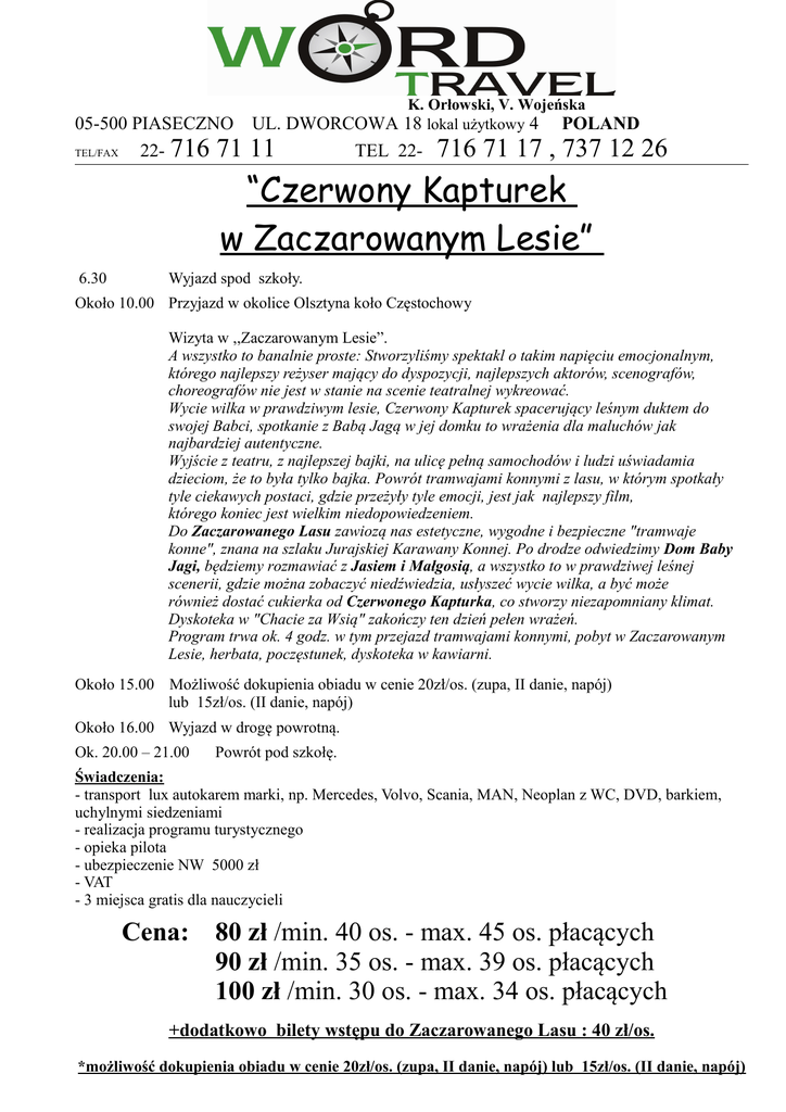 05-500 PIASECZNO TEL/FAX 22- 716 71 K. Orłowski, V. Wojeńska UL. DWORCOWA 18 lokal użytkowy 4 POLAND 11 TEL 22- 716 71 17 , 737 12 26 “Czerwony Kapturek w Zaczarowanym Lesie” 6.30 Wyjazd spod szkoły. Około 10.00 Przyjazd w okolice Olsztyna koło Częstochowy Wizyta w ,,Zaczarowanym Lesie”. A wszystko to banalnie proste: Stworzyliśmy spektakl o takim napięciu emocjonalnym, którego najlepszy reżyser mający do dyspozycji, najlepszych aktorów, scenografów, choreografów nie jest w stanie na scenie teatralnej wykreować. Wycie wilka w prawdziwym lesie, Czerwony Kapturek spacerujący leśnym duktem do swojej Babci, spotkanie z Babą Jagą w jej domku to wrażenia dla maluchów jak najbardziej autentyczne. Wyjście z teatru, z najlepszej bajki, na ulicę pełną samochodów i ludzi uświadamia dzieciom, że to była tylko bajka. Powrót tramwajami konnymi z lasu, w którym spotkały tyle ciekawych postaci, gdzie przeżyły tyle emocji, jest jak najlepszy film, którego koniec jest wielkim niedopowiedzeniem. Do Zaczarowanego Lasu zawiozą nas estetyczne, wygodne i bezpieczne "tramwaje konne", znana na szlaku Jurajskiej Karawany Konnej. Po drodze odwiedzimy Dom Baby Jagi, będziemy rozmawiać z Jasiem i Małgosią, a wszystko to w prawdziwej leśnej scenerii, gdzie można zobaczyć niedźwiedzia, usłyszeć wycie wilka, a być może również dostać cukierka od Czerwonego Kapturka, co stworzy niezapomniany klimat. Dyskoteka w "Chacie za Wsią" zakończy ten dzień pełen wrażeń. Program trwa ok. 4 godz. w tym przejazd tramwajami konnymi, pobyt w Zaczarowanym Lesie, herbata, poczęstunek, dyskoteka w kawiarni. Około 15.00 Możliwość dokupienia obiadu w cenie 20zł/os. (zupa, II danie, napój) lub 15zł/os. (II danie, napój) Około 16.00 Wyjazd w drogę powrotną. Ok. 20.00 – 21.00 Powrót pod szkołę. Świadczenia: - transport lux autokarem marki, np. Mercedes, Volvo, Scania, MAN, Neoplan z WC, DVD, barkiem, uchylnymi siedzeniami - realizacja programu turystycznego - opieka pilota - ubezpieczenie NW 5000 zł - VAT - 3 miejsca gratis dla nauczycieli Cena: 80 zł /min. 40 os. - max. 45 os. płacących 90 zł /min. 35 os. - max. 39 os. płacących 100 zł /min. 30 os. - max. 34 os. płacących +dodatkowo bilety wstępu do Zaczarowanego Lasu : 40 zł/os. *możliwość dokupienia obiadu w cenie 20zł/os. (zupa, II danie, napój) lub 15zł/os. (II danie, napój) Standardowy rozmiar naszych autokarów to 49 miejsc (do dyspozycji grupy wraz z opiekunami). Na Państwa życzenie możemy zarezerwować autokary 57-70 miejsc (w tym przypadku prosimy o kontakt z biurem w celu sprawdzenia kalkulacji na ponadstandardowy pojazd i jego dostępności w wybranym przez Państwa terminie). W celu podpisania umowy i rezerwacji konkretnego terminu prosimy o telefon do biura 022 716 71 11 lub 022 716 71 17 lub mail [email protected] Zaliczka konieczna do podpisania umowy 50zł/os. Ze względu na szczyt sezonu wycieczek szkolnych w miesiącach maj-czerwiec sugerujemy dokonanie rez. wstępnej na czas zebrania zaliczek! KWOTĘ NA BILETY WSTĘPU POTWIERDZAMY PRZED DOPŁATĄ ZGODNIE Z OBOWIĄZUJĄCYMI CENNIKAMI. Wyciąg z warunków uczestnictwa imprez turystycznych organizowanych przez B.P. Word Travel (pełna wersja warunków uczestnictwa dostępna jest u nauczyciela organizującego wycieczkę) : 13. W przypadku rezygnacji lub nie uczestniczenia Uczestnika w wykupionej imprezie Organizator uprawniony jest do potrącenia RZECZYWIŚCIE PONIESIONYCH KOSZTÓW. 14. Zmiana uczestnika nie pociąga za sobą kosztów finansowych. 18. Uczestnik odpowiada za wszelkie szkody materialne wyrządzone w trakcie trwania imprezy (zniszczenia w hotelu, autokarze) 15. Jeżeli w programie jest wyjazd poza granicę Polski - uczestnik winien posiadać na miejscu zbiórki aktualnie obowiązujące dokumenty uprawniające do przekroczenia granic krajów objętych programem imprezy (wyłącznie dowód osobisty lub paszport ważny min. 6 m-cy od daty powrotu). 9 B. W przypadku chorób uznawanych za przewlekłe uczestnik winien na własny koszt wykupić dodatkowe ubezpieczenie ! ( dotyczy wycieczek zagranicznych) Klient przez dokonanie wpłaty (całkowitej lub częściowej) akceptuje program wycieczki i warunki uczestnictwa.