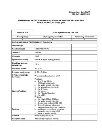 Załącznik nr 4 do SIWZ DZP-0431-1468/2010 WYMAGANE PRZEZ ZAMAWIAJĄCEGO PARAMETRY TECHNICZNE OFEROWANEGO SPRZ ĘTU Sala wykładowa nr 109, 111 Zadanie nr 1. Konfiguracja Wymagane parametry Parametry oferowane 1. 2. 3. PROJEKTOR MULTIMEDIALNY Z EKRANEM Technologia LCD Rozdzielczość 1024x768 (XGA) Jasność 2600 Im Kontrast 2000:1 Żywotność lampy 5000 h w trybie pełnej jasności Obiektyw z zoom optycznym 1,6 x Wielkość obrazu 30- 300” Dystans projekcyjny 0, 83 – 8,54 m Cyfrowa korekcja Keystone W pionie (automatyczny) ± 30o Głośnik Wejścia: a) 2 x 15 pin DSub (UXGA/Component), b) 2 x audio stereo mini jack, c) 1 x microphone mini jack, d) 1 x S-Video, e) 1 x Video, f) 2 x RCA (L/R audio) g) 1 x USB Wyjścia: a) 1 x 15 pin DSub (UXGA), b) 1 x audio stereo mini jack, c) Sterowanie po LAN i RS-232 a) Bezpośredniego włączenia i wyłączenia projektora z zasilania, b) Możliwość przesyłania obrazu z komputera przez port USB, c) Menu w języku polskim Wbudowany min 10 W Poziom hałasu Max 28/35 dB ( Eco/ normal) Wyjścia/wejścia Funkcje 1 Waga Max 3, 1 kg Uchwyt sufitowy Uchwyt przysufitowy z regulacją od (~) 20 - 100 cm, możliwość pochylenia projektora +/-30, możliwość obrotu projektora o 360°, prowadzenie kabli wewnątrz uchwytu Panel przyłączeniowy AV ścienny Okablowanie systemu AV 1 x VGA, Audio – komputerowe – kpl. 1. 1 x VGA, Audio do 10 m – kpl 1. Oferowany producent (firma), kraj produkcji, typ-model Szt. 2. Wartość brutto projektorów ( szt. 2) Cena brutto montażu projektorów w/wym. projektorów a) Wymiar 210 x 150 cm (obszar roboczy), b) Powierzchnia projekcyjna biała matowa, c) Automatyczne zatrzymywanie zwijania/ Ekran elektryczny rozwijania, d) Regulacja położenia punktów krańcowych zwijania/rozwijania, e) Naścienny przełącznik sterujący w zestawie Oferowany producent (firma), kraj produkcji, typ-model Szt. 2. Wartość brutto ekranów( szt. 2) Cena brutto montażu w/wym. ekranów WARTOŚĆ BRUTTO ZADANIA NR 1 2 Sala wykładowa nr 100 Zadanie nr 2. Konfiguracja Wymagane parametry Parametry oferowane 1. 2. 3. PROJEKTOR MULTIMEDIALNY Technologia LCD Rozdzielczość 1024x768 (XGA) Jasność 3 500 Im Kontrast 2000:1 Żywotność lampy 2 500 h w trybie pełnej jasności Obiektyw z zoom optycznym 1,6 x Wielkość obrazu 30 – 300” Dystans projekcyjny 0,96 - 16,24 m Cyfrowa korekcja Keystone W pionie ± 30o Głośnik Wejścia: a) 2 x 15 pin DSub (UXGA/Component), b) 2 x audio stereo mini jack, c) 1 x S-Video, d) 1 x Video, h) 2 x RCA (L/R audio) e) 1 x USB A, 1 x USB B Wyjścia: a) 1 x 15 pin DSub (UXGA), b) 1 x audio stereo mini jack, c) Sterowanie po LAN i RS-232 a) Bezpośredniego włączenia i wyłączenia projektora z zasilania, b) Możliwość przesyłania obrazu z komputera przez port USB, c) Prezentacja z przenośnych pamięci USB (JPEG), d) Menu w języku polskim Min. 10 W (wbudowany) Poziom hałasu Max 29 / 37 dB (Eco / Normal) Waga Max 3,4 kg Instalacja Na posiadanym przez Zamawiającego uchwycie sufitowym Wyjścia/wejścia Funkcje Oferowany producent (firma), kraj produkcji, typ-model Szt. 1. 3 Wartość brutto Sala wykładowa nr 123 Zadanie nr 3. Konfiguracja Wymagane parametry Parametry oferowane 1. 2. 3. PROJEKTOR MULTIMEDIALNY Technologia LCD Rozdzielczość 1024x768 (XGA) Jasność 4 000 Im Kontrast 2000:1 Żywotność lampy 2 500 h w trybie pełnej jasności Obiektyw z zoom optycznym 1,6 x Wielkość obrazu 30 – 300” Dystans projekcyjny 0,96 – 16,24 m Cyfrowa korekcja Keystone W pionie ± 30o Wyjścia/wejścia Funkcje Głośnik Wejścia minimum: a) 2 x 15 pin DSub (UXGA/Component), b) 2 x audio stereo mini jack, c) 1 x S-Video, d) 1 x Video, e) 2 x RCA (L/R audio), f) 1 x USB A, 1 x USB B, g) 1 x HDMI Wyjścia minimum: a) 1 x 15 pin DSub (UXGA), b) 2 x audio stereo mini jack, c) Sterowanie po LAN i RS-232 a) Bezpośredniego włączenia i wyłączenia projektora z zasilania, b) Możliwość przesyłania obrazu z komputera przez port USB oraz sieć LAN i WiFi, c) Prezentacja z przenośnej pamięci USB (JPEG + PowerPoint po konwersji z użyciem dedykowanego przez producenta projektora oprogramowania), d) Wyrzut ciepłego powietrza z przodu projektora, e) Menu w języku polskim Min. 10 W (wbudowany) 4 Poziom hałasu Max 29 / 37 dB ( Eco / normal) Waga Max 3,5 kg Instalacja Na posiadanym przez Zamawiającego uchwycie sufitowym Oferowany producent (firma), kraj produkcji, typ-model Szt. 1. Wartość brutto 5 Zadanie nr 4. Instytut Eksploatacji Maszyn, Ergonomii i Procesów Produkcyjnych Konfiguracja Wymagane parametry Parametry oferowane 1. 2. 3. PROJEKTOR MULTIMEDIALNY Z EKRANEM Technologia LCD Rozdzielczość 1024 x768 (XGA) Jasność 3 000 Im Kontrast 2000:1 Żywotność lampy 5000 h w trybie pełnej jasności Obiektyw z zoom optycznym 1,6 x Wielkość obrazu 30 – 300” Dystans projekcyjny 0,83 – 8,54 m Cyfrowa korekcja Keystone W pionie ± 30o (automatyczny) Głośnik Wejścia: a) 2 x 15 pin DSub (UXGA/Component), b) 2 x audio stereo mini jack, c) 1 x microphone mini jack, d) 1 x S-Video, e) 1 x Video, f) 2 x RCA (L/R audio) g) 1 x USB A, 1 x USB B Wyjścia: a) 1 x 15 pin DSub (UXGA), b) 2 x audio stereo mini jack, c) Sterowanie po LAN i RS-232 a) Bezpośredniego włączenia i wyłączenia projektora z zasilania, b) Możliwość przesyłania obrazu z komputera przez port USB lub sieć LAN, c) Możliwość rozbudowy projektora o dedykowany moduł WiFi, d) Prezentacja z przenośnej pamięci USB (JPEG), e) Menu w języku polskim Min. 10 W (wbudowany) Poziom hałasu Max 29 / 37 dB ( Eco / normal) Waga Max 3,1 kg Uchwyt sufitowy a) Z regulacją wysokości w zakresie 130 – Wyjścia/wejścia Funkcje 6 240 cm, b) Regulacja kata projekcji w pionie i w poziomie, c) Prowadzenie kabli wewnątrz kolumny Panel przyłączeniowy AV ścienny Z gniazdami VGA + audio, video + audio Okablowanie systemu AV a) VGA + audio, video + audio (długość przewodów do ~ 18m) - 1 kpl b) VGA + audio, video + audio (długość przewod