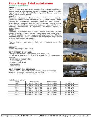Złota Praga 3 dni autokarem Wycieczka autokarowa DZIEŃ 1: Zbiórka uczestników i wyjazd z kraju według rozkładu. Przejazd na praskie tereny wystawowe, do Krizikovej Fontanny, udział w pokazie typu „światło, woda i dźw ięk” (fakultatywnie). Zakwaterowanie w hotelu, obiadokolacja, nocleg. DZIEŃ 2: Śniadanie. Zwiedzanie Pragi, m.in.: Hradczany – dzielnica królewska: Zamek Praski, katedra św. Wita, złota uliczka, Loreta, klasztor na Strachowie. Następnie dzielnica Mala Strana z kościołem św. Mikołaja, pałacem Liechtensteinów, Wyspa Kampa, Most Karola, dzielnica żydowska Josefov. Rejs statkiem po Wełtawie. Obiadokolacja w regionalnej restauracji. Pow rót do hotelu, nocleg. DZIEŃ 3: Śniadanie, wykwaterowanie z hotelu, dalsze zwiedzanie miasta: spacer po Rynku Starego Miasta z pomnikiem Jana Husa, kościół Tyński, Ratusz Staromiejski z zegarem „Orloj”, kościół św. Mikołaja. Wyjazd w kierunku Polski, powrót do poszczególnych miejscowości w późnych godzinach wieczornych. Program imprezy jest ramowy, kolejność zwiedzania może ulec zmianie. DOPŁATY: Dopłata do pokoju 1-os.: 180 zł CENA IMPREZY OBEJMUJE: - przejazd autokarem (klimatyzacja, dvd, barek, wc), - 2 noclegi w hotelu**/*** w Pradze, w pokojach 2 -osobowych z łazienką - 2 śniadania w formie bufetu - 2 obiadokolacje - program turystyczny - opiekę pilota - ubezpieczenie CENA IMPREZY NIE OBEJMUJE: - biletów wstępu do zwiedzanych obiektów, rejsu statkiem po Wełtawie, lokalnego przewodnika, ok 700 CZK. Na jbliższe te rminy Pobyt 3 3 3 3 3 3 3 dni dni dni dni dni dni dni Data wyjazdu 02.05.14 30.05.14 04.07.14 01.08.14 22.08.14 05.09.14 26.09.14 - 04.05.14 01.06.14 06.07.14 03.08.14 24.08.14 07.09.14 28.09.14 Kod wycieczki 05-743-CAW 06-762-CAW 07-763-CAW 08-761-CAW 08-762-CAW 09-752-CAW 09-753-CAW Cena 699.00 699.00 699.00 699.00 699.00 699.00 699.00 PLN PLN PLN PLN PLN PLN PLN Informacje i rezerwacje: ALPEN TOUR Biuro Turystyczne, 22/371-59-60, 691-032-018, [email protected], www.alpentour.pl