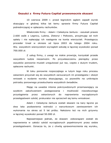 Oszuści z firmy Futura Capital prawomocnie skazani 10 czerwca 2009 r. przed legnickim sądem zapadł wyrok skazujący w głośnej kilka lat temu sprawie firmy Futura Capital pośredniczącej w opłacaniu rachunków. Właściciele firmy - Adam i Celestyna Jantura - oszukali prawie 2.600 osób z Legnicy, Lubina, Złotoryi i Polkowic, przyjmując od nich opłaty i nie wpłacając ich następnie na konta wierzycieli. Przestępczy proceder trwał w okresie od lipca 2003 do lutego 2004 roku. Ww. wszystkim wierzycielom wyrządzili szkodę w łącznej wysokości ponad 700.000 zł. Z usług firmy, z uwagi na niskie prowizje, korzystali przede wszystkim ludzie niezamożni. Po przywłaszczeniu pieniędzy przez oszustów ponownie musieli uregulować już raz, często z dużym trudem, opłacone rachunki. W toku ponownie rozpoczętego w lutym tego roku procesu oskarżeni przyznali się do wszystkich zarzucanych im przestępstw i złożyli wniosek o wydanie wyroku skazującego, co pozwoliło na uniknięcie potrzeby ponownego przesłuchania wszystkich świadków. Mając na uwadze interes pokrzywdzonych przemawiający za szybkim zakończeniem przystąpienia przez postępowania oskarżonych do i możliwość niezwłocznego naprawienia wyrządzonych przestępstwem szkód, prokurator nie sprzeciwił się temu wnioskowi. Adam i Celestyna Jantura zostali skazani na kary łączne po dwa lata pozbawienia wolności z warunkowym zawieszeniem ich wykonania na okres aż 5 lat próby. Nałożono też na nich grzywny w łącznej wysokości ponad 50.000 zł. Najważniejsze jednak, że skazani zobowiązani zostali do naprawienia w całości szkód wyrządzonych popełnionymi przez siebie przestępstwami. Oznacza to, że z chwilą uprawomocnienia się wyroku, tj. od dnia 18 czerwca br. wszystkie osoby, które występowały w sprawie w charakterze osób pokrzywdzonych mogą domagać się od Celestyny i Adama Janturów zwrotu sumy, jaką wpłacili w biurach Futura Capital. Jeżeli pieniądze nie zostaną zwrócone dobrowolnie lub na skutek pisemnego wezwania, pokrzywdzony może złożyć do sądu cywilnego wniosek o nadanie wyrokowi z 10 czerwca 2009 r. klauzuli wykonalności. Klauzula taka jest – mówiąc potocznie – zezwoleniem sądu do prowadzenia egzekucji, co oznacza możliwość zwrócenia się do komornika o pomoc w odzyskaniu długu.
