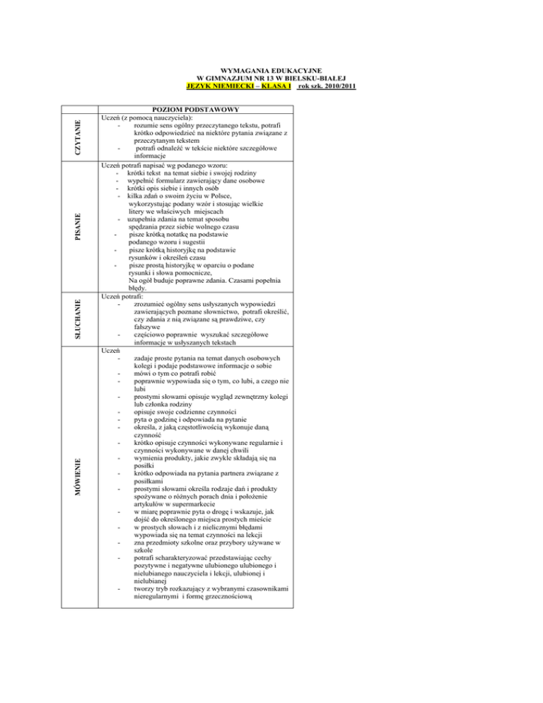 MÓWIENIE SŁUCHANIE PISANIE CZYTANIE WYMAGANIA EDUKACYJNE W GIMNAZJUM NR 13 W BIELSKU-BIAŁEJ JĘZYK NIEMIECKI – KLASA I rok szk. 2010/2011 POZIOM PODSTAWOWY Uczeń (z pomocą nauczyciela): rozumie sens ogólny przeczytanego tekstu, potrafi krótko odpowiedzieć na niektóre pytania związane z przeczytanym tekstem potrafi odnaleźć w tekście niektóre szczegółowe informacje Uczeń potrafi napisać wg podanego wzoru: - krótki tekst na temat siebie i swojej rodziny - wypełnić formularz zawierający dane osobowe - krótki opis siebie i innych osób - kilka zdań o swoim życiu w Polsce, wykorzystując podany wzór i stosując wielkie litery we właściwych miejscach - uzupełnia zdania na temat sposobu spędzania przez siebie wolnego czasu pisze krótką notatkę na podstawie podanego wzoru i sugestii pisze krótką historyjkę na podstawie rysunków i określeń czasu pisze prostą historyjkę w oparciu o podane rysunki i słowa pomocnicze, Na ogół buduje poprawne zdania. Czasami popełnia błędy. Uczeń potrafi: zrozumieć ogólny sens usłyszanych wypowiedzi zawierających poznane słownictwo, potrafi określić, czy zdania z nią związane są prawdziwe, czy fałszywe częściowo poprawnie wyszukać szczegółowe informacje w usłyszanych tekstach Uczeń zadaje proste pytania na temat danych osobowych kolegi i podaje podstawowe informacje o sobie mówi o tym co potrafi robić poprawnie wypowiada się o tym, co lubi, a czego nie lubi prostymi słowami opisuje wygląd zewnętrzny kolegi lub członka rodziny opisuje swoje codzienne czynności pyta o godzinę i odpowiada na pytanie określa, z jaką częstotliwością wykonuje daną czynność krótko opisuje czynności wykonywane regularnie i czynności wykonywane w danej chwili wymienia produkty, jakie zwykle składają się na posiłki krótko odpowiada na pytania partnera związane z posiłkami prostymi słowami określa rodzaje dań i produkty spożywane o różnych porach dnia i położenie artykułów w supermarkecie w miarę poprawnie pyta o drogę i wskazuje, jak dojść do określonego miejsca prostych mieście w prostych słowach i z nielicznymi błędami wypowiada się na temat czynności na lekcji zna przedmioty szkolne oraz przybory używane w szkole potrafi scharakteryzować przedstawiając cechy pozytywne i negatywne ulubionego ulubionego i nielubianego nauczyciela i lekcji, ulubionej i nielubianej tworzy tryb rozkazujący z wybranymi czasownikami nieregularnymi i formę grzecznościową Uczeń zna i przeważnie potrafi stosować w zdaniach: - - - GRAMATYKA - - - - - formy czasownika „być” = „sein” i czasowników regularnych oraz niektórych czasowników modalnych np. mögen, können w czasie teraźniejszym Präsens zaimki osobowe i końcówki czasownikóww czasie teraźniejszym „Präsens”, czasami miewa jednak problemy z właściwą końcówką konjugacji czasownika j lub zapomina, które czasowniki są rozdzielnie złożone poprawnie stosuje zaimki pytające zna formy rodzajników określonych i nieokreślonych zna formy zaimków dzierżawczych i przeczenia „kein” potrafi zastosować rodzajniki i zaimki dzierżawcze w bierniku rodzaju męskiego na ogół prawidłowo rozpoznaje rodzaj rzeczownika i przyporządkowuje odpowiednie formy rodzajników do rzeczowników zna szyk zdania prostego oznajmującego i pytającego, stosuje prawidłowy szyk zdania, ustawiając orzeczenie i podmiot na właściwym miejscu w zdaniu zna znaczenie, końcówki i zastosowanie czasowników regularnych i wybranych czasowników modalnych i nieregularnych ,oraz czasowników z ruchomym przedrostkiem, wybiera właściwą formę czasownika lub prawidłową końcówkę spośród dwóch lub trzech podanych możliwości, czasami jednak zdarzają mu/jej się błędy zna różnice pomiędzy czasownikami regularnymi i nieregularnymi zna liczebniki główne od 1 do 1000000i potrafi zbudować zdanie z wyrażeniem es gibt zna podstawowe określenia czasu, pory dnia, dni tygodnia i miesiące zna różnicę pomiędzy mianownikiem i biernikiem rzeczowników, zaimków osobowych i zaimków dzierżawczych, właściwie stosuje biernik potrafi stosować przyimki i prawidłowo dobiera do nich przypadek rodzajników i zaimków zna formy liczby mnogiej poznanych rzeczowników, czasami jednak może popełniać błędy stosuje przeczenie nicht i kein zna i stosuje w zdaniach tryb rozkazujący PISANIE CZYTANIE WYMAGANIA EDUKACYJNE DLA UCZNIÓW Z UPOŚLEDZENIEM UMYSŁOWYM W STOPNIU LEKKIM W GIMNAZJUM NR 13 W BIELSKU-BIAŁEJ JĘZYK NIEMIECKI – KLASA I rok szk. 2010/2011 POZIOM PODSTAWOWY Uczeń (z pomocą nauczyciela): rozumie sens ogólny przeczytanego tekstu, potrafi odnaleźć w tekście niektóre szczegółowe informacje Uczeń potrafi napisać: kilka zdań o sobie, wykorzystując podany wzór i stosując wielkie litery we właściwych miejscach uzupełnia zdania na temat sposobu spędzania przez siebie czasu wolnego krótki opis cech swoich i innych osób wypełnić formularz zawierający dane osobowe SŁUCHANIE Uczeń potrafi: zrozumieć ogólny sens usłyszanych wypowiedzi zawierających poznane słownictwo, potrafi określić, czy zdania z nią związane są prawdziwe, czy fałszywe - GRAMATYKA MÓWIENIE Uczeń - zadaje proste pytania na temat danych osobowych kolegi i podaje podstawowe informacje o sobie wypowiada się o tym, co lubi, a czego nie lubi prostymi słowami opisuje wygląd zewnętrzny kolegi lub członka rodziny wymienia niektóre codzienne czynności potrafi zapytać o godzinę i odpowiedzieć na pytanie określa, z jaką częstotliwością wykonuje daną czynność mówi o tym co potrafi robić wymienia produkty jakie spożywa w ciągu dnia prostymi słowami określa nazwy i rodzaje dań i posiłków formułuje tryb rozkazujący i formę grzecznościową Uczeń zna i przeważnie potrafi stosować w zdaniach: formy czasownika „sein” i wyrażenia „es gibt” w czasie teraźniejszym poprawnie stosuje zaimki pytające zn