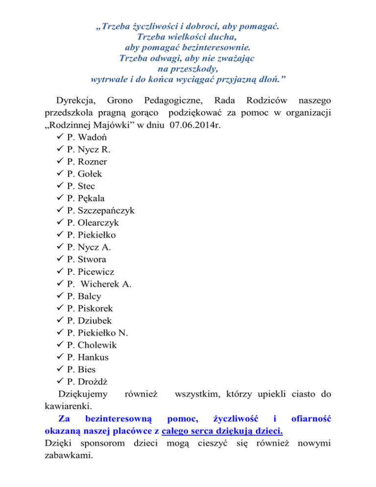 „Trzeba życzliwości i dobroci, aby pomagać. Trzeba wielkości ducha, aby pomagać bezinteresownie. Trzeba odwagi, aby nie zważając na przeszkody, wytrwale i do końca wyciągać przyjazną dłoń.” Dyrekcja, Grono Pedagogiczne, Rada Rodziców naszego przedszkola pragną gorąco podziękować za pomoc w organizacji „Rodzinnej Majówki” w dniu 07.06.2014r. P. Wadoń P. Nycz R. P. Rozner P. Gołek P. Stec P. Pękala P. Szczepańczyk P. Olearczyk P. Piekiełko P. Nycz A. P. Stwora P. Picewicz P. Wicherek A. P. Balcy P. Piskorek P. Dziubek P. Piekiełko N. P. Cholewik P. Hankus P. Bies P. Drożdż Dziękujemy również wszystkim, którzy upiekli ciasto do kawiarenki. Za bezinteresowną pomoc, życzliwość i ofiarność okazaną naszej placówce z całego serca dziękują dzieci. Dzięki sponsorom dzieci mogą cieszyć się również nowymi zabawkami.