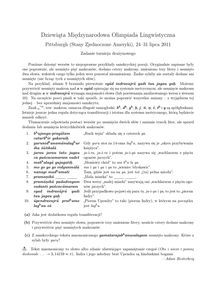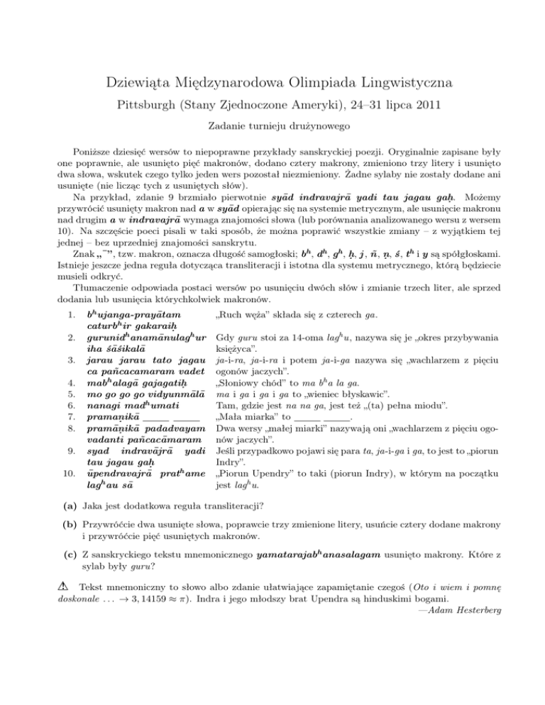 Dziewiąta Międzynarodowa Olimpiada Lingwistyczna Pittsburgh (Stany Zjednoczone Ameryki), 24–31 lipca 2011 Zadanie turnieju drużynowego Poniższe dziesięć wersów to niepoprawne przykłady sanskryckiej poezji. Oryginalnie zapisane były one poprawnie, ale usunięto pięć makronów, dodano cztery makrony, zmieniono trzy litery i usunięto dwa słowa, wskutek czego tylko jeden wers pozostał niezmieniony. Żadne sylaby nie zostały dodane ani usunięte (nie licząc tych z usuniętych słów). Na przykład, zdanie 9 brzmiało pierwotnie syād indravajrā yadi tau jagau gah . . Możemy przywrócić usunięty makron nad a w syād opierając się na systemie metrycznym, ale usunięcie makronu nad drugim a w indravajrā wymaga znajomości słowa (lub porównania analizowanego wersu z wersem 10). Na szczęście poeci pisali w taki sposób, że można poprawić wszystkie zmiany – z wyjątkiem tej jednej – bez uprzedniej znajomości sanskrytu. h Znak „¯”, tzw. makron, oznacza długość samogłoski; bh , dh , gh , h . , j , ñ, n . , ś, t i y są spółgłoskami. Istnieje jeszcze jedna reguła dotycząca transliteracji i istotna dla systemu metrycznego, którą będziecie musieli odkryć. Tłumaczenie odpowiada postaci wersów po usunięciu dwóch słów i zmianie trzech liter, ale sprzed dodania lub usunięcia którychkolwiek makronów. 1. 2. 3. 4. 5. 6. 7. 8. 9. 10. bh ujanga-prayātam caturbh ir gakaraih . gurunidh anamānulagh ur iha śāśikalā jarau jarau tato jagau ca pañcacamaram vadet mabh alagā gajagatih . mo go go go vidyunmālā nanagi madh umati praman . ikā pramān . ikā padadvayam vadanti pañcacāmaram syad indravājrā yadi tau jagau gah . ūpendravajrā prath ame lagh au sā „Ruch węża” składa się z czterech ga. Gdy guru stoi za 14-oma lagh u, nazywa się je „okres przybywania księżyca”. ja-i-ra, ja-i-ra i potem ja-i-ga nazywa się „wachlarzem z pięciu ogonów jaczych”. „Słoniowy chód” to ma bh a la ga. ma i ga i ga i ga to „wieniec błyskawic”. Tam, gdzie jest na na ga, jest też „(ta) pełna miodu”. „Mała miarka” to . Dwa wersy „małej miarki” nazywają oni „wachlarzem z pięciu ogonów jaczych”. Jeśli przypadkowo pojawi się para ta, ja-i-ga i ga, to jest to „piorun Indry”. „Piorun Upendry” to taki (piorun Indry), w którym na początku jest lagh u. (a) Jaka jest dodatkowa reguła transliteracji? (b) Przywróćcie dwa usunięte słowa, poprawcie trzy zmienione litery, usuńcie cztery dodane makrony i przywróćcie pięć usuniętych makronów. (c) Z sanskryckiego tekstu mnemonicznego yamatarajabh anasalagam usunięto makrony. Które z sylab były guru? ! Tekst mnemoniczny to słowo albo zdanie ułatwiające zapamiętanie czegoś (Oto i wiem i pomnę ! doskonale . . . → 3, 14159 ≈ π). Indra i jego młodszy brat Upendra są hinduskimi bogami. —Adam Hesterberg 2 Dziewiąta Międzynarodowa Olimpiada Lingwistyczna (2011). Zadanie turnieju drużynowego Rozdane na początku Następujące uwagi będą w pewnym momencie podane jako wskazówki: znaczenie guru, reguły poetyckie oraz (w trzech podpowiedziach) użycie yamatarajabh anasalagam. Odpowiedzi po 30 minutach Drużyna: (a) Jaka jest dodatkowa reguła transliteracji? . (b) • Usunięte słowa: , • Zmienione litery: 1. 2. 3. • Słowa z dodanymi makronami: 1. Drugie a w wyrazie indravājrā w wersie 9. 2. 3. 4. • Słowa z usuniętymi makronami: 1. Litera a w wyrazie syad w wersie 9. 2. 3. 4. 5. (c) Które z sylab w yamatarajabh anasalagam były guru? (+) Uwagi dotyczące problemu (w razie potrzeby korzystajcie z odwrotu kartki): . 3 Dziewiąta Międzynarodowa Olimpiada Lingwistyczna (2011). Zadanie turnieju drużynowego Rozdane po 30 minutach Sugerujemy, by porównać wersy 3 i 8 oraz 9 i 10. (To jedynie wskazówka, nie uwaga, za którą przyznane by były punkty). Sylaba jest guru wtedy i tylko wtedy, gdy zawiera długą samogłoskę, dyftong lub zakończona jest spółgłoską. Podział na sylaby jest niezależny od podziału na słowa. Sekwencja typu VCV dzieli się jak V-CV, natomiast typu VCCV, tak jak VC-CV. Litera a w sylabie 12 w wersie 2 ma dodany makron. Odpowiedzi po 60 minutach Drużyna: (a) Jaka jest dodatkowa reguła transliteracji? . (b) • Usunięte słowa: , . • Zmienione litery: 1. 2. 3. • Słowa z dodanymi makronami: 1. Drugie a w wyrazie indravājrā w wersie 9. 2. Litera a w sylabie 12 w wersie 2. 3. 4. • Słowa z usuniętymi makronami: 1. Litera a w wyrazie syad w wersie 9. 2. 3. 4. 5. (c) Które z sylab w yamatarajabh anasalagam były guru? (+) Uwagi dotyczące problemu (w razie potrzeby korzystajcie z odwrotu kartki): Sylaba jest guru wtedy i tylko wtedy, gdy zawiera długą samogłoskę, dyftong lub zakończona jest spółgłoską. Podział na sylaby jest niezależny od podziału na słowa. Sekwencja typu VCV dzieli się jak V-CV, natomiast typu VCCV, tak jak VC-CV. 4 Dziewiąta Międzynarodowa Olimpiada Lingwistyczna (2011). Zadanie turnieju drużynowego Rozdane po 60 minutach Sugerujemy, by wszyscy członkowie drużyny zapoznali się z każdą częścią zadania oraz ze wszystkimi wskazówkami, ponieważ niektóre z nich mogą okazać się istotne nawet w nieoczekiwanych miejscach. (To jedynie wskazówka, nie uwaga, za którą przyznane by były punkty). Każdy wers opisuje metrum, w którym jest zapisany. Ostatnie g w wersie 1 jest niepoprawne. Odpowiedzi po 90 minutach Drużyna: (a) Jaka jest dodatkowa reguła transliteracji? . (b) • Usunięte słowa: • Zmienione litery: 1. Ostatnie g w wersie 1 było pierwotnie 2. 3. , . . • Słowa z dodanymi makronami: 1. Drugie a w wyrazie indravājrā w wersie 9. 2. Litera a w sylabie 12 w wersie 2. 3. 4. • Słowa z usuniętymi makronami: 1. Litera a w wyrazie syad w wersie 9. 2. 3. 4. 5. (c) Które z sylab w yamatarajabh anasalagam były guru? (+) Uwagi dotyczące problemu (w razie potrzeby korzystajcie z odwrotu kartki): Sylaba jest guru wtedy i tylko wtedy, gd