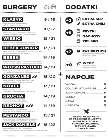 BURGERY KLASYK DODATKI 9 16 100% wołowiny, sałata lodowa, ogórek kiszony, cebula STANDARD 10 17 100% wołowiny, sałata lodowa, żółty ser cheddar, ogórek kiszony, pomidor, cebula WIESIO +2 EXTRA SER +5 FRYTKI 15 21 13 18 100% wołowiny, sałata lodowa, autorski sos BBQ, ser żółty cheddar, boczek, cebula BEBEK WŁOSKI PASTUCH 14 19 100% wołowiny, rucola, parmezan, sos bazyliowo-pomidorowy, grillowany boczek GONZALES podmień mięso na kotleta wege 13 19 WODA 3 COLA/FANTA/SPRITE 4 JOHN LEMON 8 YERBA 8 KAWA 5 HERBATA 5 14 19 100% wołowiny, roszponka, chutney gruszkowe, gorgonzola REDHOT +0 WEGE potężnie doładuj burgera do 360 g mięsa! NAPOJE 100% wołowiny, rucola, konfitura z czerwonej cebuli, camambert GRUCHA PASIBRZUCH 15 20 100% wołowiny, rucola, pasta red curry, żółty ser cheddar, jalapeño, nachosy NOVEL +7 14 19 100% wołowiny, sałata lodowa, autorski sos BBQ, szynka szwarcwaldzka, pieczona papryka, cebula NACHOSY ZIELSKO 100% wołowiny, sałata lodowa, jajo sadzone, boczek, pomidor, ogórek kiszony, cebula BEBEK JUNIOR EXTRA CHILI 14 19 100% wołowiny, sałata lodowa, pasta red curry, świeże chilly i habanero PESTARDO 15 21 100% wołowiny, roszponka, pesto bazylioworucolowe, grillowana mozzarella, pomidor JACK DANIELS 15 22 100% wołowiny, rucola, Jack Daniels polany na grillowane mięcho, pasta pepeverde, pomidor WSZYSTKIE BURGERY SĄ PODAWANE Z NASZYMI AUTORSKIMI SOSAMI I ORYGINALNĄ BUŁKĄ. 100% WOŁOWINY I ZERO ŚCIEMY.