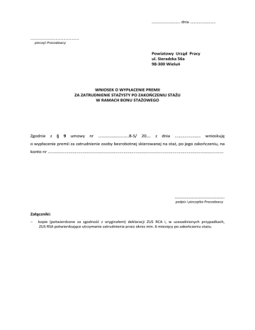 ……………………….. dnia …………………….. .................................................. pieczęć Pracodawcy Powiatowy Urząd Pracy ul. Sieradzka 56a 98-300 Wieluń WNIOSEK O WYPŁACENIE PREMII ZA ZATRUDNIENIE STAŻYSTY PO ZAKOŃCZENIU STAŻU W RAMACH BONU STAŻOWEGO Zgodnie z § 9 umowy nr ………..……………..B-S/ 20…. z dnia …………………… wnioskuję o wypłacenie premii za zatrudnienie osoby bezrobotnej skierowanej na staż, po jego zakończeniu, na konto nr ……………………………………………………………………………………………………………………………………………… …..………………………………. podpis i pieczątka Pracodawcy Załączniki: − kopie (potwierdzone za zgodność z oryginałem) deklaracji ZUS RCA i, w uzasadnionych przypadkach, ZUS RSA potwierdzające utrzymanie zatrudnienia przez okres min. 6 miesięcy po zakończeniu stażu.