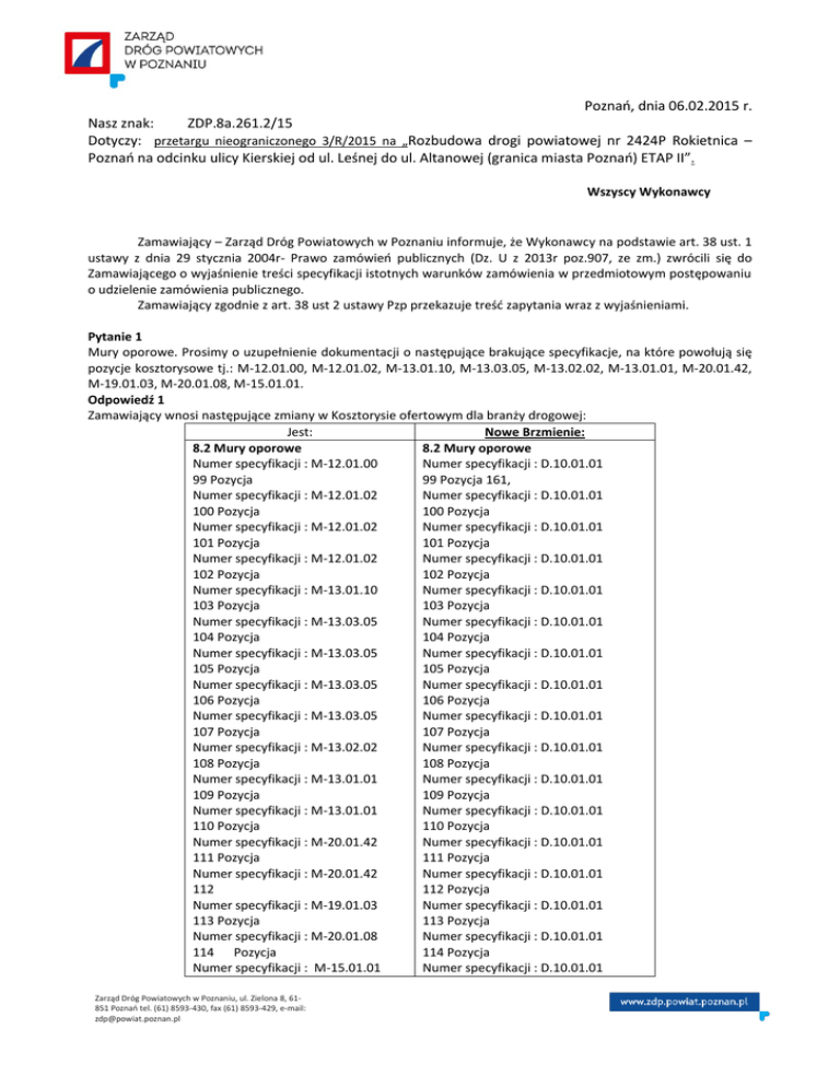 Poznań, dnia 06.02.2015 r. Nasz znak: ZDP.8a.261.2/15 Dotyczy: przetargu nieograniczonego 3/R/2015 na „Rozbudowa drogi powiatowej nr 2424P Rokietnica – Poznań na odcinku ulicy Kierskiej od ul. Leśnej do ul. Altanowej (granica miasta Poznań) ETAP II”. Wszyscy Wykonawcy Zamawiający – Zarząd Dróg Powiatowych w Poznaniu informuje, że Wykonawcy na podstawie art. 38 ust. 1 ustawy z dnia 29 stycznia 2004r- Prawo zamówień publicznych (Dz. U z 2013r poz.907, ze zm.) zwrócili się do Zamawiającego o wyjaśnienie treści specyfikacji istotnych warunków zamówienia w przedmiotowym postępowaniu o udzielenie zamówienia publicznego. Zamawiający zgodnie z art. 38 ust 2 ustawy Pzp przekazuje treść zapytania wraz z wyjaśnieniami. Pytanie 1 Mury oporowe. Prosimy o uzupełnienie dokumentacji o następujące brakujące specyfikacje, na które powołują się pozycje kosztorysowe tj.: M-12.01.00, M-12.01.02, M-13.01.10, M-13.03.05, M-13.02.02, M-13.01.01, M-20.01.42, M-19.01.03, M-20.01.08, M-15.01.01. Odpowiedź 1 Zamawiający wnosi następujące zmiany w Kosztorysie ofertowym dla branży drogowej: Jest: Nowe Brzmienie: 8.2 Mury oporowe 8.2 Mury oporowe Numer specyfikacji : M-12.01.00 Numer specyfikacji : D.10.01.01 99 Pozycja 99 Pozycja 161, Numer specyfikacji : M-12.01.02 Numer specyfikacji : D.10.01.01 100 Pozycja 100 Pozycja Numer specyfikacji : M-12.01.02 Numer specyfikacji : D.10.01.01 101 Pozycja 101 Pozycja Numer specyfikacji : M-12.01.02 Numer specyfikacji : D.10.01.01 102 Pozycja 102 Pozycja Numer specyfikacji : M-13.01.10 Numer specyfikacji : D.10.01.01 103 Pozycja 103 Pozycja Numer specyfikacji : M-13.03.05 Numer specyfikacji : D.10.01.01 104 Pozycja 104 Pozycja Numer specyfikacji : M-13.03.05 Numer specyfikacji : D.10.01.01 105 Pozycja 105 Pozycja Numer specyfikacji : M-13.03.05 Numer specyfikacji : D.10.01.01 106 Pozycja 106 Pozycja Numer specyfikacji : M-13.03.05 Numer specyfikacji : D.10.01.01 107 Pozycja 107 Pozycja Numer specyfikacji : M-13.02.02 Numer specyfikacji : D.10.01.01 108 Pozycja 108 Pozycja Numer specyfikacji : M-13.01.01 Numer specyfikacji : D.10.01.01 109 Pozycja 109 Pozycja Numer specyfikacji : M-13.01.01 Numer specyfikacji : D.10.01.01 110 Pozycja 110 Pozycja Numer specyfikacji : M-20.01.42 Numer specyfikacji : D.10.01.01 111 Pozycja 111 Pozycja Numer specyfikacji : M-20.01.42 Numer specyfikacji : D.10.01.01 112 112 Pozycja Numer specyfikacji : M-19.01.03 Numer specyfikacji : D.10.01.01 113 Pozycja 113 Pozycja Numer specyfikacji : M-20.01.08 Numer specyfikacji : D.10.01.01 114 Pozycja 114 Pozycja Numer specyfikacji : M-15.01.01 Numer specyfikacji : D.10.01.01 Zarząd Dróg Powiatowych w Poznaniu, ul. Zielona 8, 61851 Poznań tel. (61) 8593-430, fax (61) 8593-429, e-mail: [email protected] Pytanie 2 Mury oporowe. Prosimy o jednoznaczne określenie jakiej klasy jest warstwa podbetonu, gdyż na rysunku znajduje się informacja o betonie B10, a zapis specyfikacji technicznej D.10.01.01 wskazuje beton B15. Odpowiedź 2 Należy uwzględnić warstwę betonu z B15 (C12/15). Pytanie 3 Mury oporowe. Prosimy o jednoznaczne określenie czy płyta betonowa ma wymiary wg rysunku 205x40x9 czy 200x40x9 wg specyfikacji technicznej D.10.01.01. Odpowiedź 3 Dla muru oporowego M-10 prefabrykaty 200x50x5, mury M11-M13 prefabrykaty 205x40x9 jak w kosztorysie ofertowym. Jednocześnie Zamawiający modyfikuje zapis STWIORB D.10.01.01 w następujący sposób: Jest: Nowe Brzmienie: 1.3. Zakres robót objętych STWiORB 1.3. Zakres robót objętych STWiORB Ustalenia zawarte w niniejszej specyfikacji dotyczą zasad Ustalenia zawarte w niniejszej specyfikacji dotyczą prowadzenia robót związanych z wykonaniem muru zasad prowadzenia robót związanych z wykonaniem oporowego z żelbetu i obejmują: muru oporowego z żelbetu i obejmują: wykonanie wykopów oraz ich zasypanie wraz z transportem nadmiaru gruntu na składowisko Wykonawcy ułożenie warstwy podbetonu B15 montaż słupów stalowych HEB 120, L=200 cm montaż słupów stalowych HEB 120, L=375 cm montaż słupów prefabrykowanych betonowych L=125cm montaż płyt prefabrykowanych żelbetowych 200×40×9 cm elementy muru montaż płyt prefabrykowanych żelbetowych 200×50×5 cm elementy muru montaż płyt prefabrykowanych żelbetowych 100×50×5 cm elementy muru montaż zbrojenia gzymsów stalą klasy A-IIIN wykonanie gzymsów z betonu B25 w deskowaniu montaż balustrad stalowych z płaskowników wraz z mocowaniem za pomocą kotew wklejanych wykonanie warstwy torkretu gr. 3-4cm na murach oporowych, zbrojonego siatką z 10×10 cm z mocowaniem do prętów wklejanych w beton wykonanie izolacji powierzchni odziemnych muru oporowego wraz z ręcznym oczyszczeniem powierzchni poprzez dwukrotne posmarowanie materiałem powłokowym do izolacji na zimno wraz z zagruntowaniem oczyszczenie ręczne i przygotowanie (odtłuszczenie) powierzchni betonowych oraz zabezpieczenie antykorozyjne powierzchni betonowych - malowanie farbą akrylową powierzchni zewnętrznych muru wykonanie wykopów oraz ich zasypanie wraz z transportem nadmiaru gruntu na składowisko Wykonawcy ułożenie warstwy podbetonu B15 montaż słupów stalowych HEB 120, L=200 cm montaż słupów stalowych HEB 120, L=375 cm montaż słupów prefabrykowanych betonowych L=125cm montaż płyt prefabrykowanych żelbetowych 205×40×9 cm elementy muru montaż płyt prefabrykowanych żelbetowych 200×50×5 cm elementy muru montaż płyt prefabrykowanych żelbetowych 100×40×9 cm elementy muru montaż zbrojenia gzymsów stalą klasy A-IIIN wykonanie gzymsów z betonu B25 w deskowaniu montaż balustrad stalowych z płaskowników wraz z mocowaniem za pomocą kotew wklejanych wykonanie warstwy torkretu gr. 3-4cm na murach oporowych, zbrojonego siatką z 10×10 cm z mocowaniem do prętów wklejanych w beton wykonanie izolacji powierzchni odziemnych muru oporowego wraz z ręcznym oczyszczeniem powierzchni poprzez dwukrotne posmarowanie materiałem powłokowym do izolacji na zimno wraz 