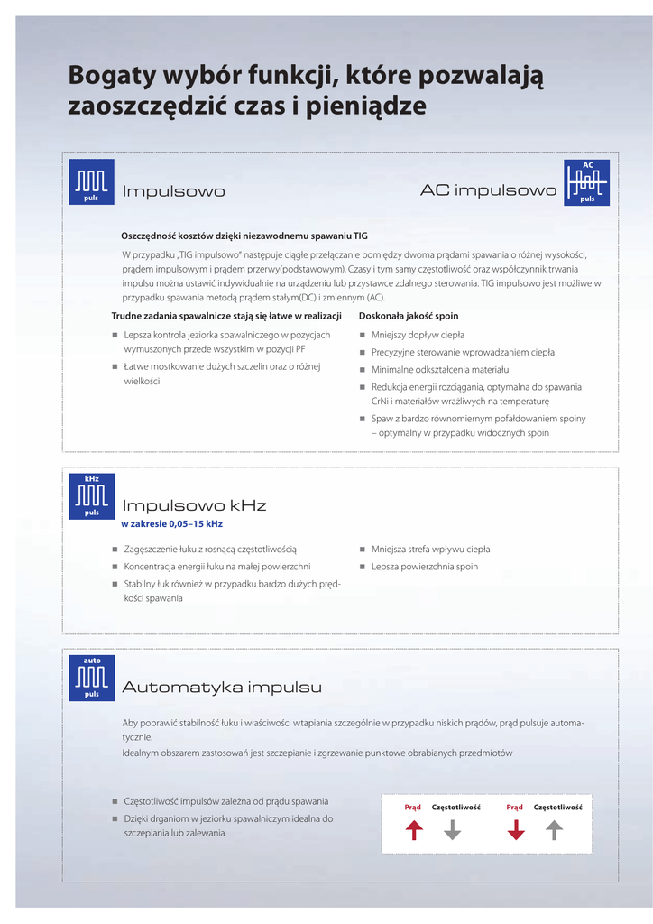 Bogaty wybór funkcji, które pozwalają zaoszczędzić czas i pieniądze AC impulsowo Impulsowo Oszczędność kosztów dzięki niezawodnemu spawaniu TIG W przypadku „TIG impulsowo“ następuje ciągłe przełączanie pomiędzy dwoma prądami spawania o różnej wysokości, prądem impulsowym i prądem przerwy(podstawowym). Czasy i tym samy częstotliwość oraz współczynnik trwania impulsu można ustawić indywidualnie na urządzeniu lub przystawce zdalnego sterowania. TIG impulsowo jest możliwe w przypadku spawania metodą prądem stałym(DC) i zmiennym (AC). Trudne zadania spawalnicze stają się łatwe w realizacji Doskonała jakość spoin Lepsza kontrola jeziorka spawalniczego w pozycjach Mniejszy dopływ ciepła wymuszonych przede wszystkim w pozycji PF Łatwe mostkowanie dużych szczelin oraz o różnej wielkości Precyzyjne sterowanie wprowadzaniem ciepła Minimalne odkształcenia materiału Redukcja energii rozciągania, optymalna do spawania CrNi i materiałów wrażliwych na temperaturę Spaw z bardzo równomiernym pofałdowaniem spoiny – optymalny w przypadku widocznych spoin Impulsowo kHz w zakresie 0,05–15 kHz Zagęszczenie łuku z rosnącą częstotliwością Mniejsza strefa wpływu ciepła Koncentracja energii łuku na małej powierzchni Lepsza powierzchnia spoin Stabilny łuk również w przypadku bardzo dużych pręd- kości spawania Automatyka impulsu Aby poprawić stabilność łuku i właściwości wtapiania szczególnie w przypadku niskich prądów, prąd pulsuje automatycznie. Idealnym obszarem zastosowań jest szczepianie i zgrzewanie punktowe obrabianych przedmiotów Częstotliwość impulsów zależna od prądu spawania Dzięki drganiom w jeziorku spawalniczym idealna do szczepiania lub zalewania Prąd Częstotliwość Prąd Częstotliwość